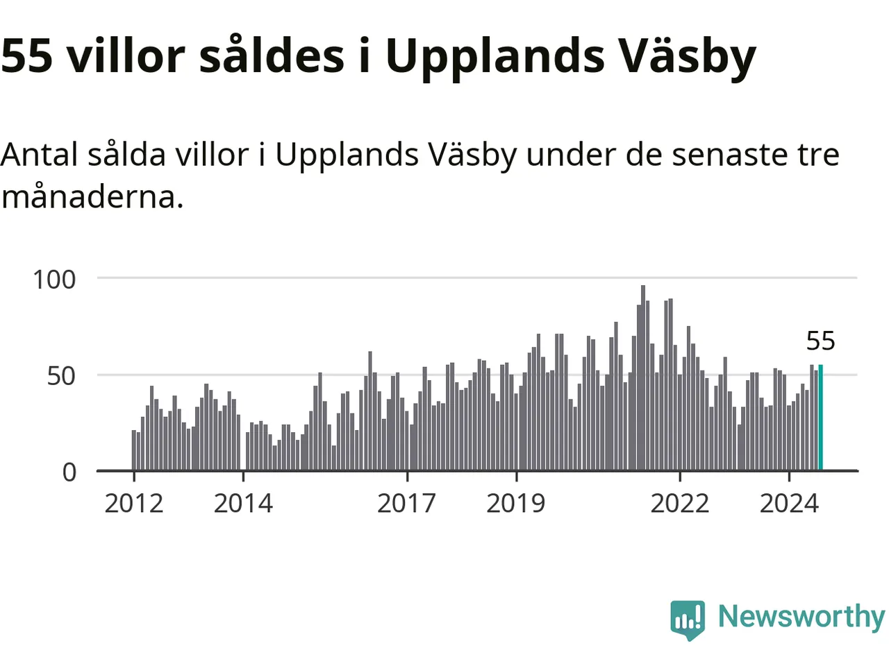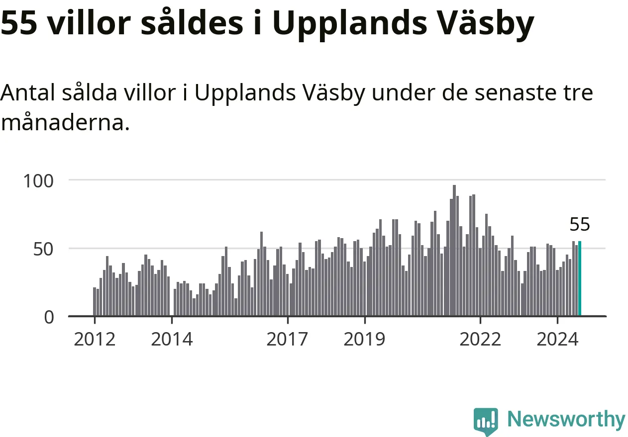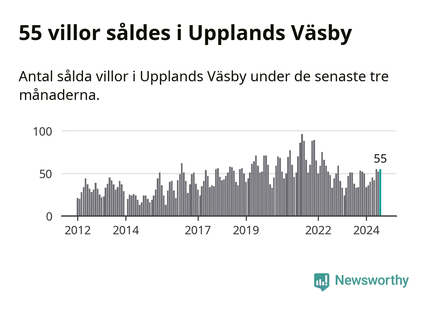 Mellan juni och augusti såldes 55 villor i Upplands Väsby kommun. Det är relativt många sett till aktiviteten på bostadsmarknaden i kommunen under de senaste tolv månaderna, samt det historiska snittet för den här tiden på året.