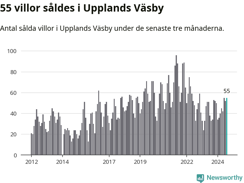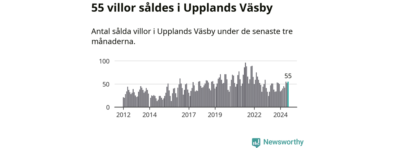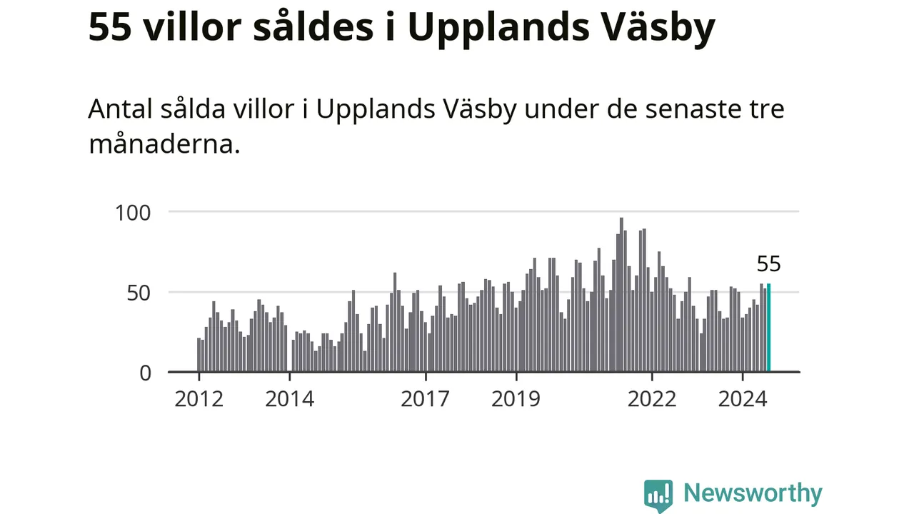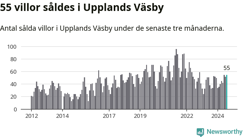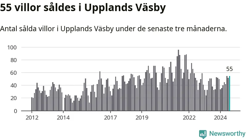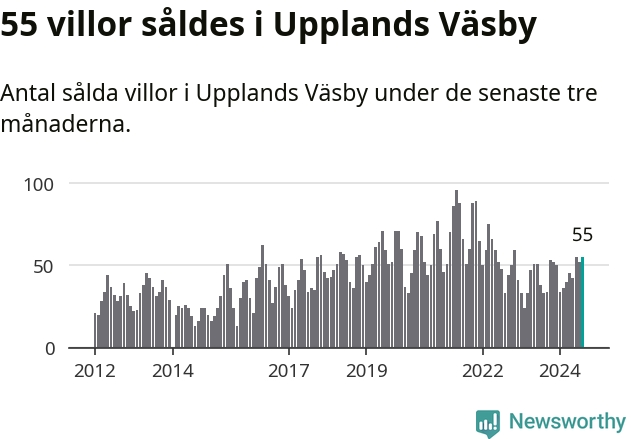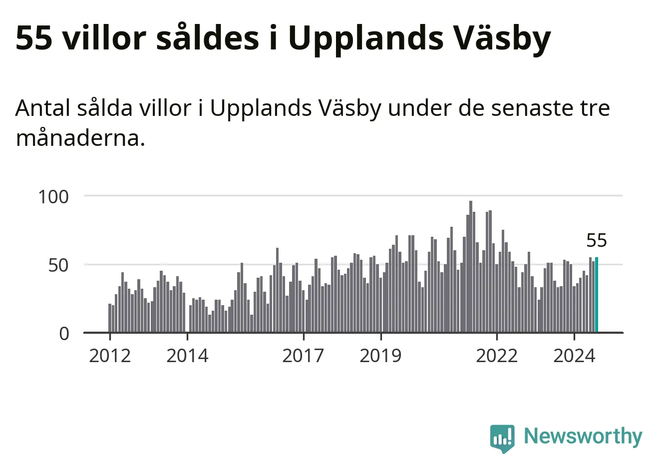 Mellan juni och augusti såldes 55 villor i Upplands Väsby kommun. Det är relativt många sett till aktiviteten på bostadsmarknaden i kommunen under de senaste tolv månaderna, samt det historiska snittet för den här tiden på året.