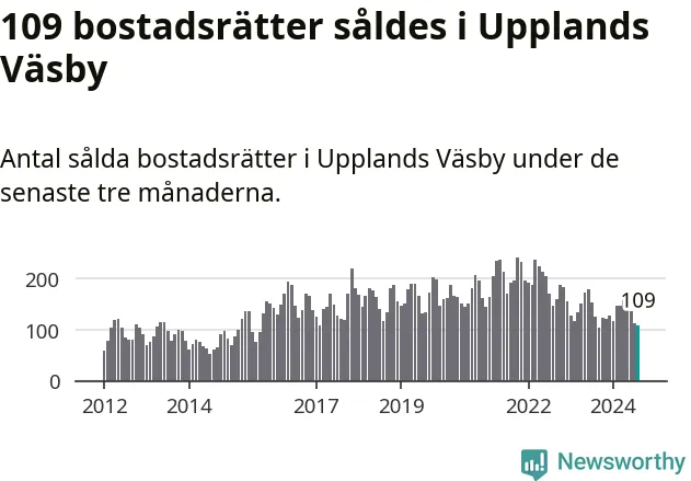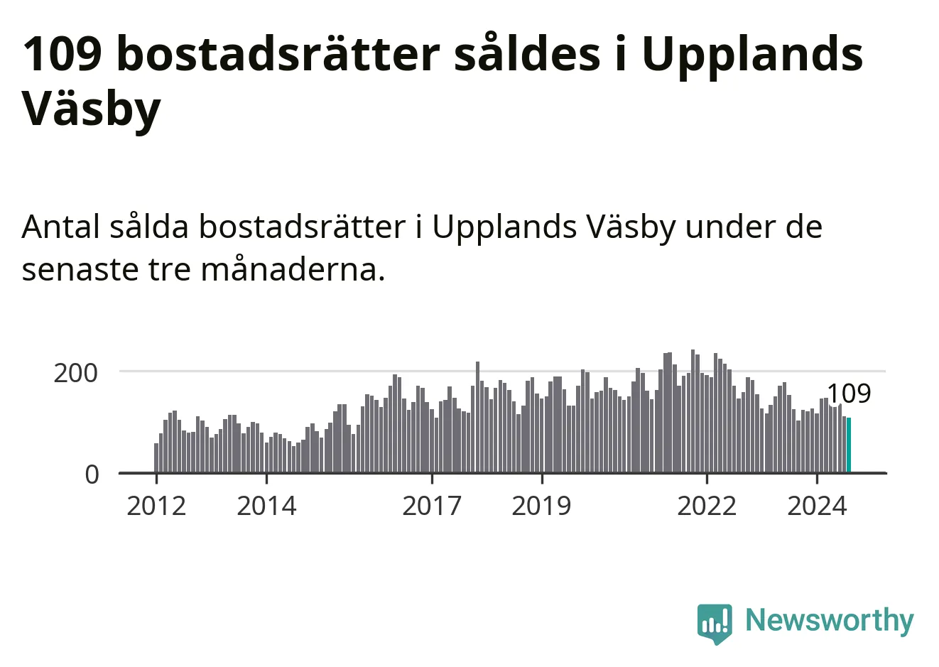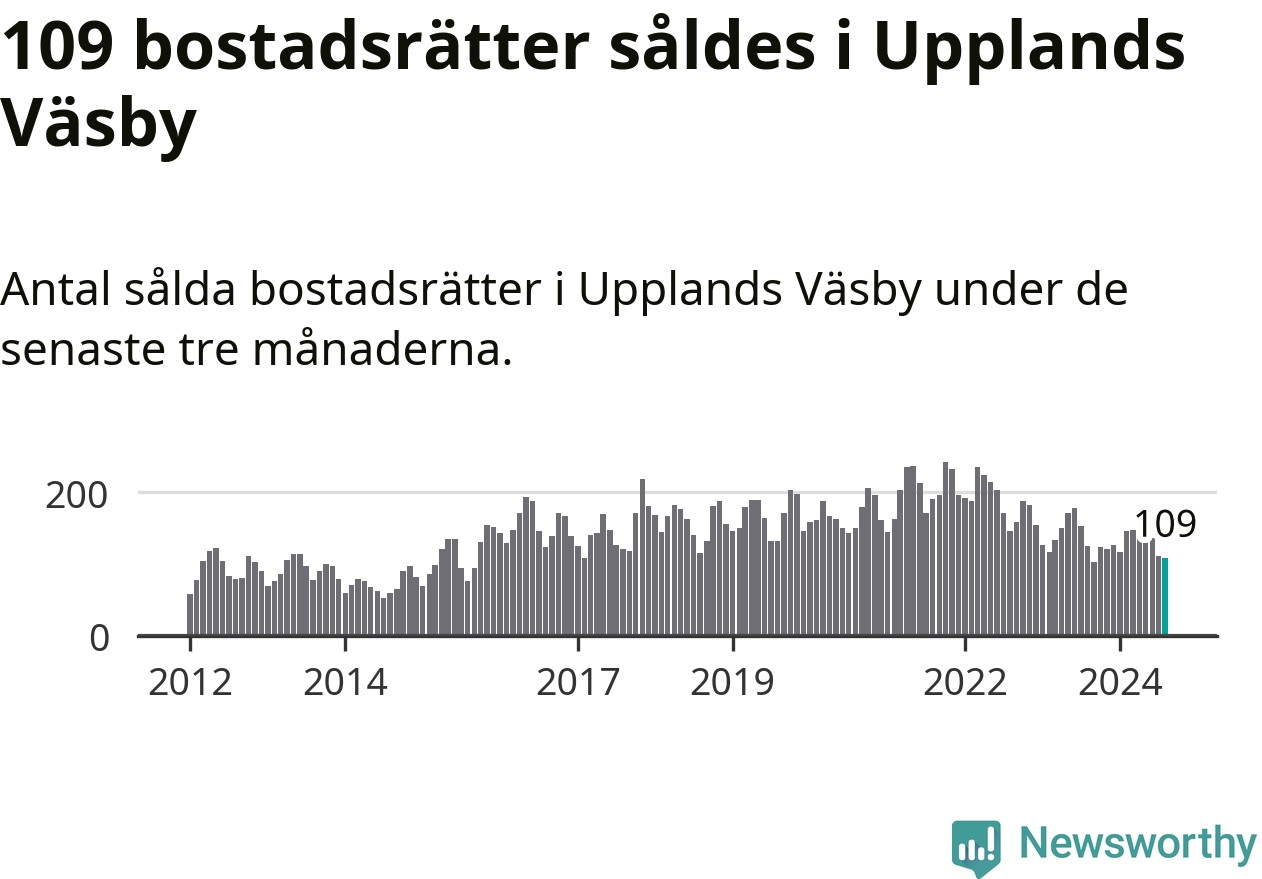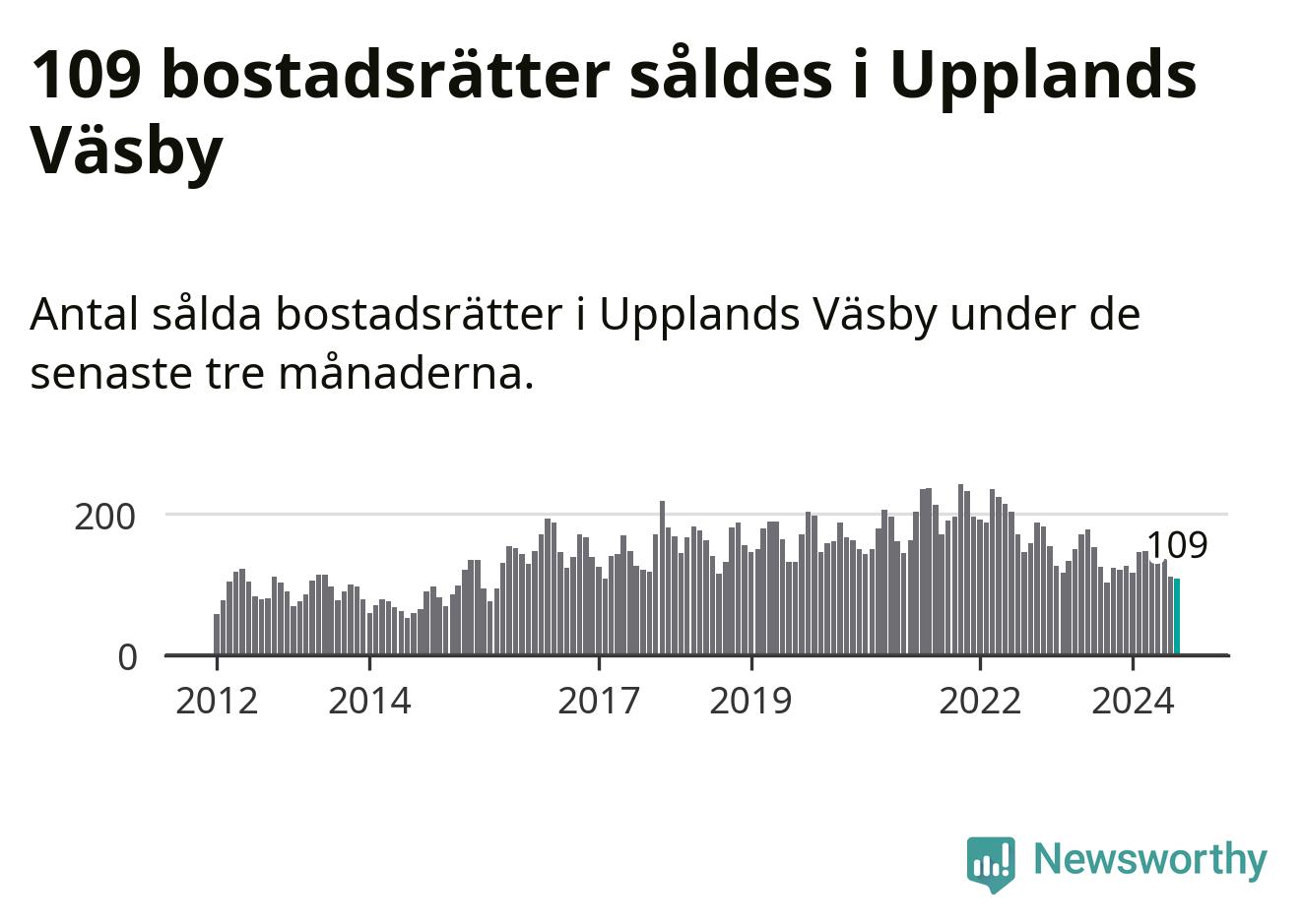 Sammanlagt såldes 109 bostadsrätter i Upplands Väsby kommun mellan juni och augusti till ett genomsnittligt pris på 2,1 miljoner kronor. I fjol gjordes 125 affärer vid den här tiden på året.