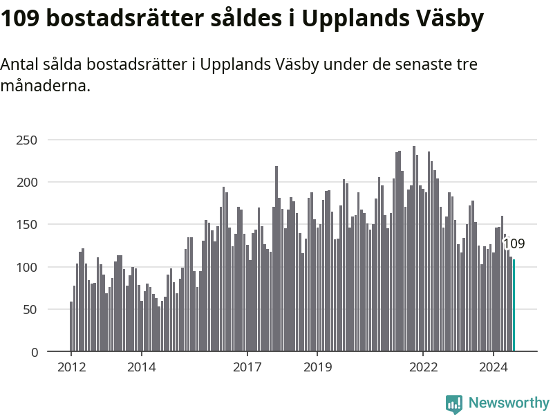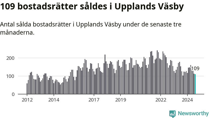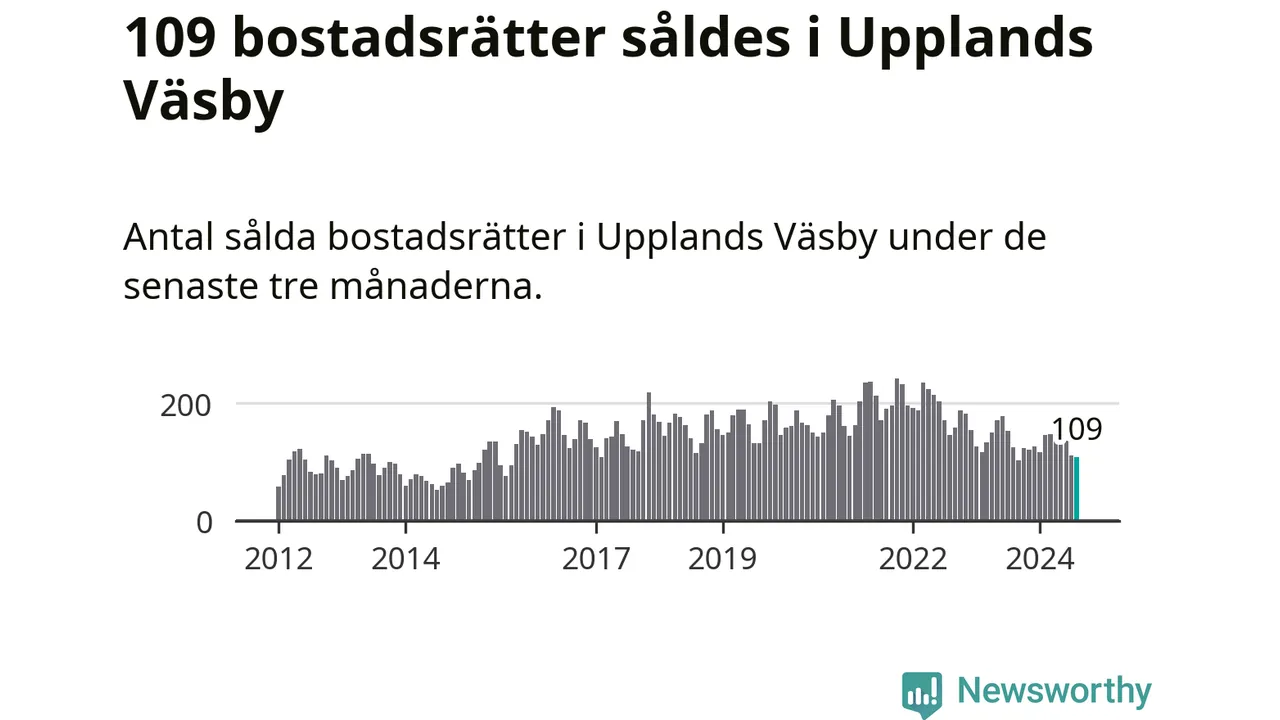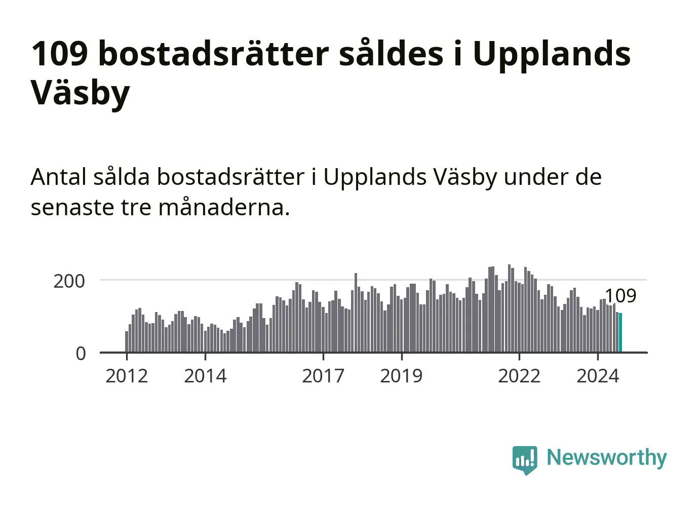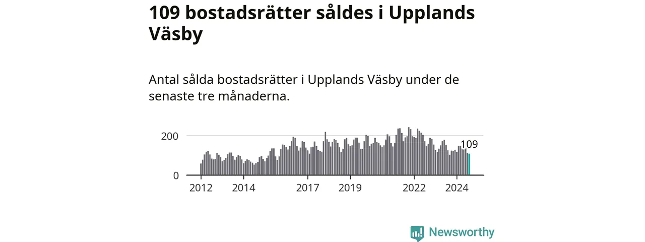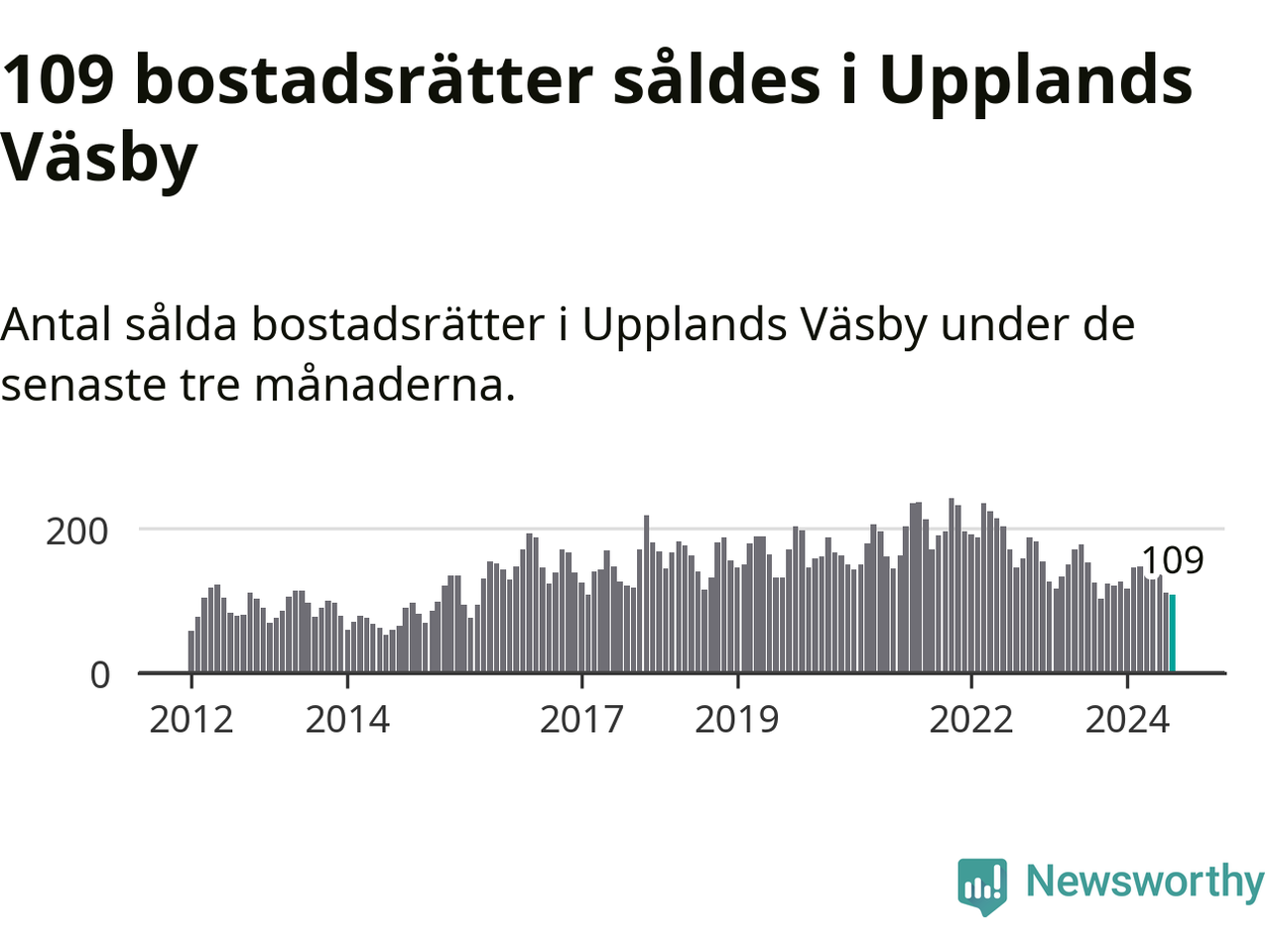 Sammanlagt såldes 109 bostadsrätter i Upplands Väsby kommun mellan juni och augusti till ett genomsnittligt pris på 2,1 miljoner kronor. I fjol gjordes 125 affärer vid den här tiden på året.