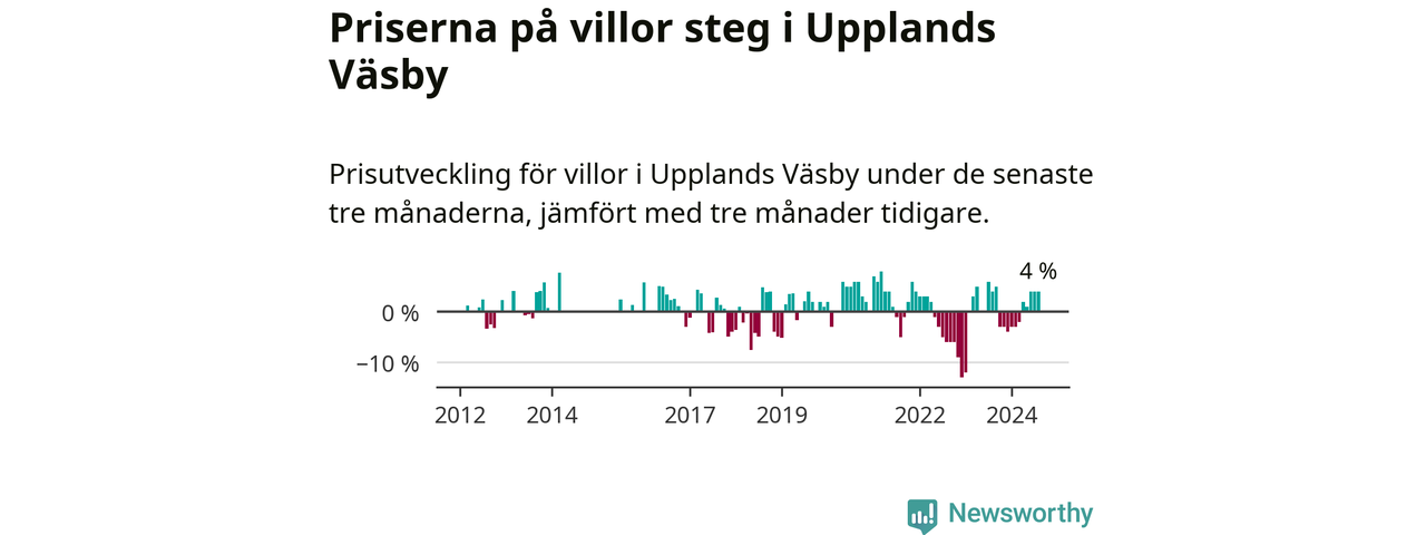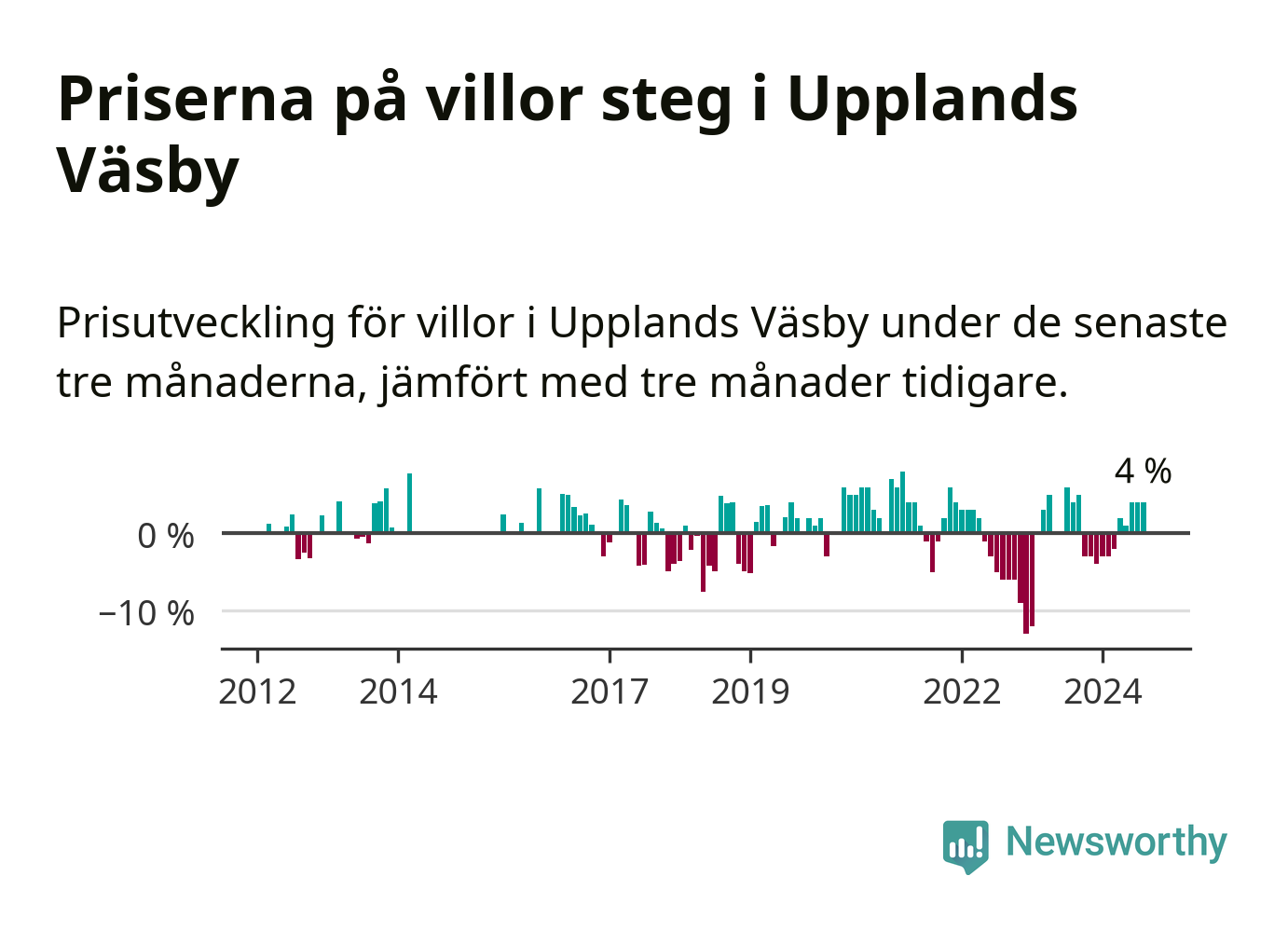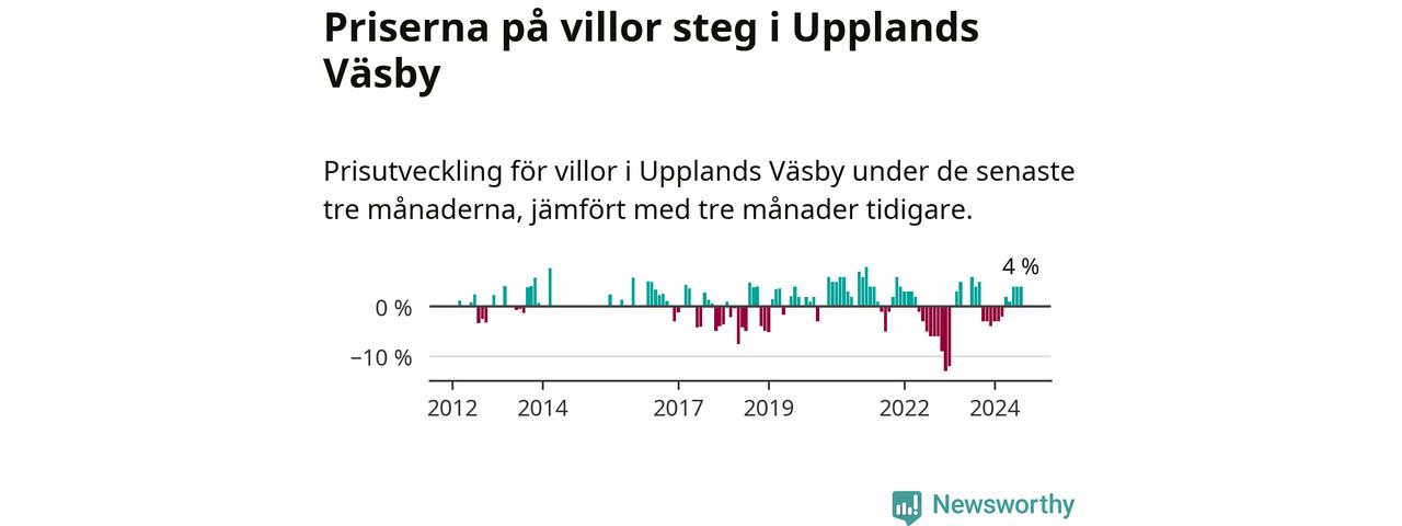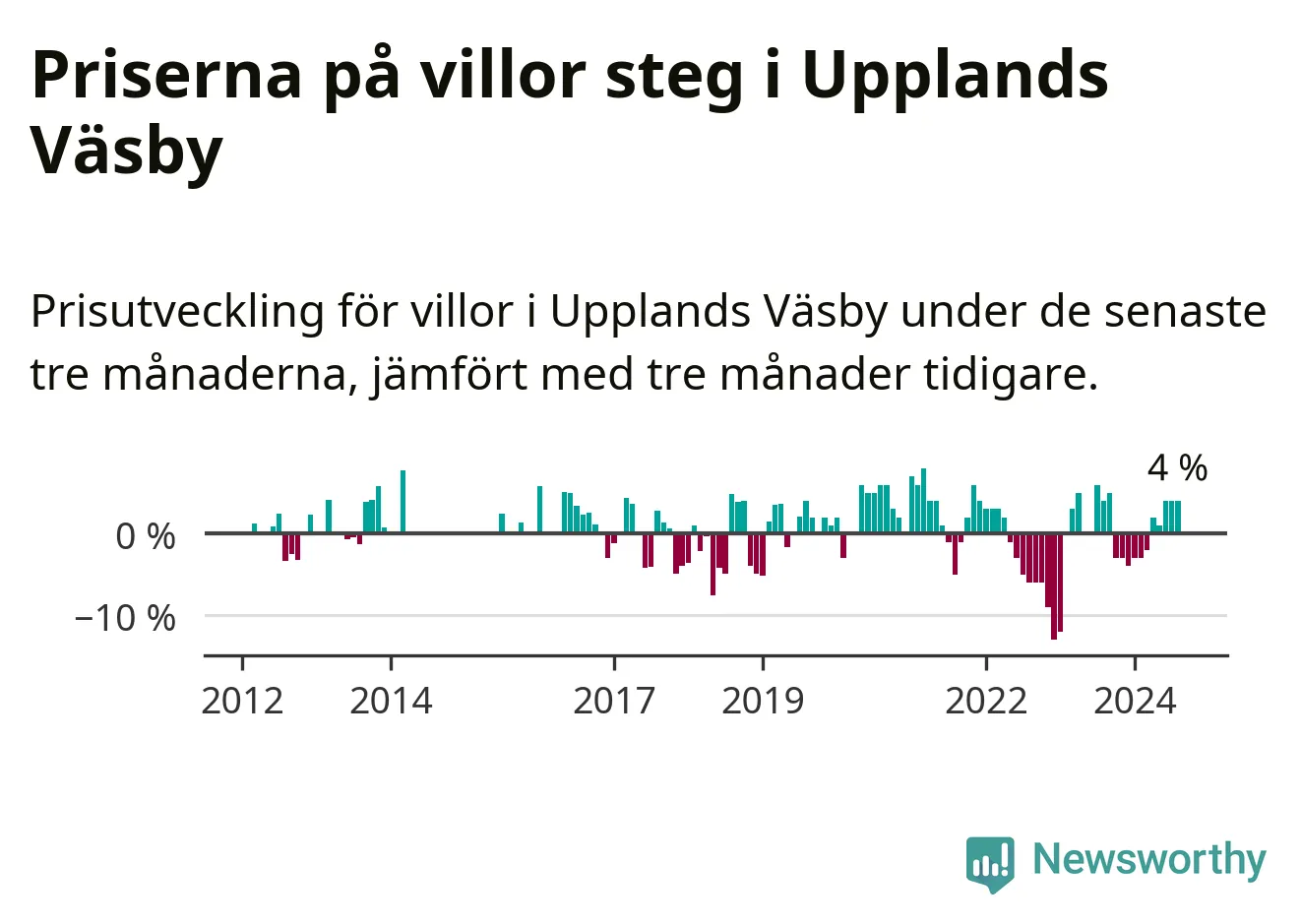 Statistiken visar även på en kännbar prisuppgång i Upplands Väsby kommun. Medelpriset på försäljningarna av villor i kommunen var 4 procent högre än för tre månader sedan. I hela Stockholms län däremot ligger villapriserna stilla.