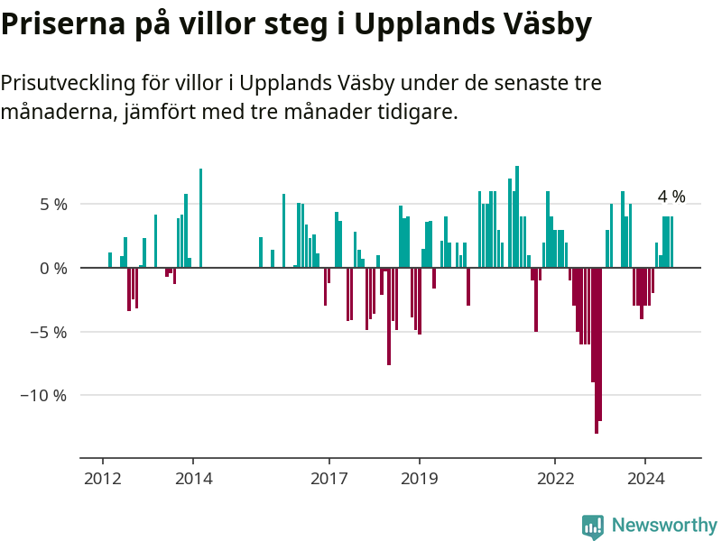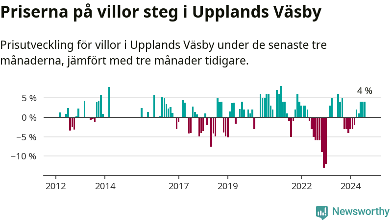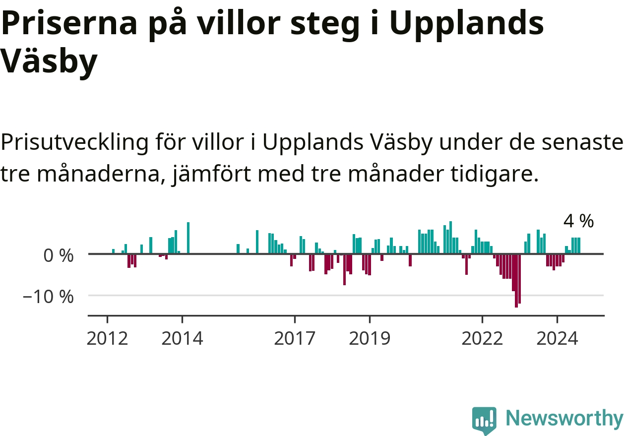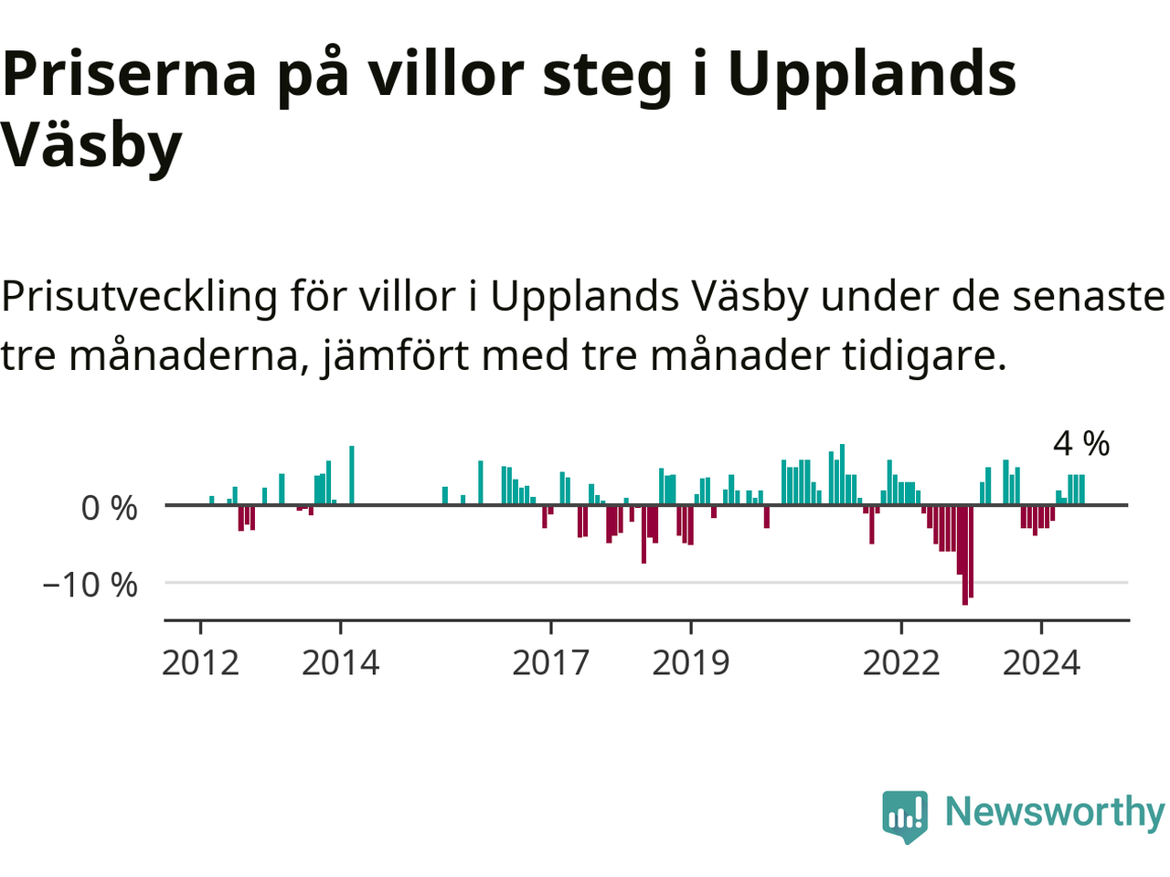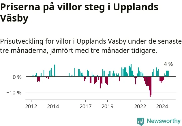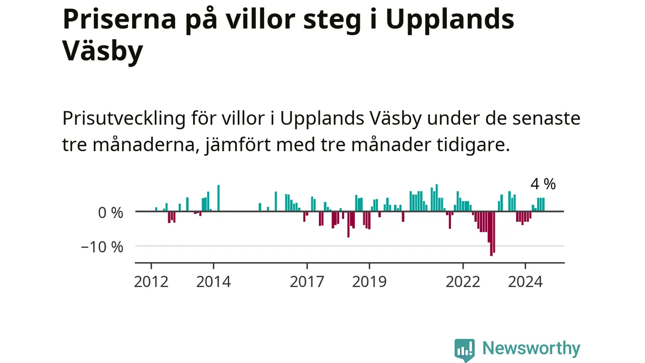 Statistiken visar även på en kännbar prisuppgång i Upplands Väsby kommun. Medelpriset på försäljningarna av villor i kommunen var 4 procent högre än för tre månader sedan. I hela Stockholms län däremot ligger villapriserna stilla.