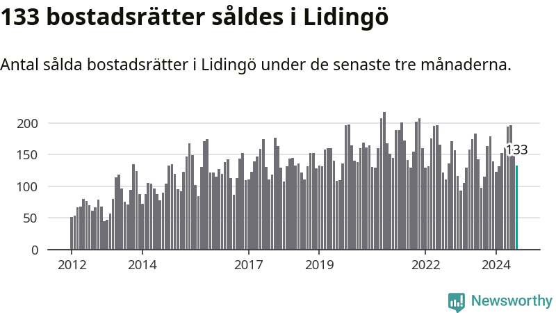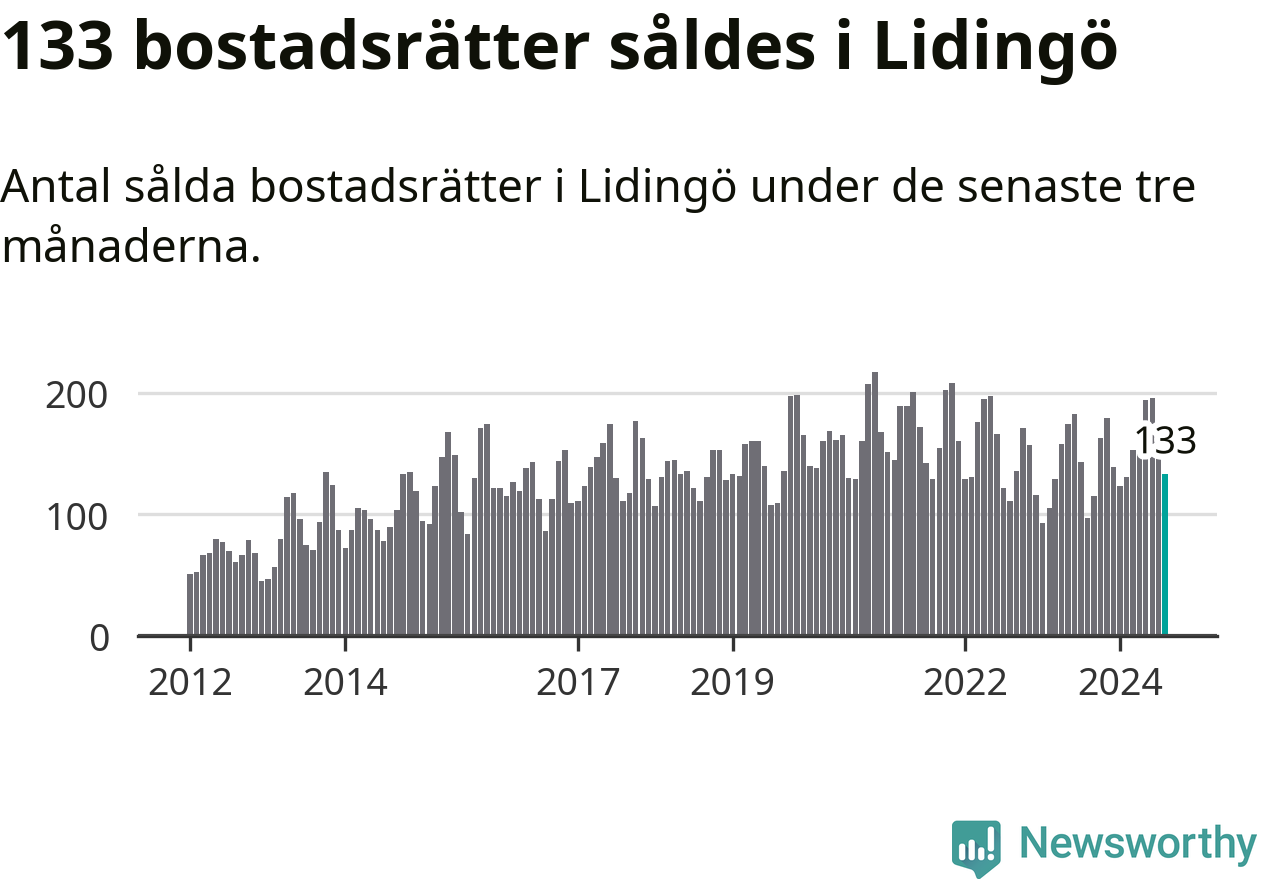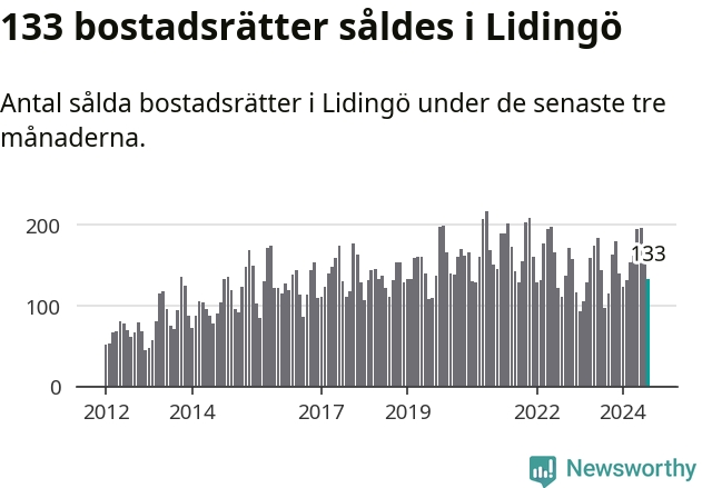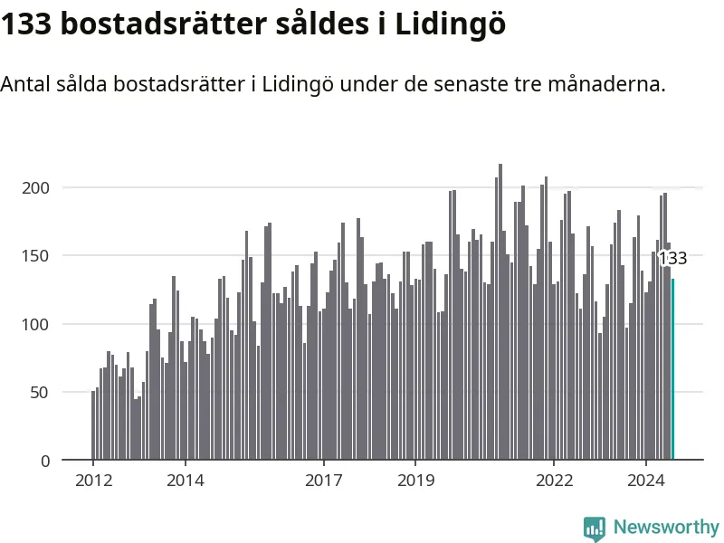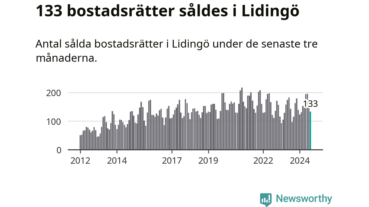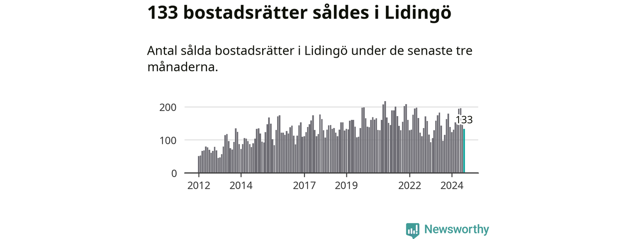 Sammanlagt såldes 133 bostadsrätter i Lidingö kommun mellan juni och augusti till ett genomsnittligt pris på 4,7 miljoner kronor. I fjol gjordes 97 affärer vid den här tiden på året.