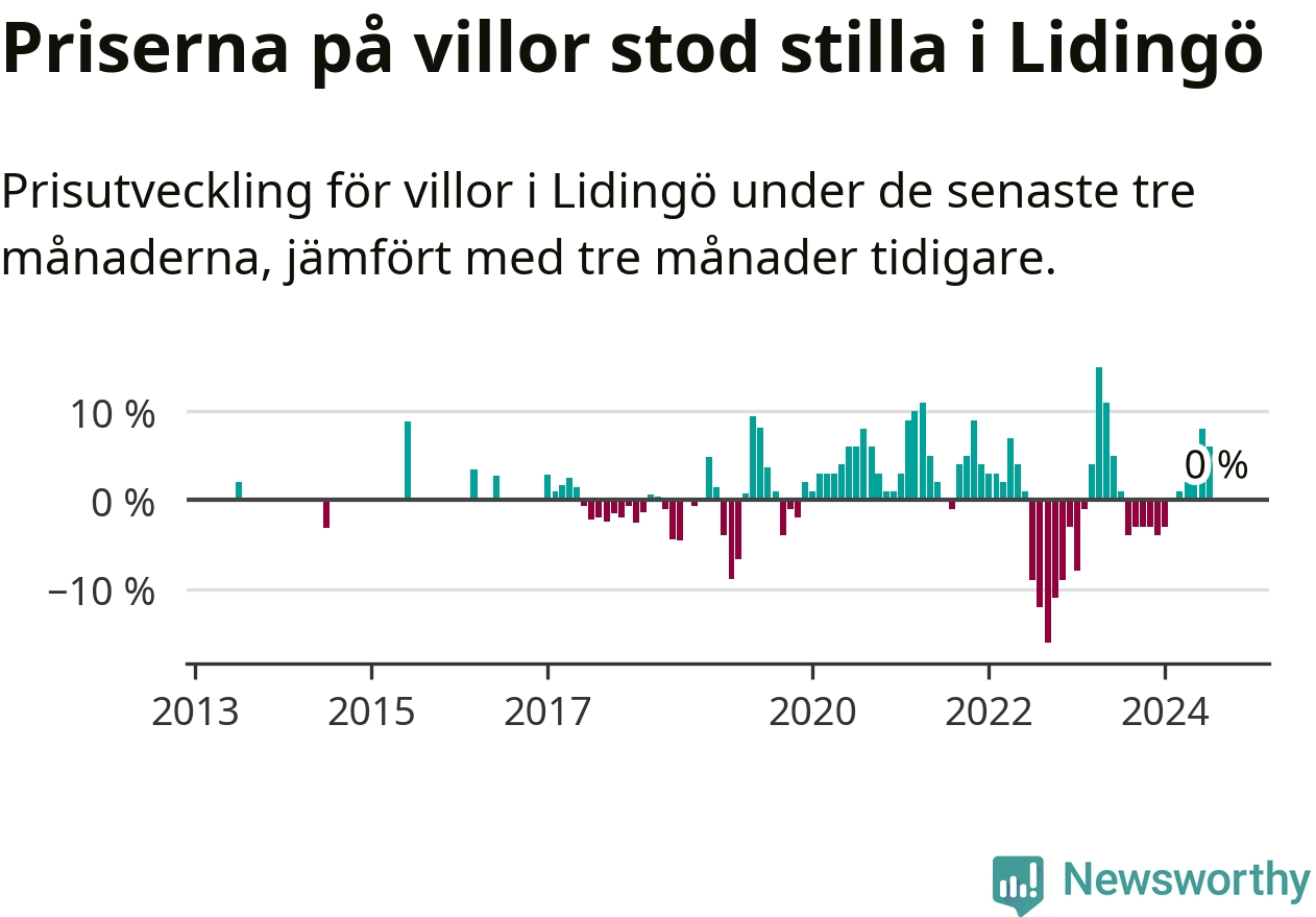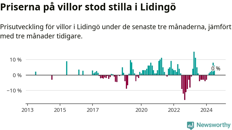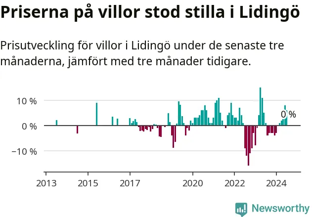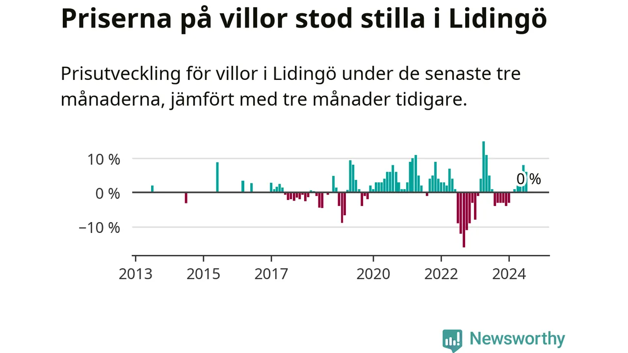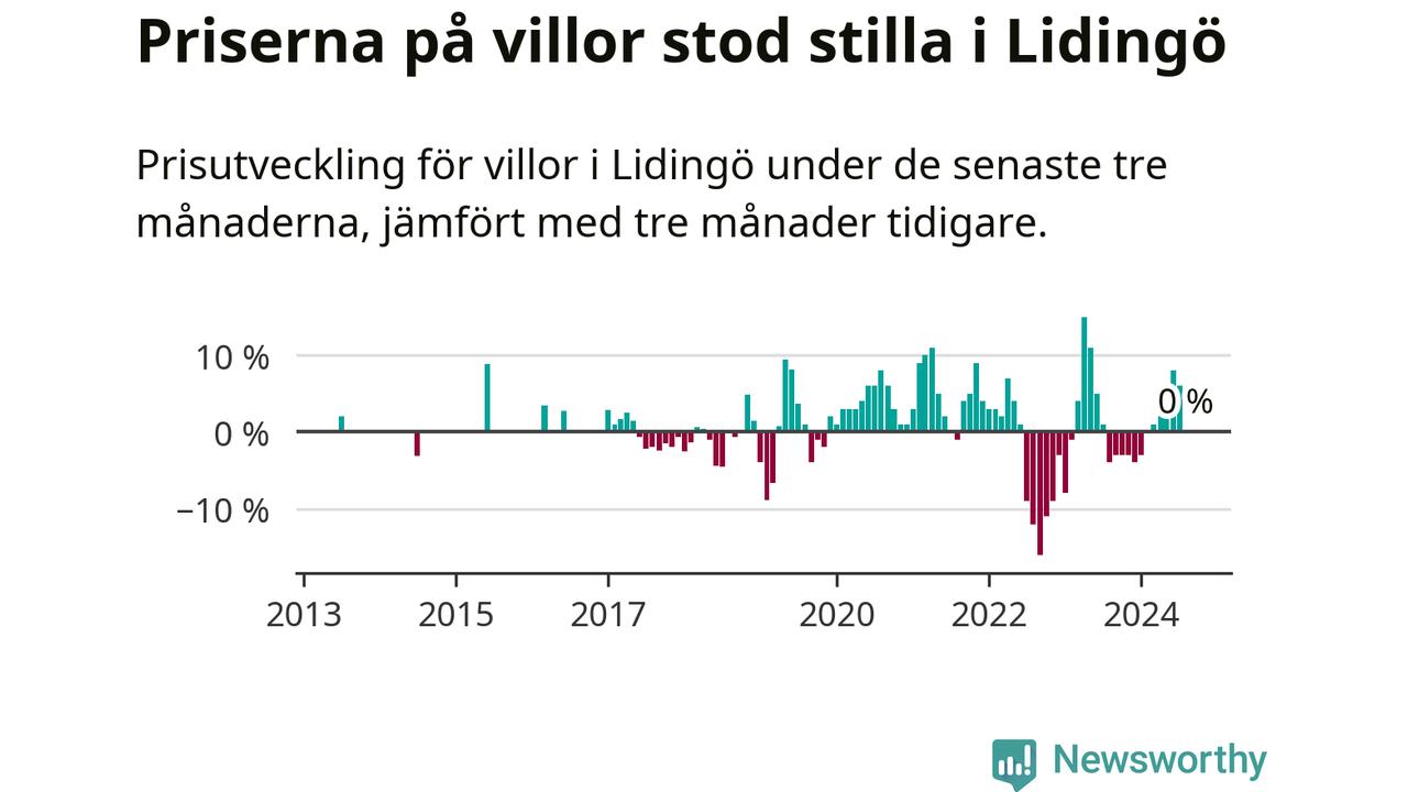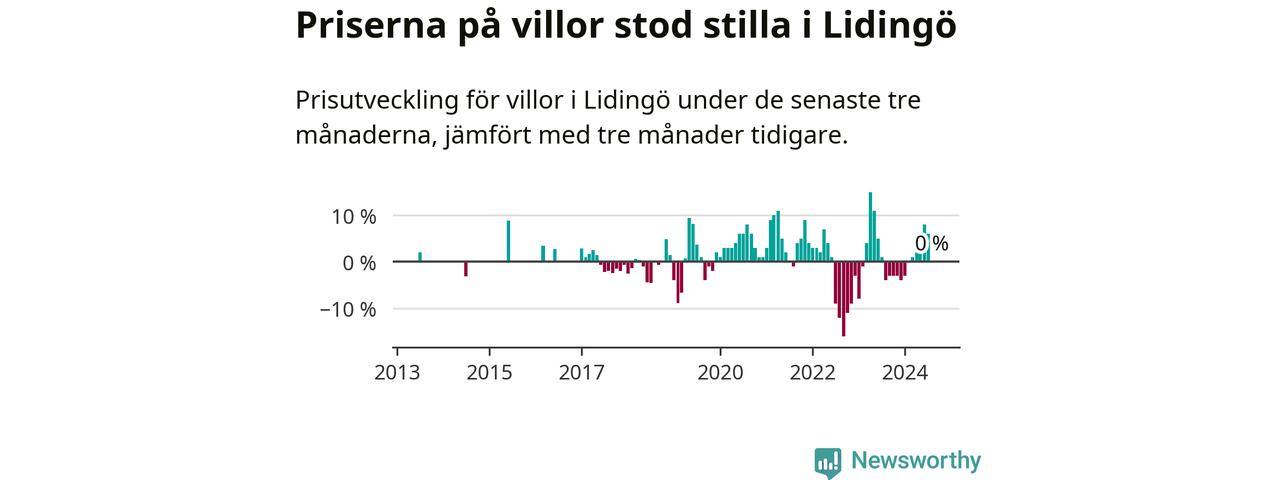 Villapriserna står i stort sett stilla i Lidingö kommun. Medelpriset på de på försäljningarna under de senaste tre månaderna låg på samma nivå som för tre månader sedan.