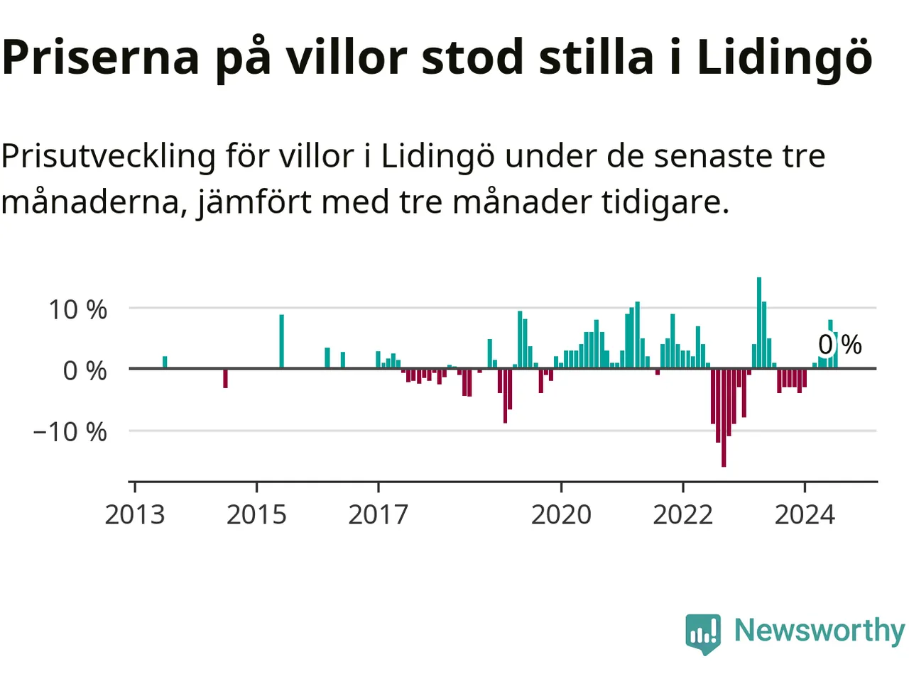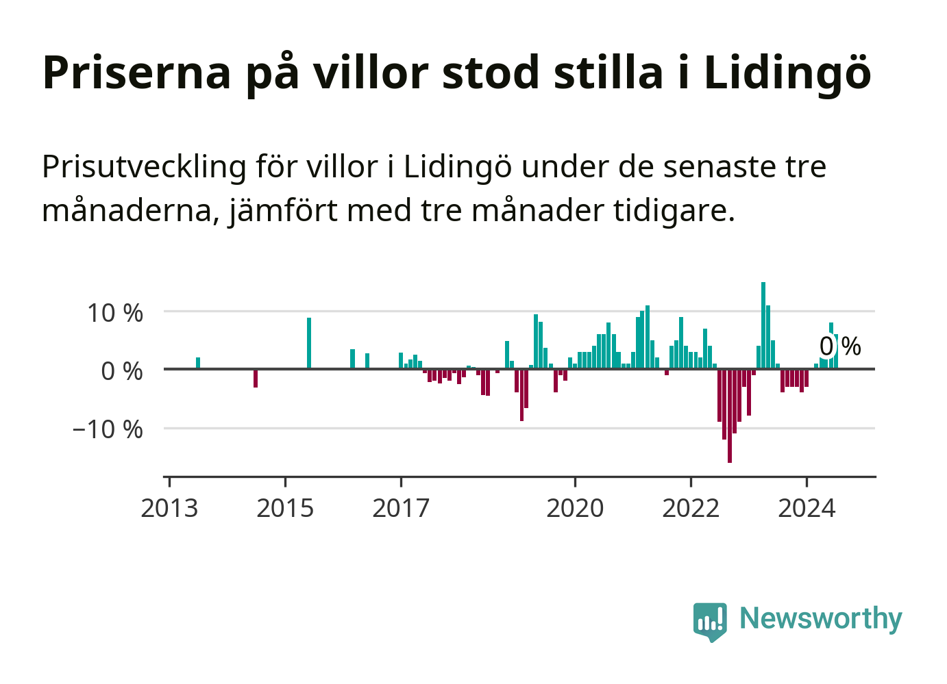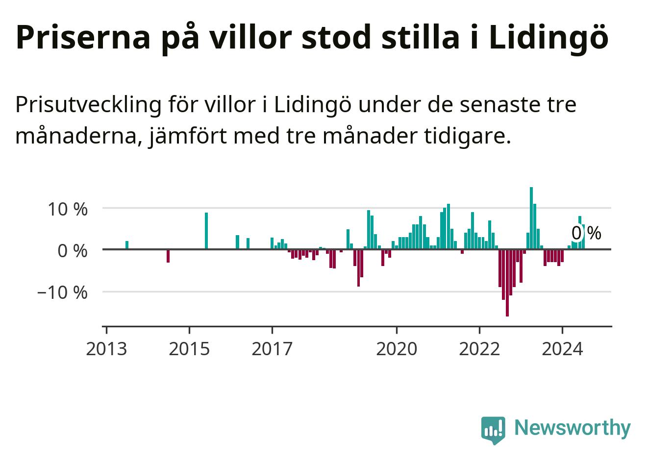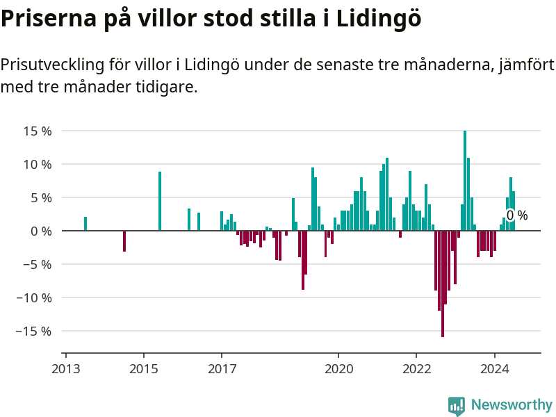Villapriserna står i stort sett stilla i Lidingö kommun. Medelpriset på de på försäljningarna under de senaste tre månaderna låg på samma nivå som för tre månader sedan.