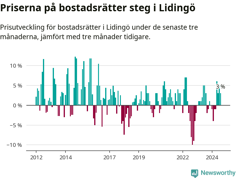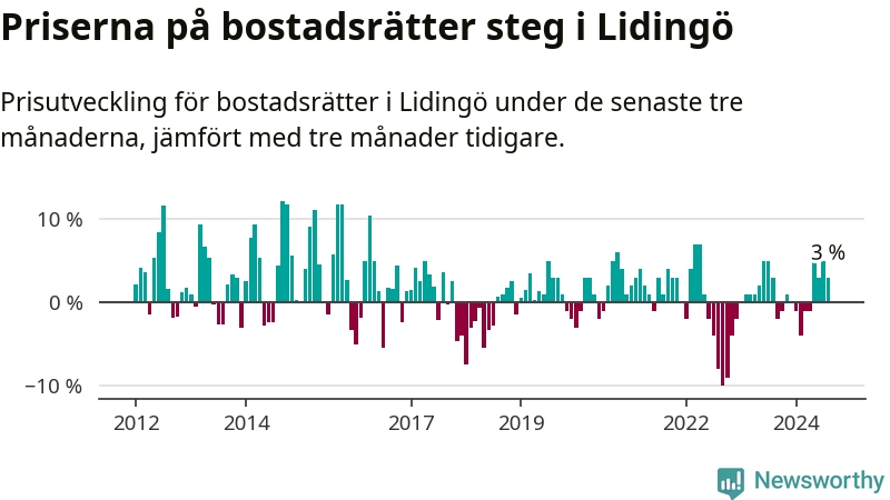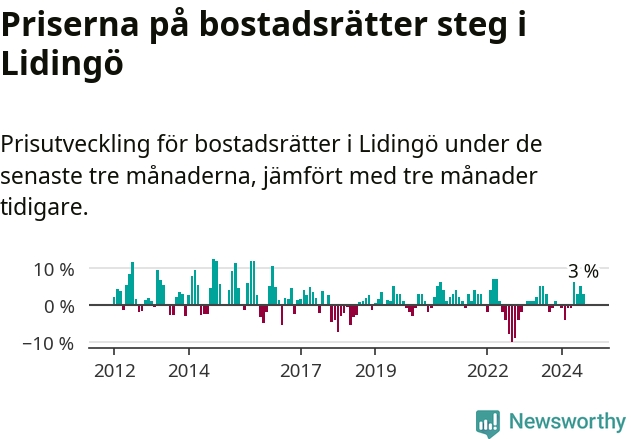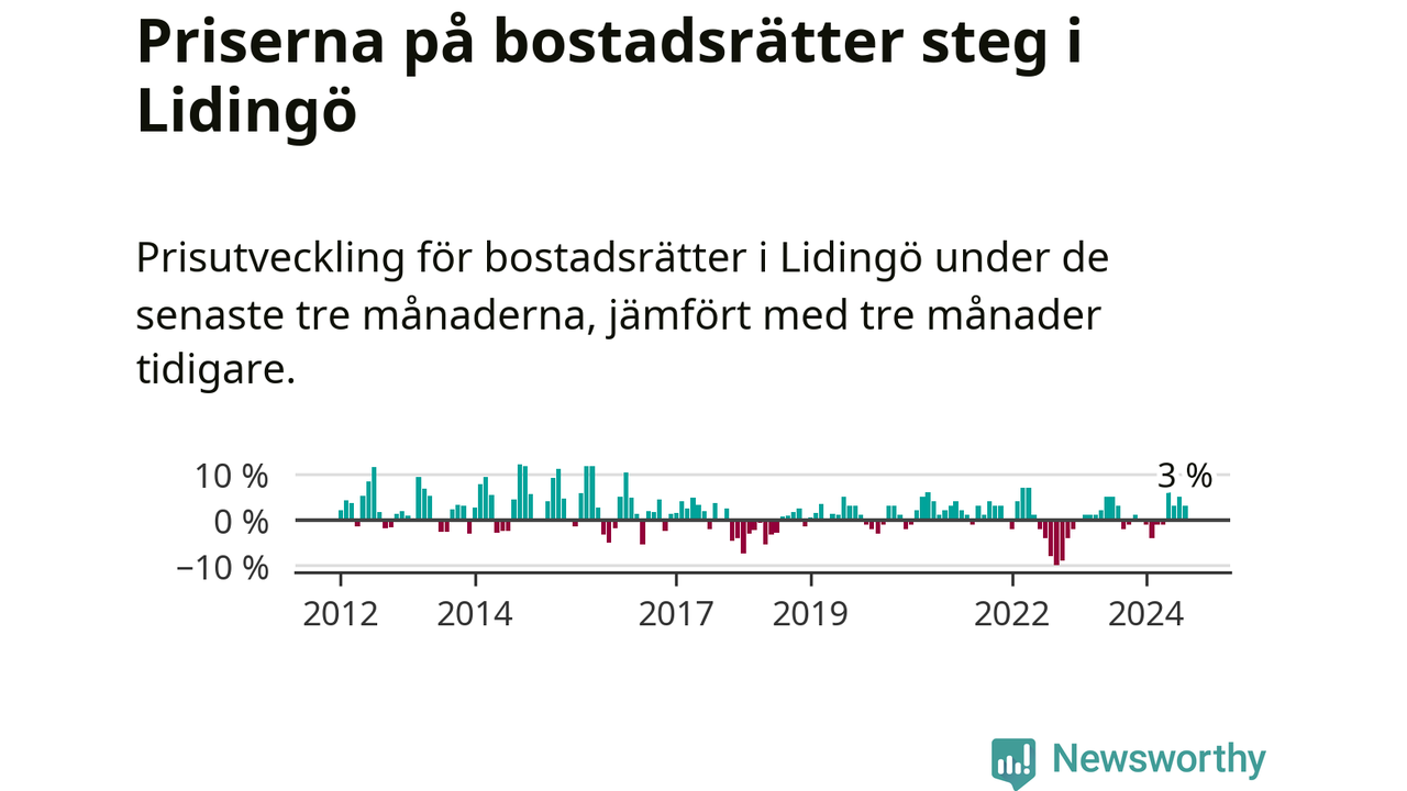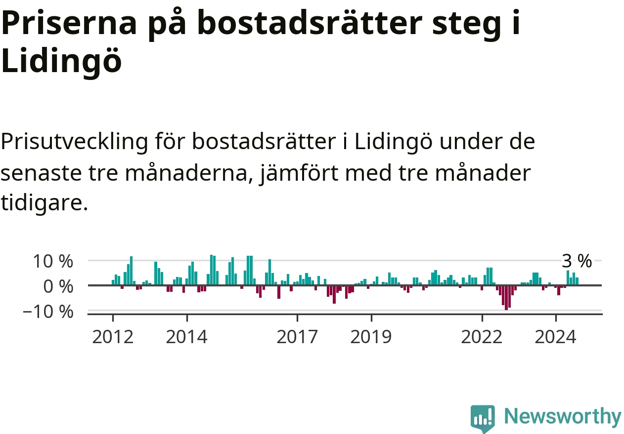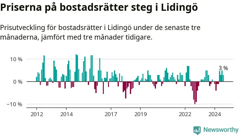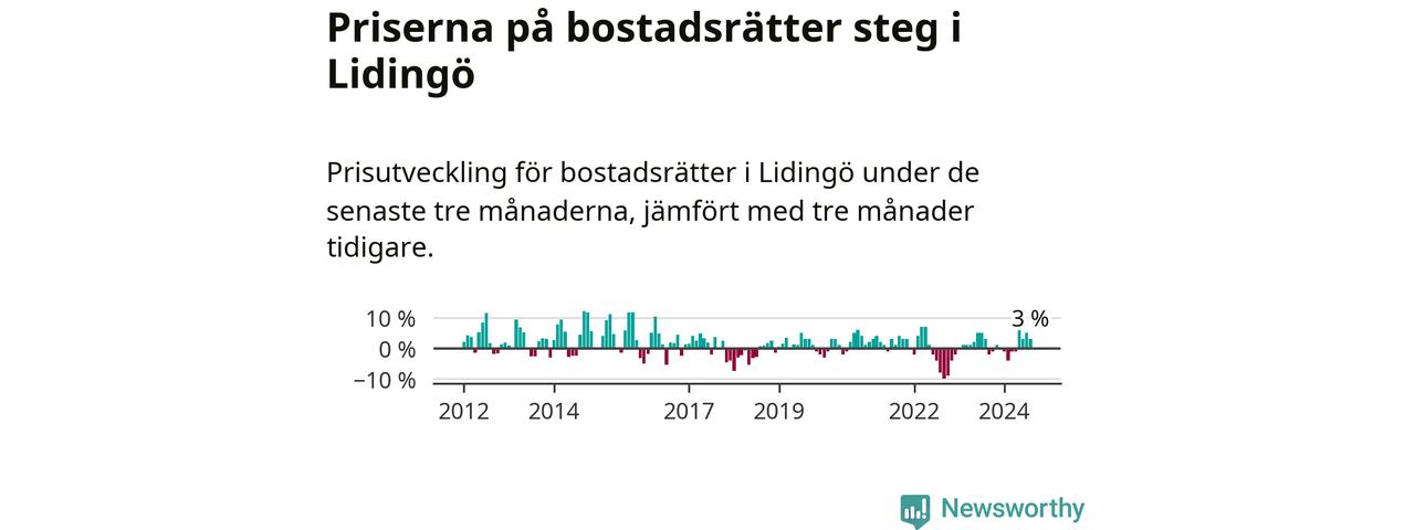 Priserna på bostadsrätter har gått upp i Lidingö kommun. Medelpriset på försäljningarna under de senaste tre månaderna visar på en uppgång med 3 procent.