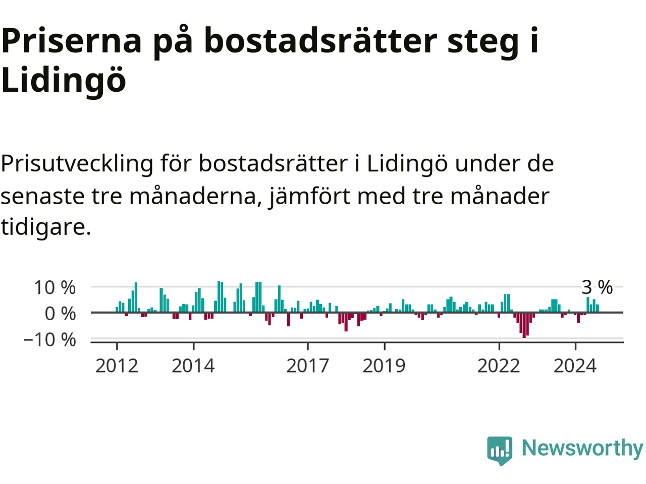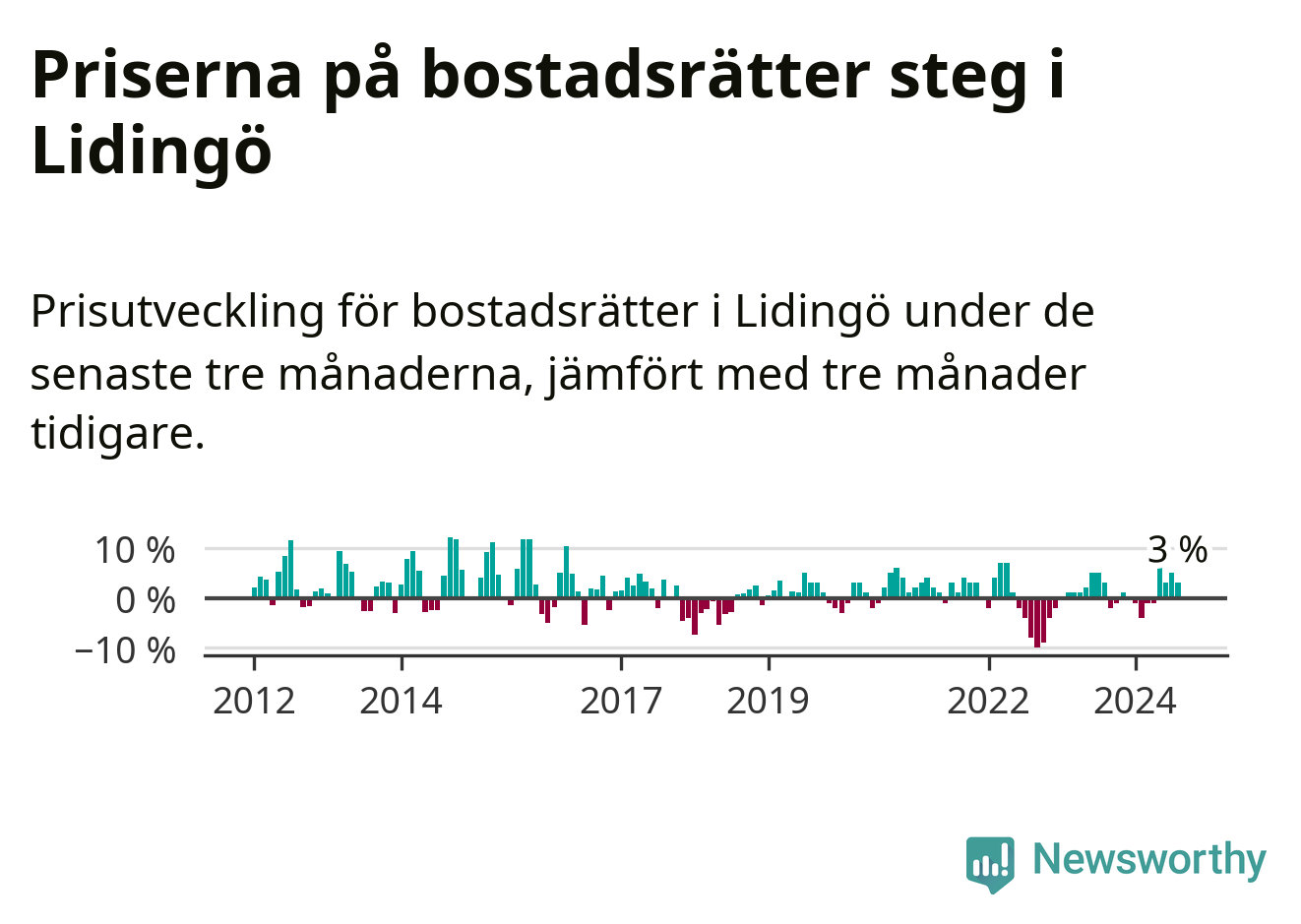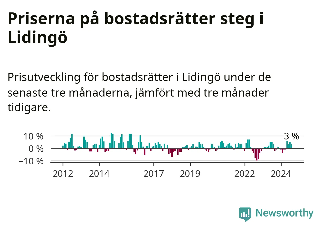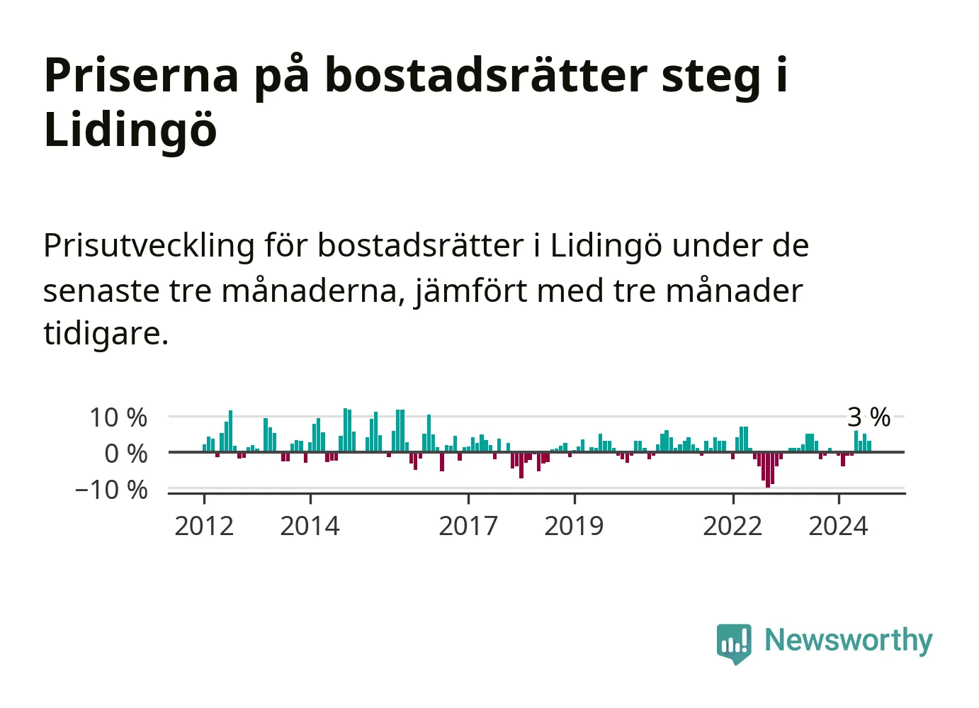 Priserna på bostadsrätter har gått upp i Lidingö kommun. Medelpriset på försäljningarna under de senaste tre månaderna visar på en uppgång med 3 procent.