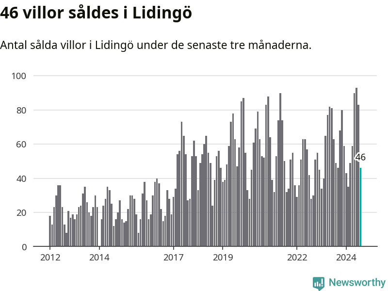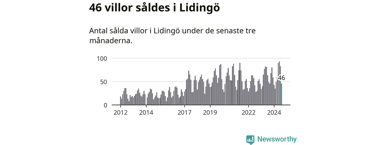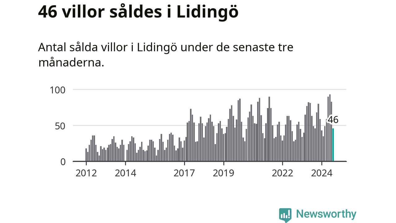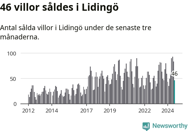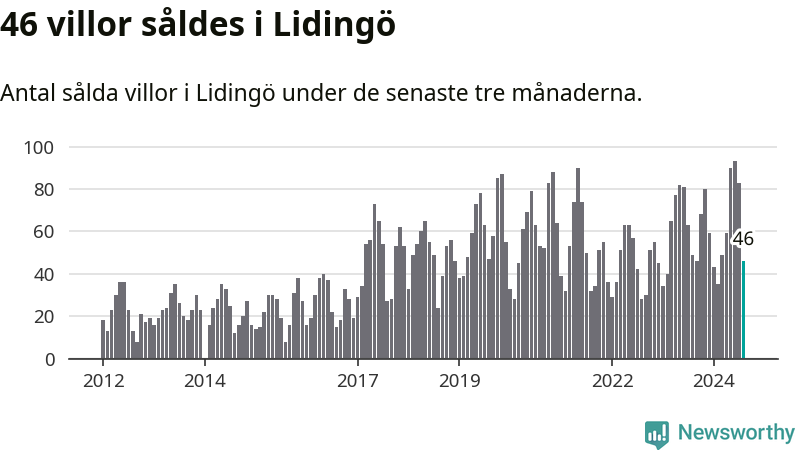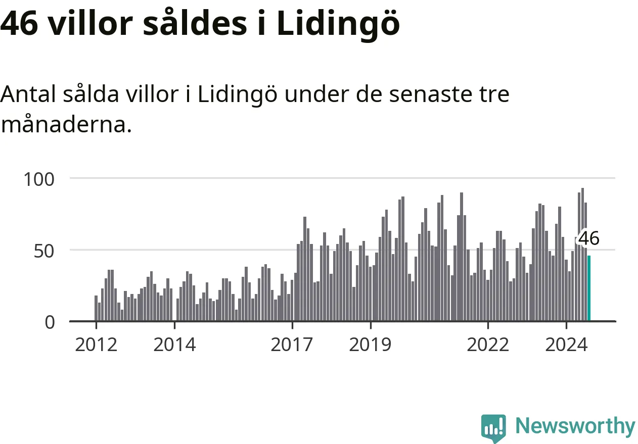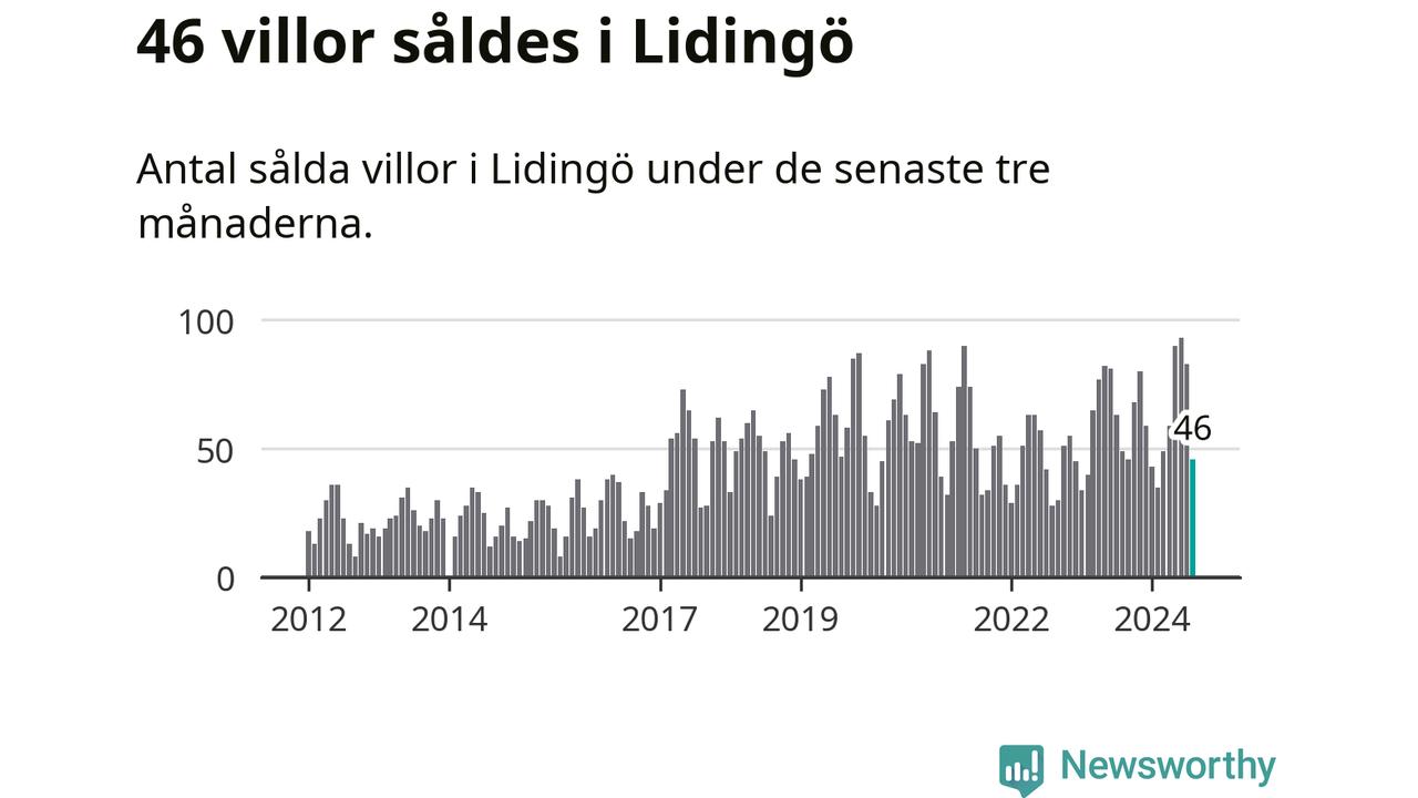 Sammanlagt såldes 46 villor i Lidingö kommun mellan juni och augusti till ett genomsnittligt pris på 15,5 miljoner kronor. I fjol gjordes 49 affärer vid den här tiden på året.