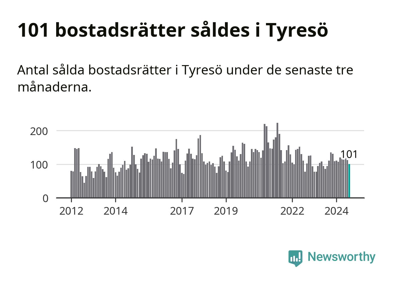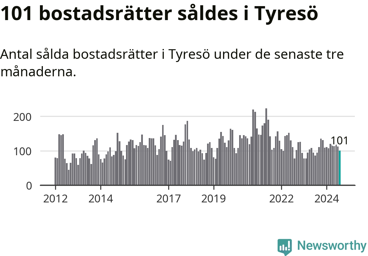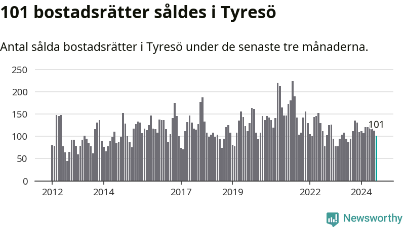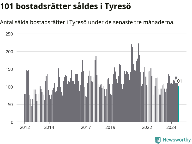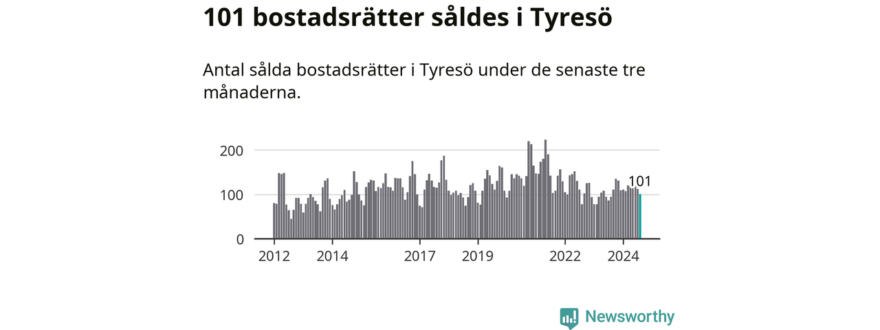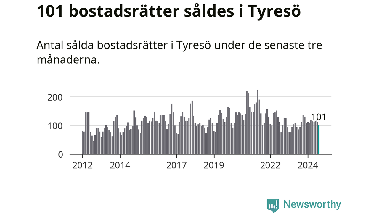 Sammanlagt såldes 101 bostadsrätter i Tyresö kommun mellan juni och augusti till ett genomsnittligt pris på 2,8 miljoner kronor. I fjol gjordes 95 affärer vid den här tiden på året.