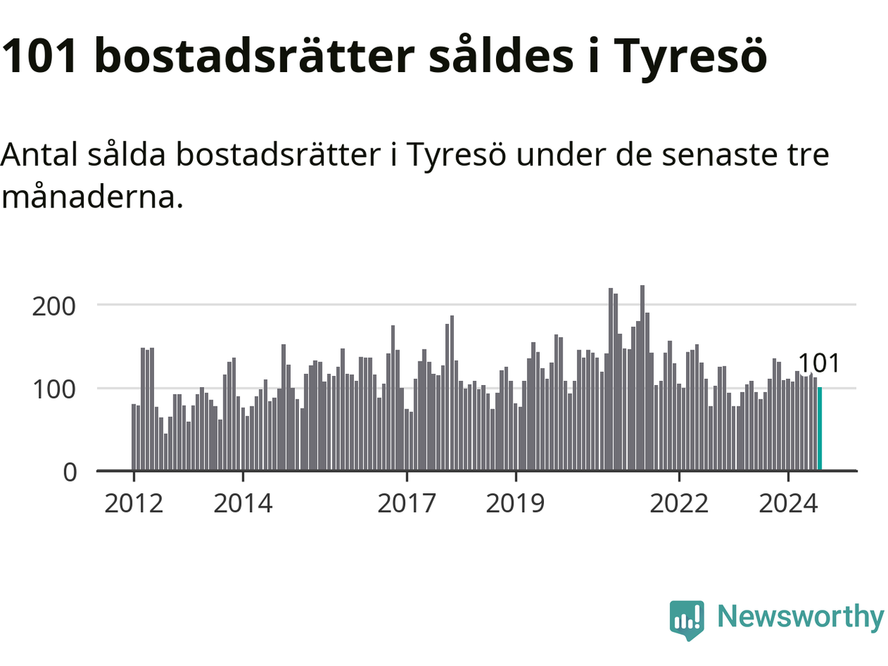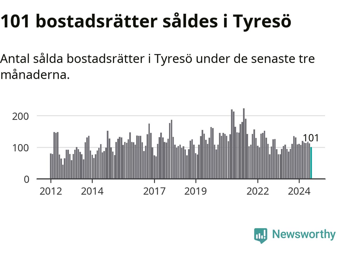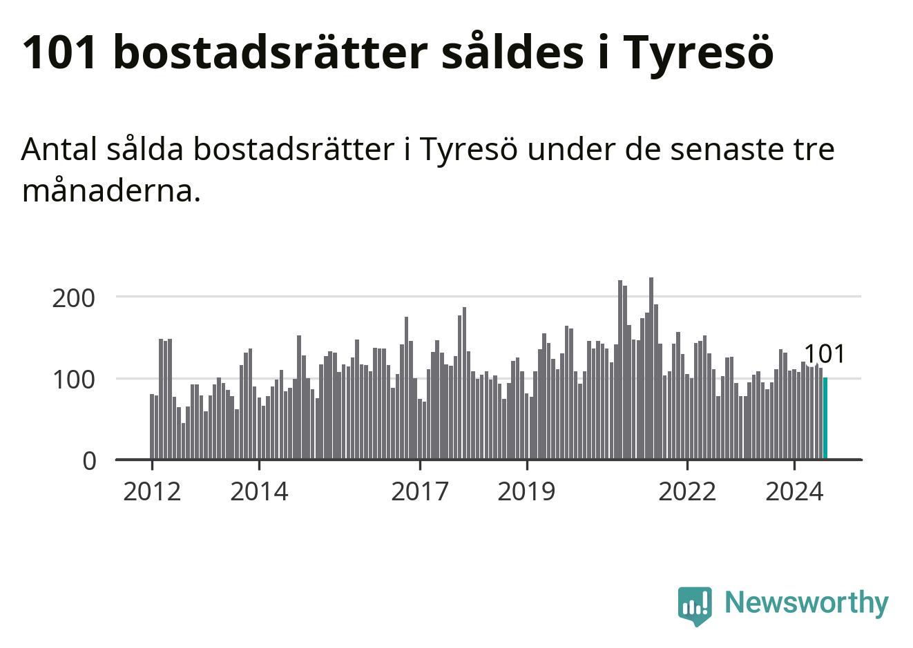 Sammanlagt såldes 101 bostadsrätter i Tyresö kommun mellan juni och augusti till ett genomsnittligt pris på 2,8 miljoner kronor. I fjol gjordes 95 affärer vid den här tiden på året.