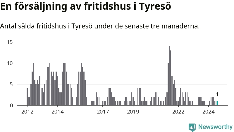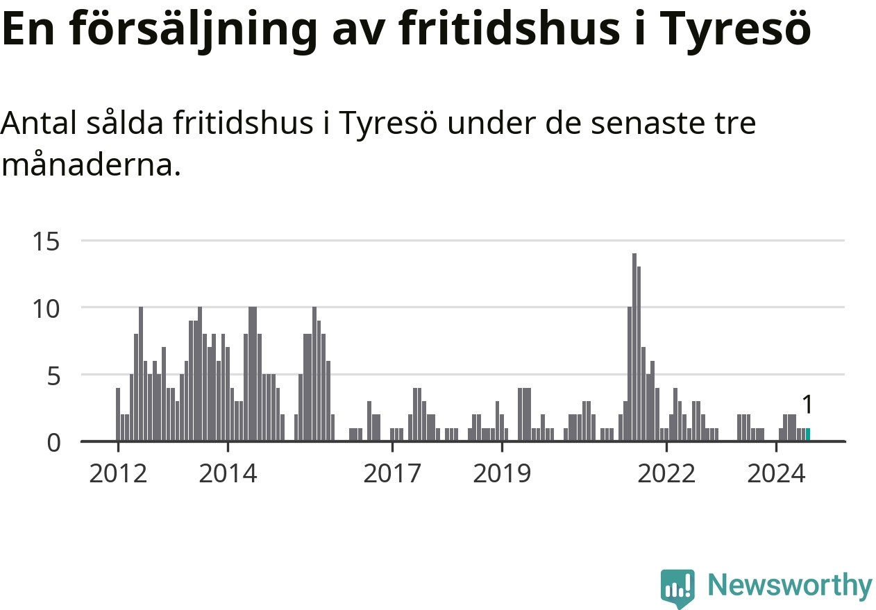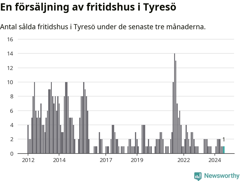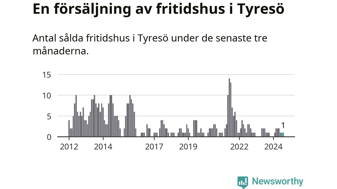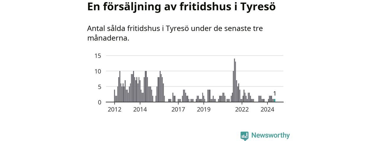 Mellan juni och augusti gjordes sammanlagt en affär med fritidshus i Tyresö kommun. Det är lika många affärer som vid motsvarande tid i fjol.