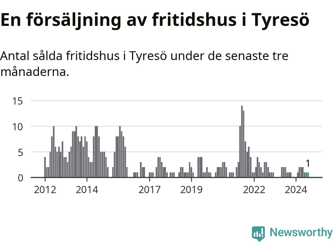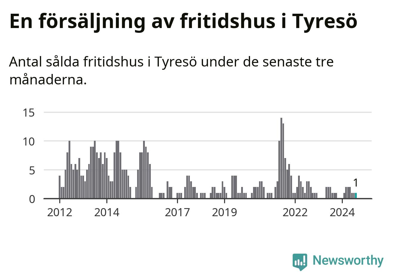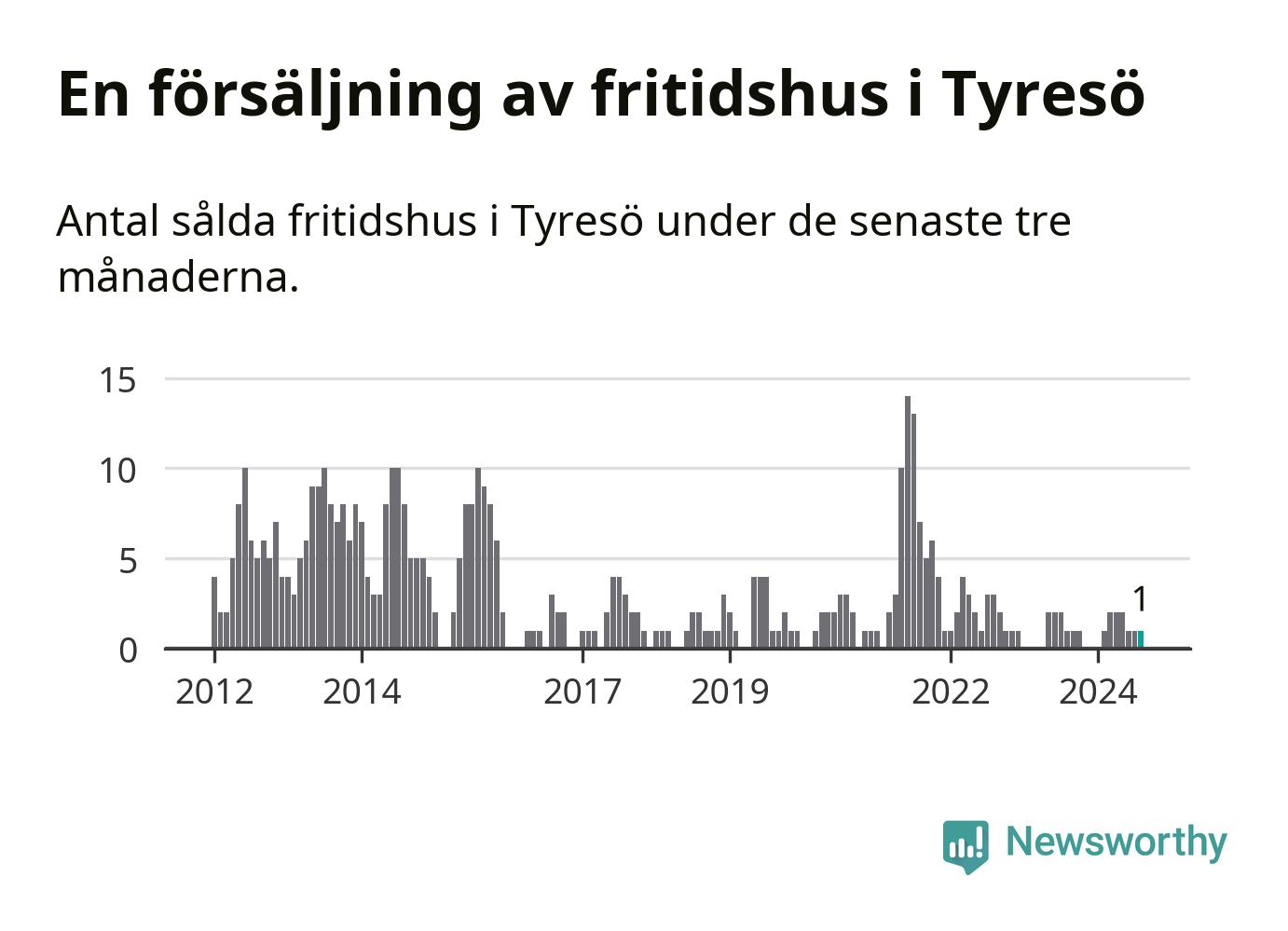 Mellan juni och augusti gjordes sammanlagt en affär med fritidshus i Tyresö kommun. Det är lika många affärer som vid motsvarande tid i fjol.