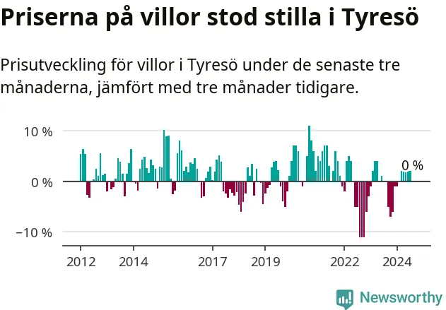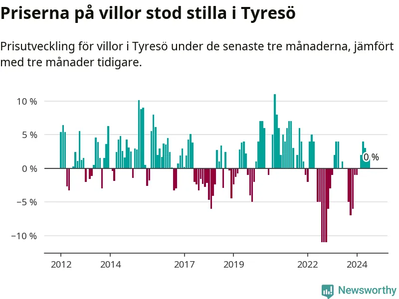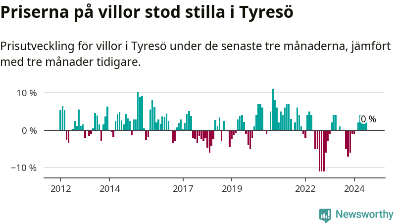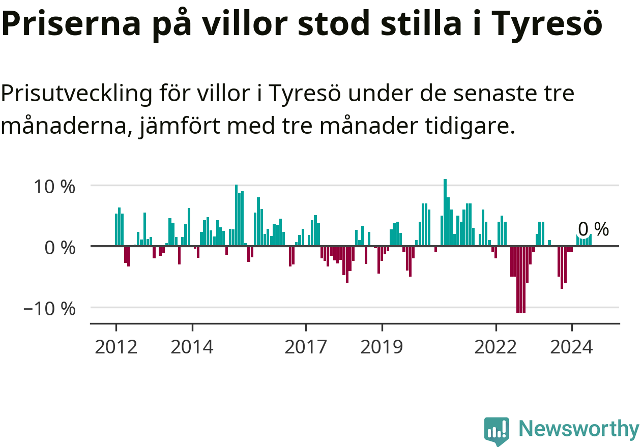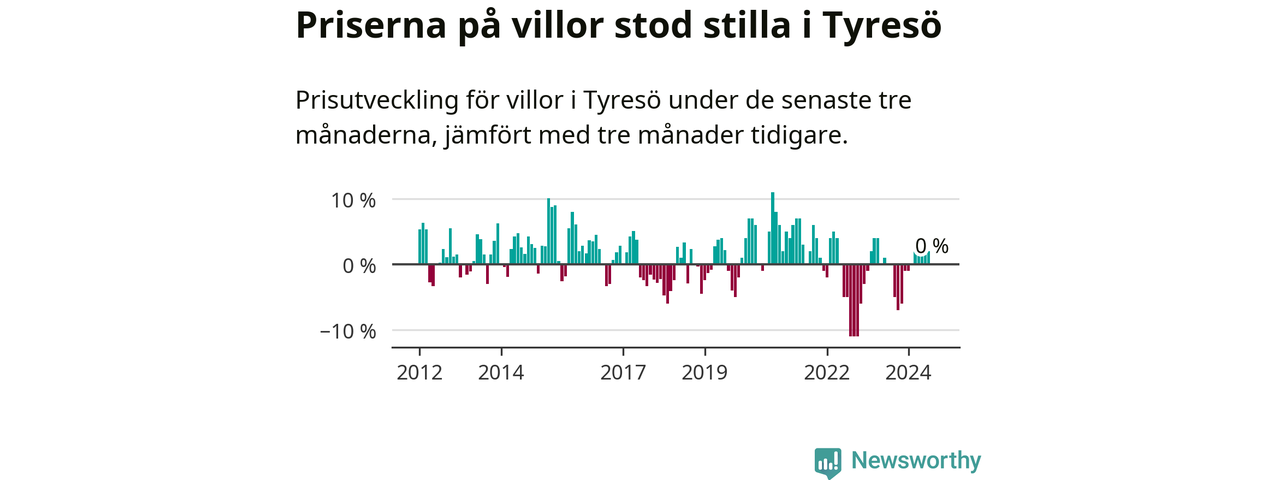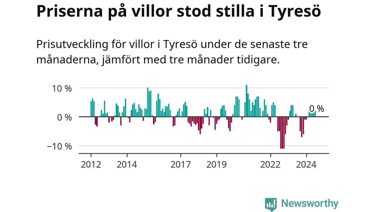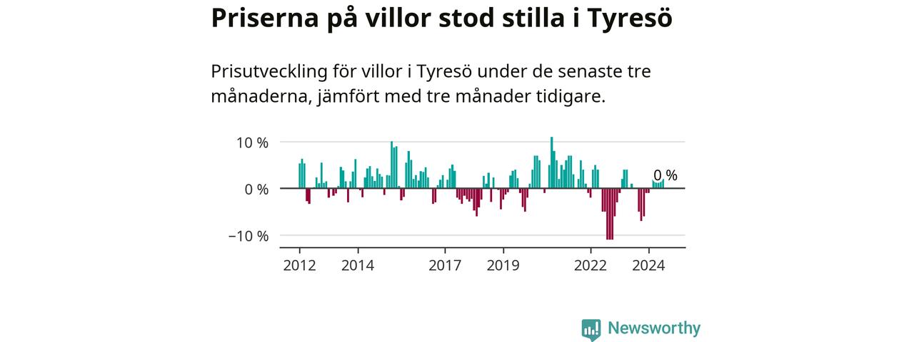 Villapriserna står i stort sett stilla i Tyresö kommun. Medelpriset på de på försäljningarna under de senaste tre månaderna låg på samma nivå som för tre månader sedan.