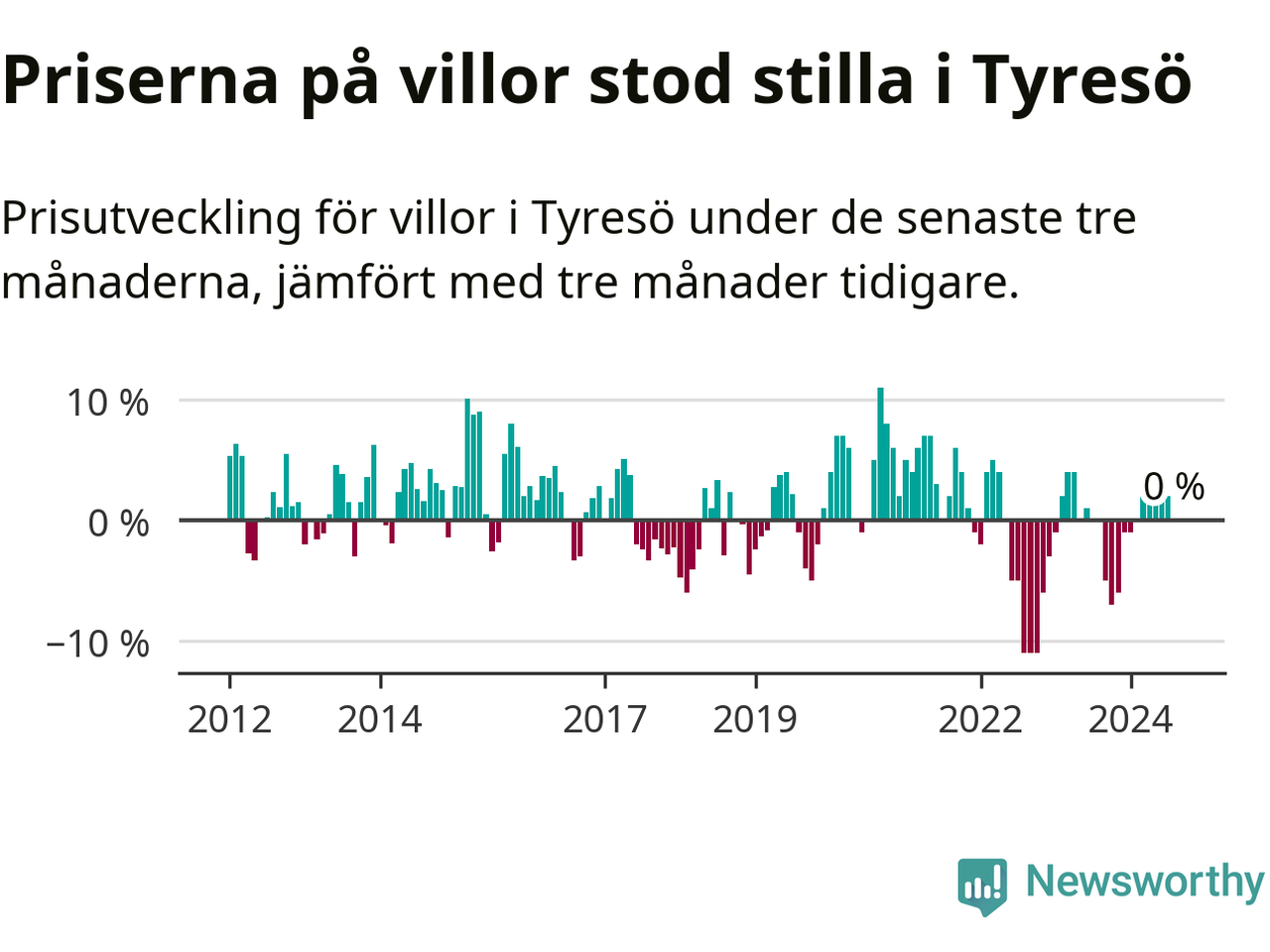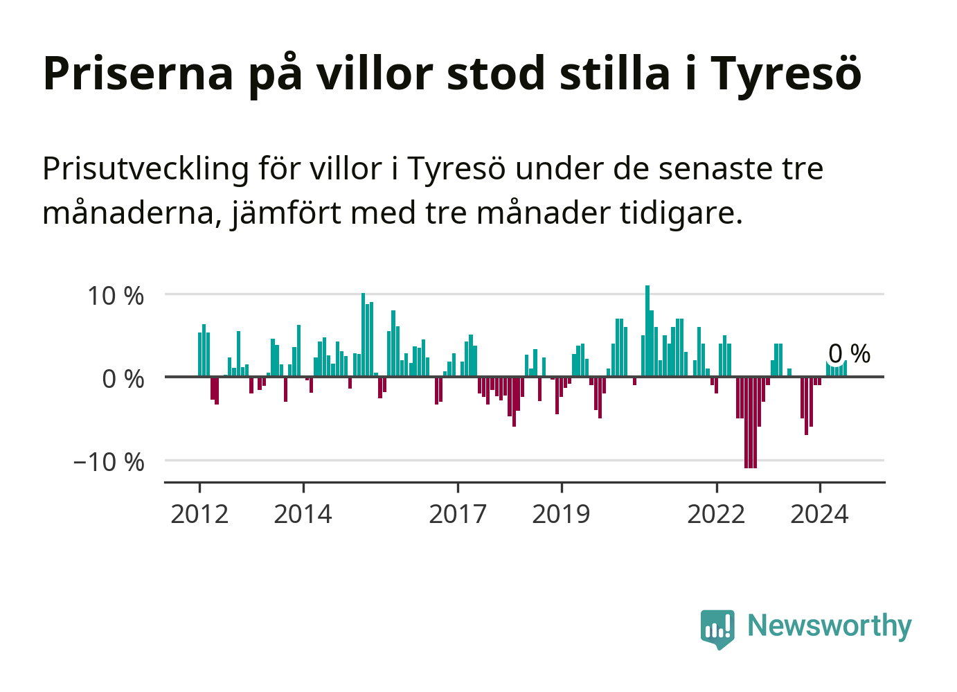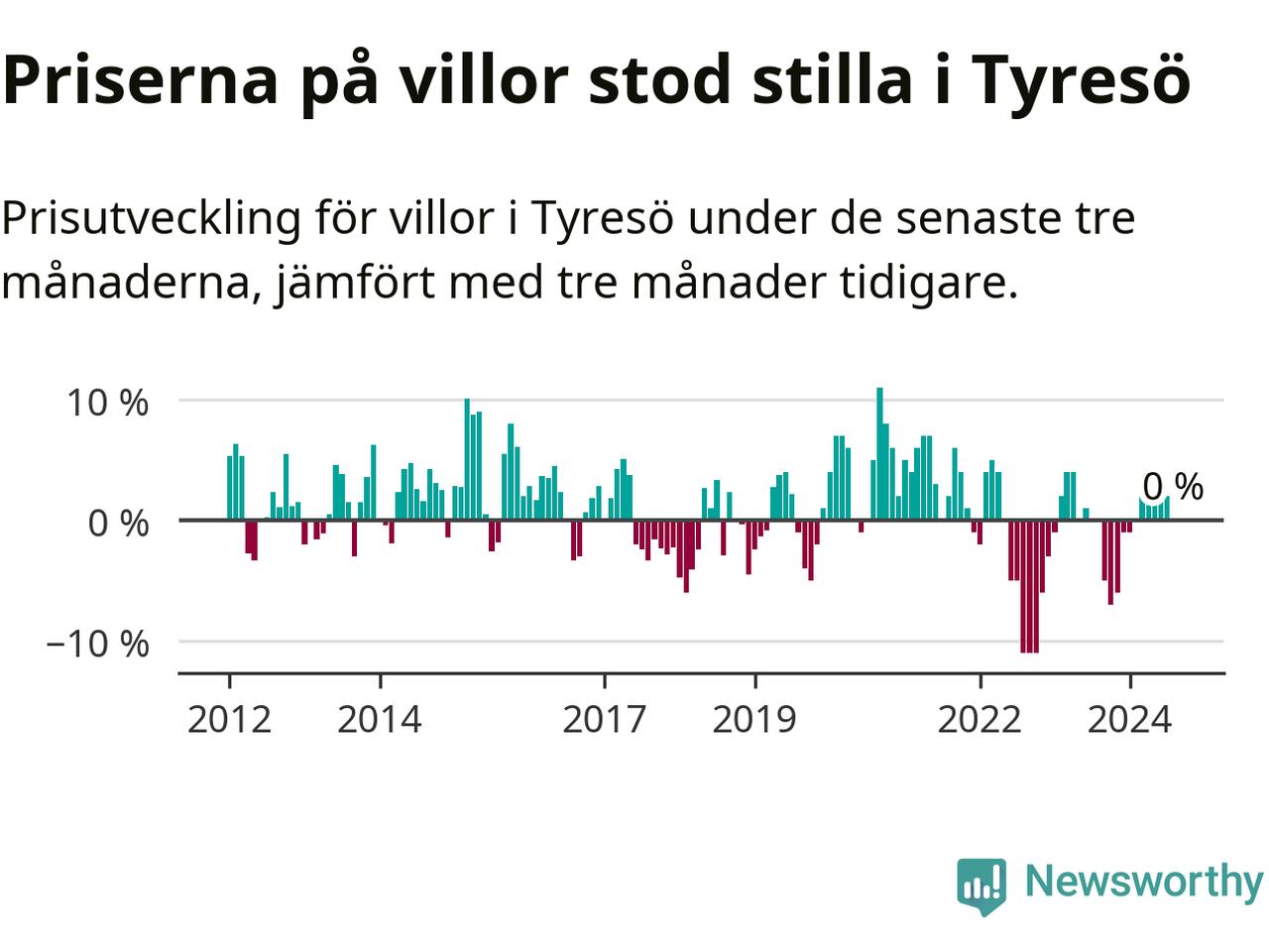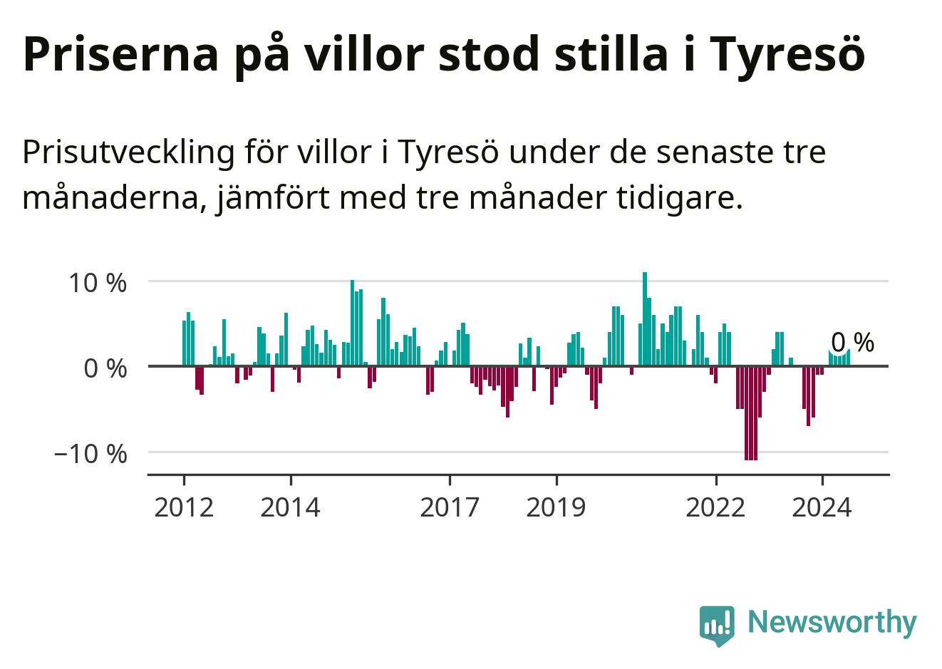 Villapriserna står i stort sett stilla i Tyresö kommun. Medelpriset på de på försäljningarna under de senaste tre månaderna låg på samma nivå som för tre månader sedan.