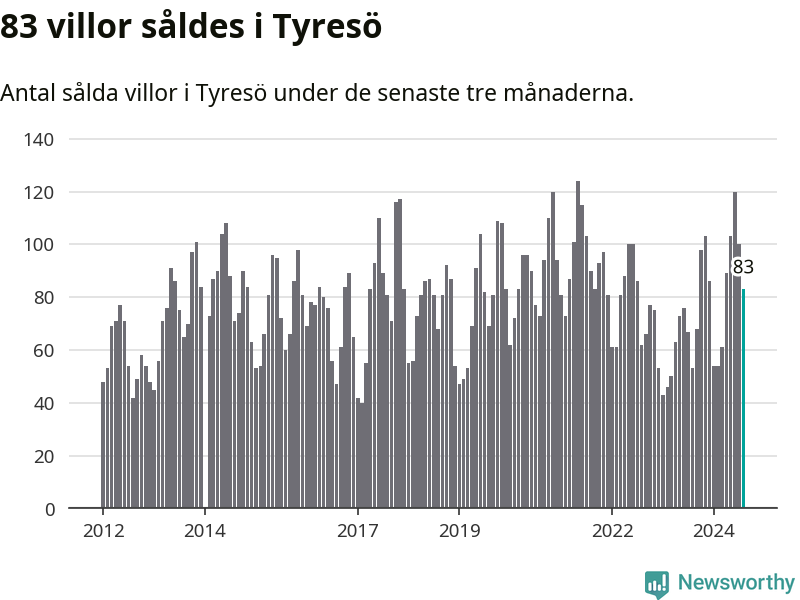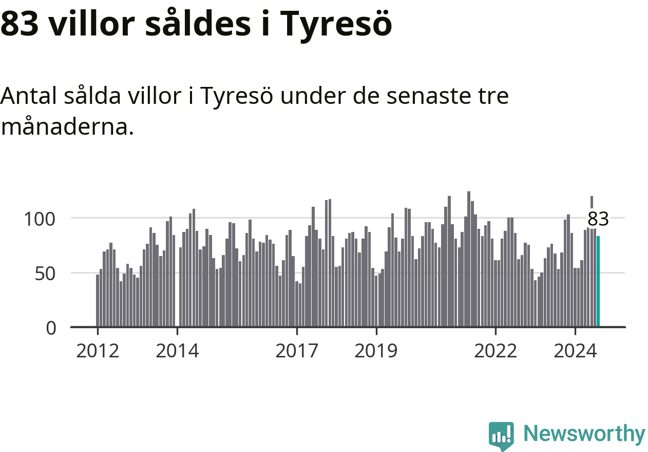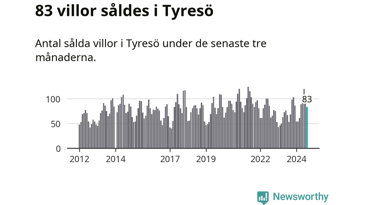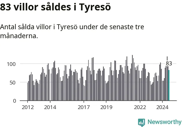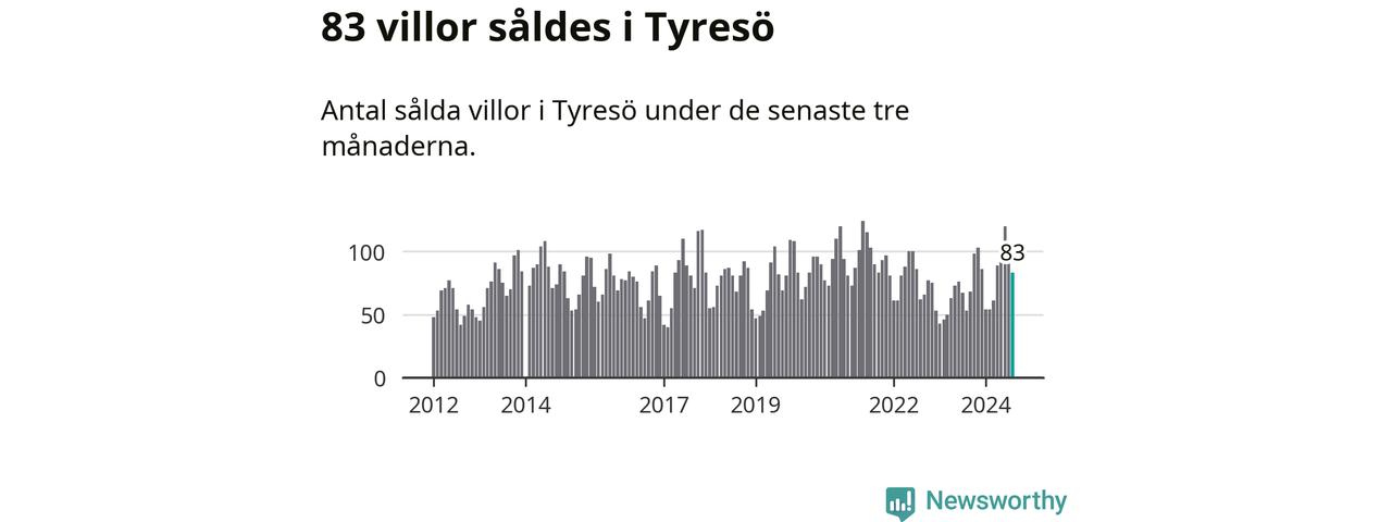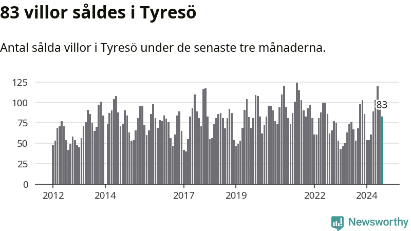 Sammanlagt såldes 83 villor i Tyresö kommun mellan juni och augusti till ett genomsnittligt pris på 6,4 miljoner kronor. I fjol gjordes 53 affärer vid den här tiden på året.