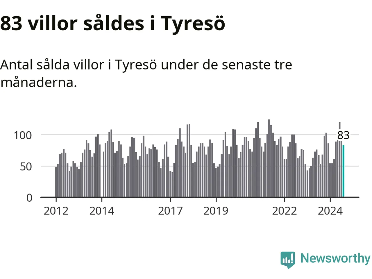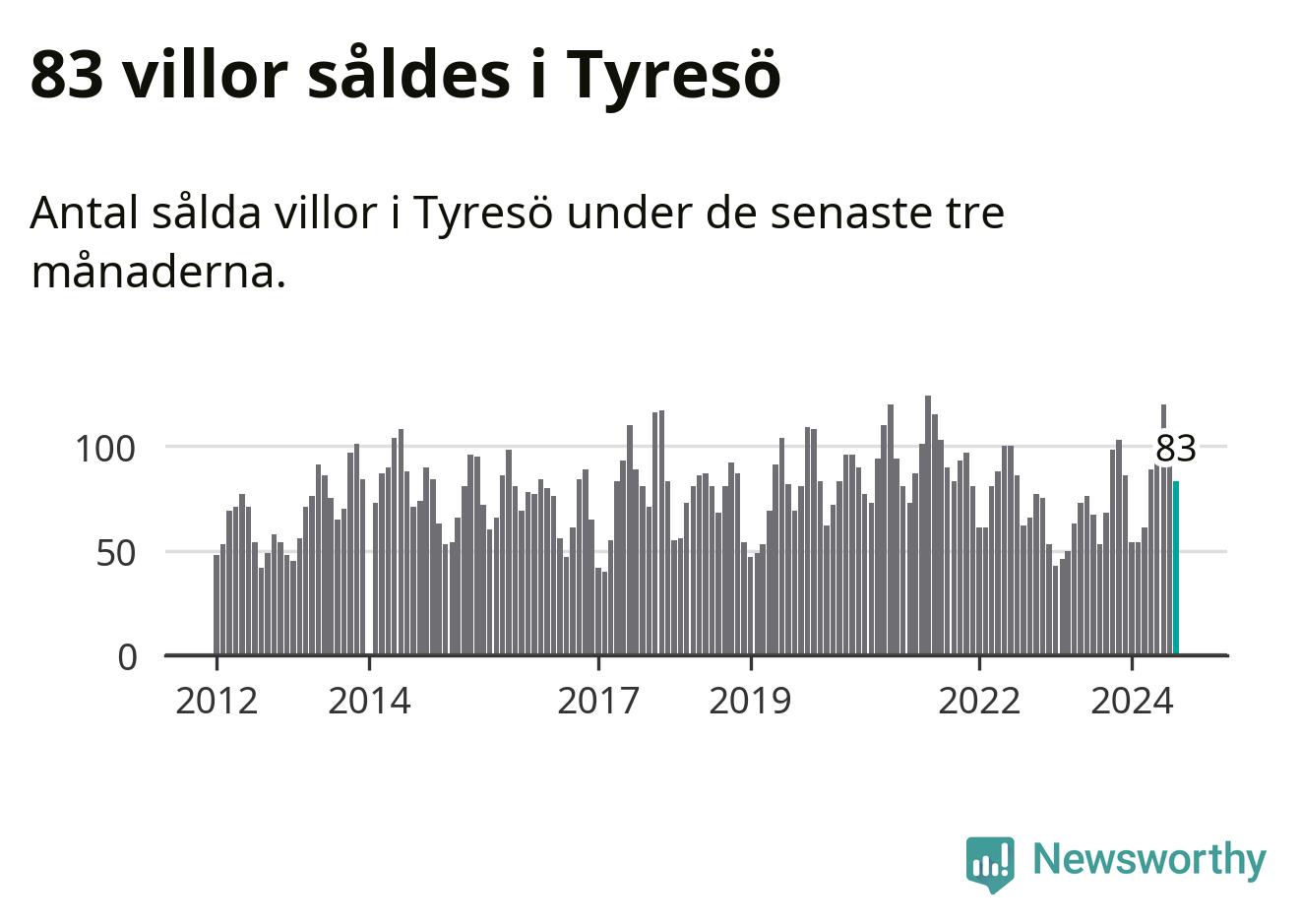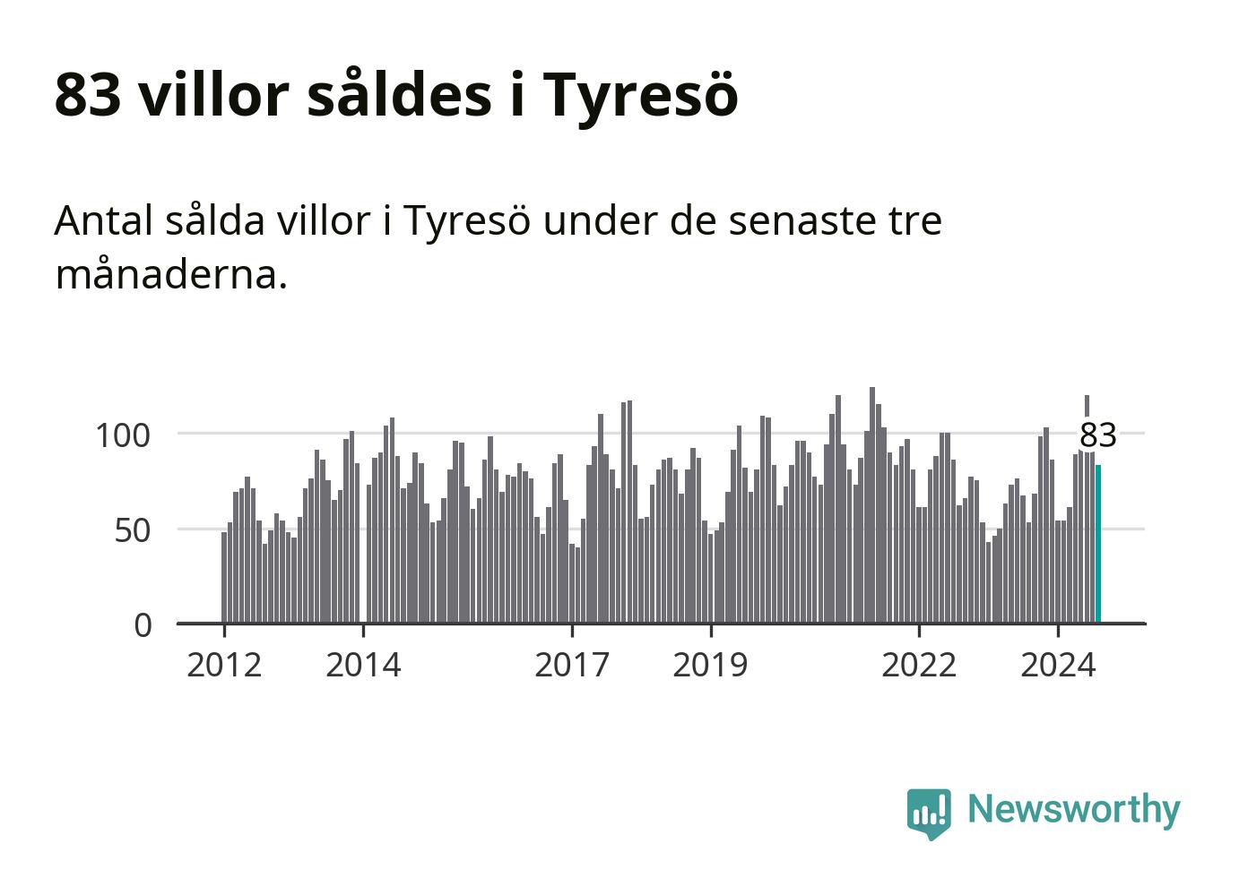 Sammanlagt såldes 83 villor i Tyresö kommun mellan juni och augusti till ett genomsnittligt pris på 6,4 miljoner kronor. I fjol gjordes 53 affärer vid den här tiden på året.