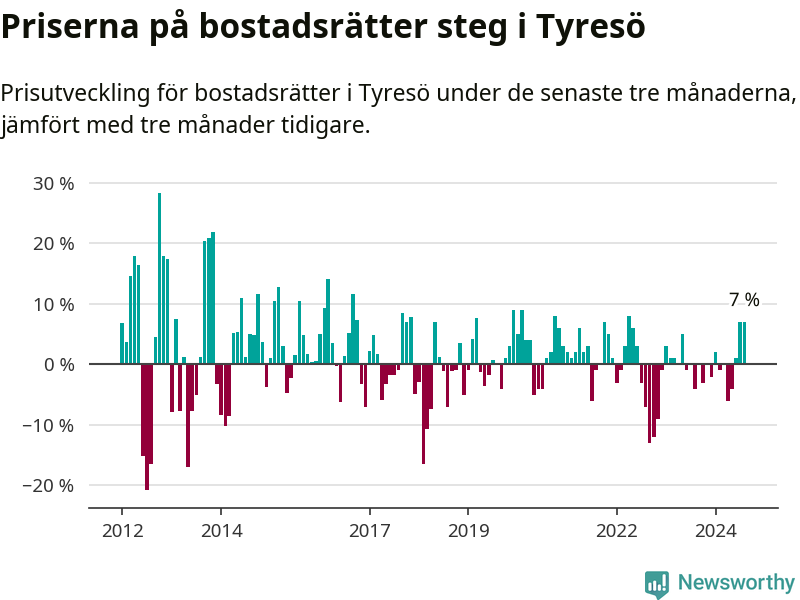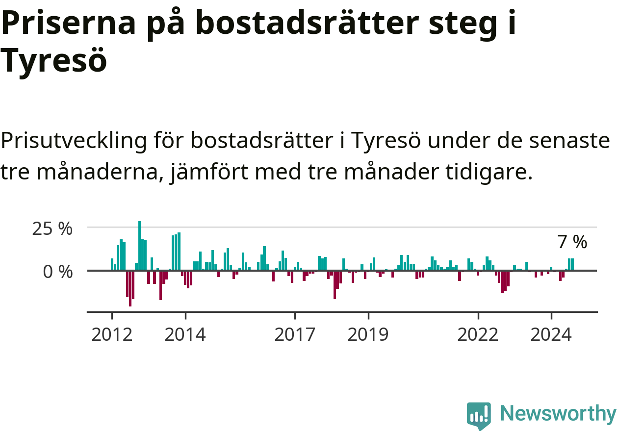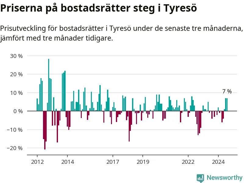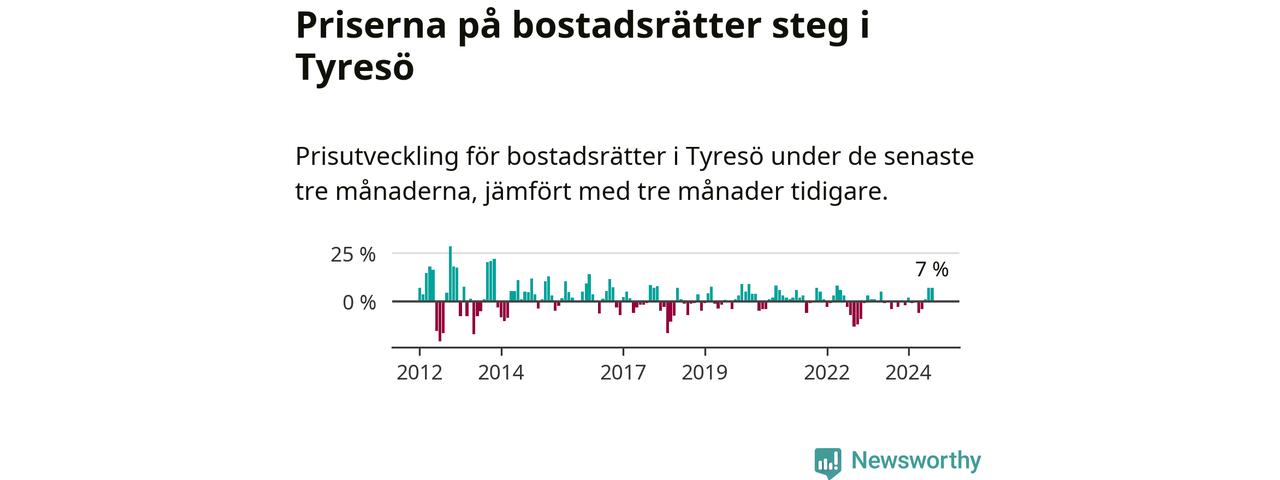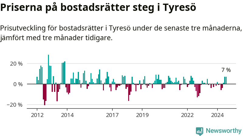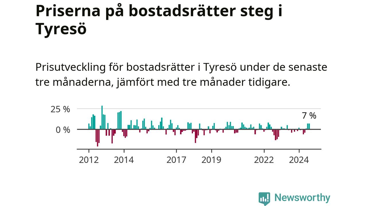 Priserna på bostadsrätter har gått upp i Tyresö kommun. Medelpriset på försäljningarna under de senaste tre månaderna visar på en uppgång med 7 procent.
