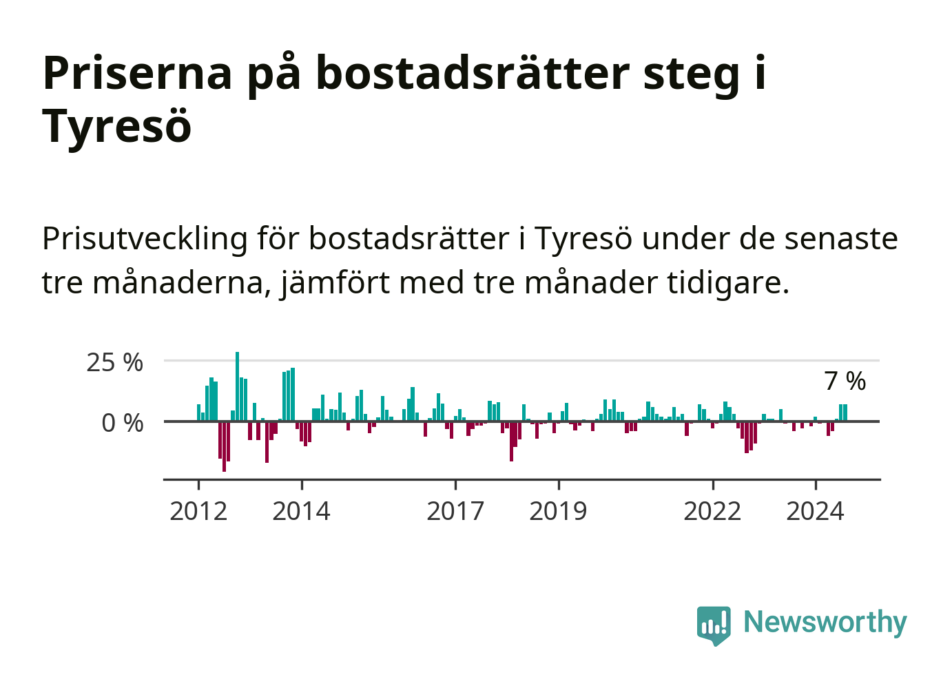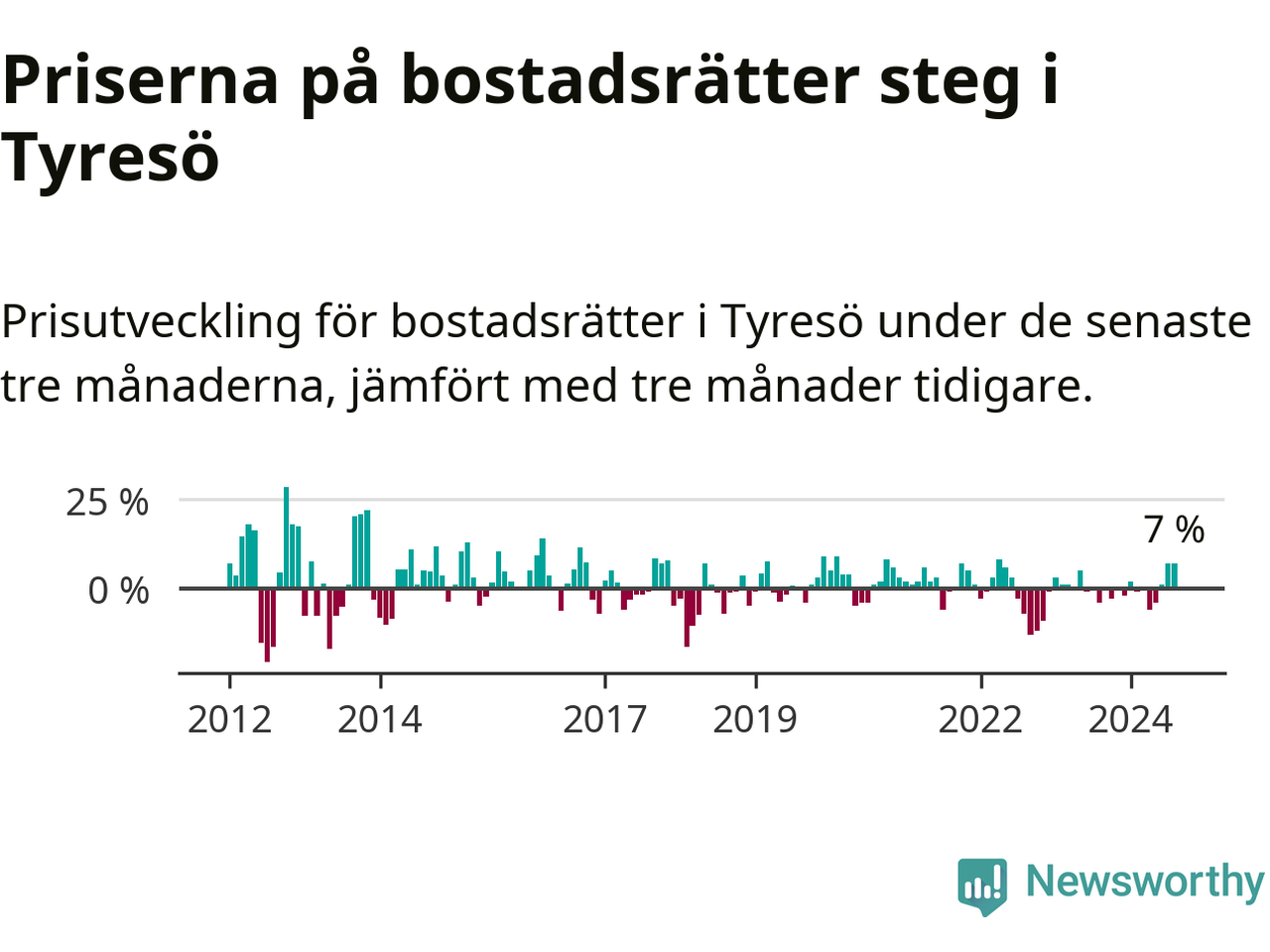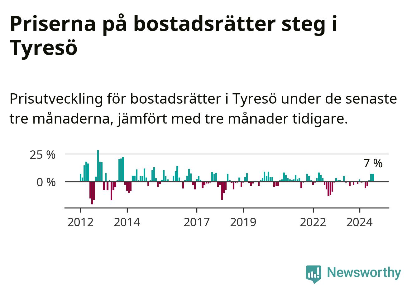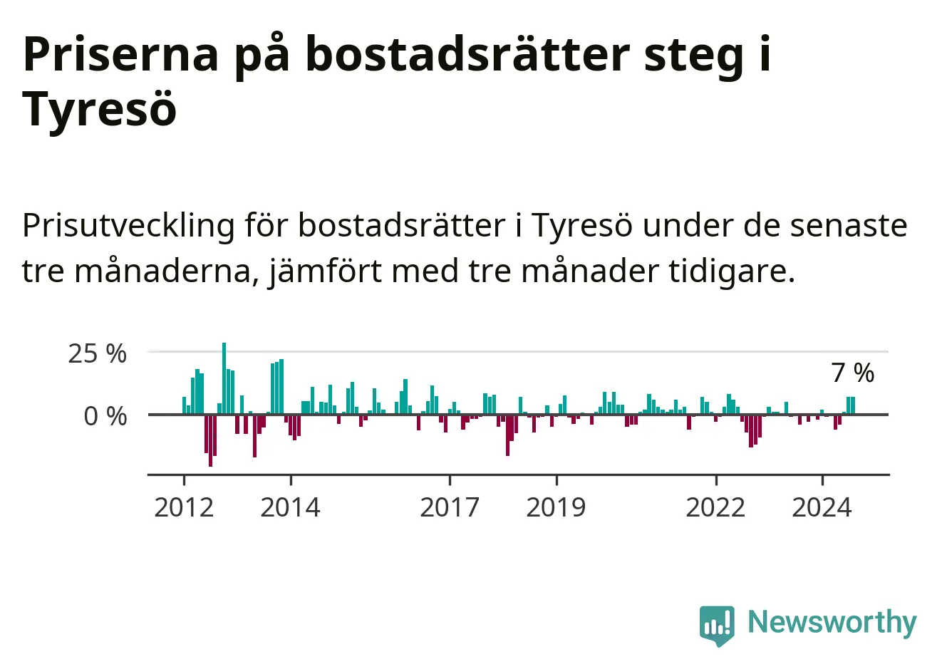 Priserna på bostadsrätter har gått upp i Tyresö kommun. Medelpriset på försäljningarna under de senaste tre månaderna visar på en uppgång med 7 procent.
