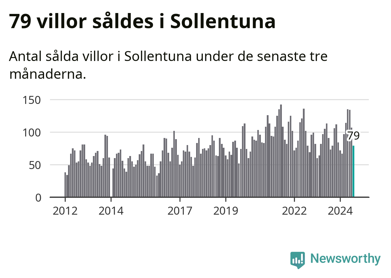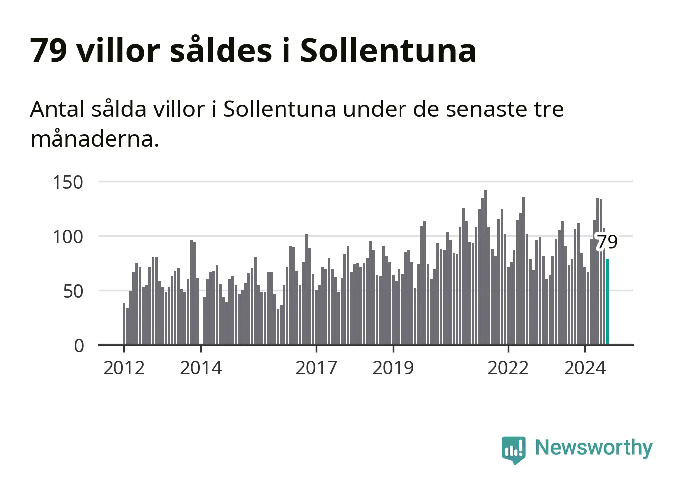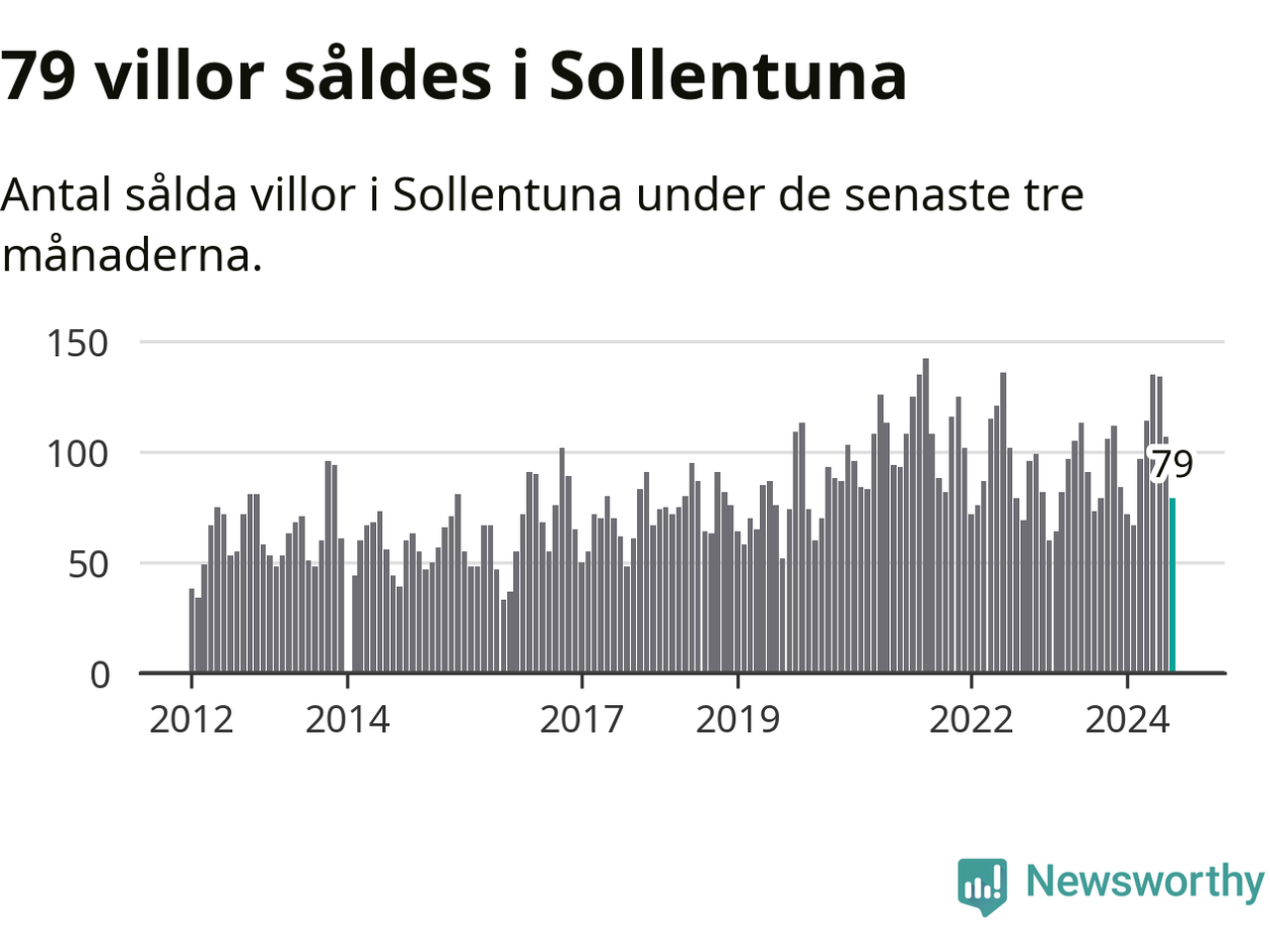 Sammanlagt såldes 79 villor i Sollentuna kommun mellan juni och augusti till ett genomsnittligt pris på 8,2 miljoner kronor. I fjol gjordes 73 affärer vid den här tiden på året.