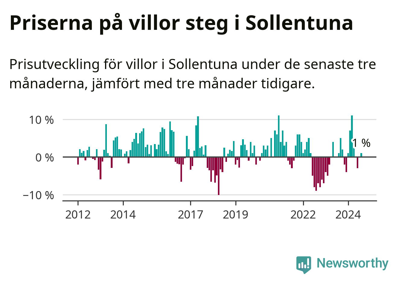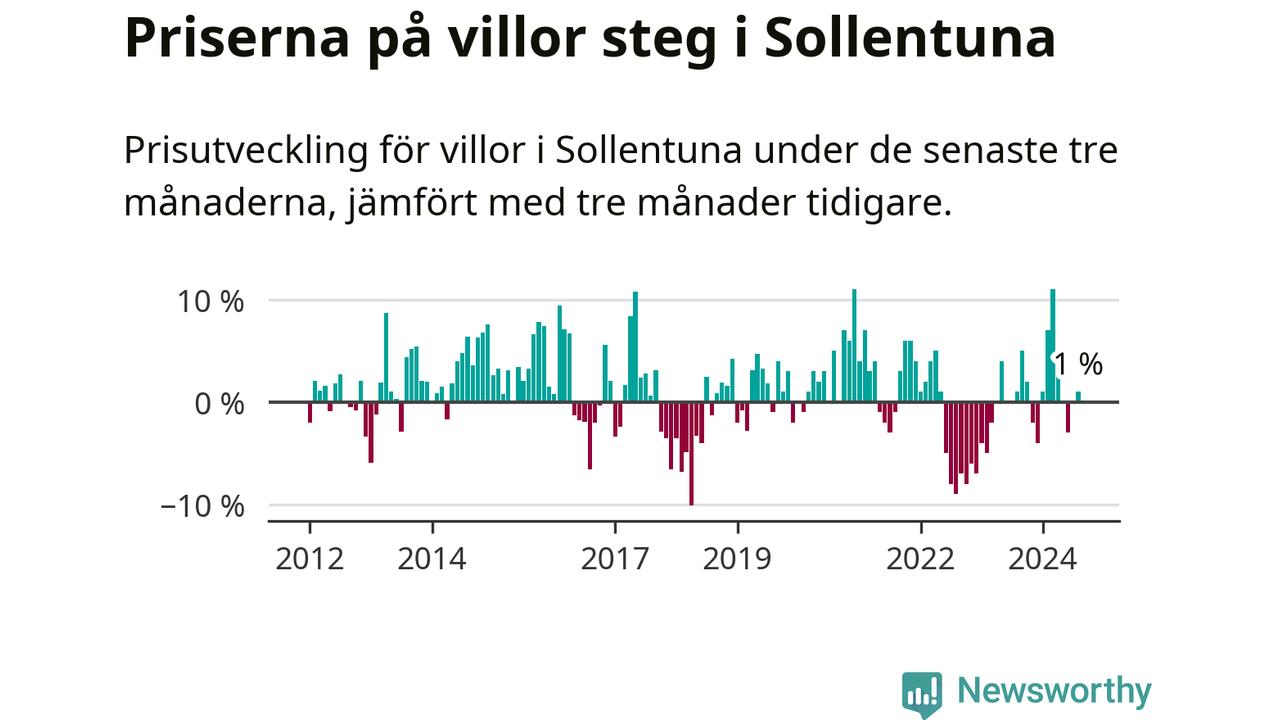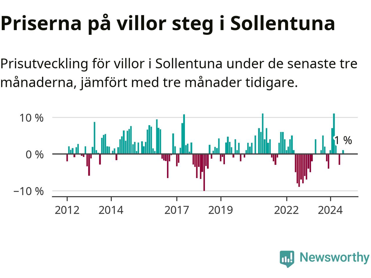 Villapriserna har gått upp i Sollentuna kommun. Medelpriset på försäljningarna under de senaste tre månaderna visar på en uppgång med 1 procent.