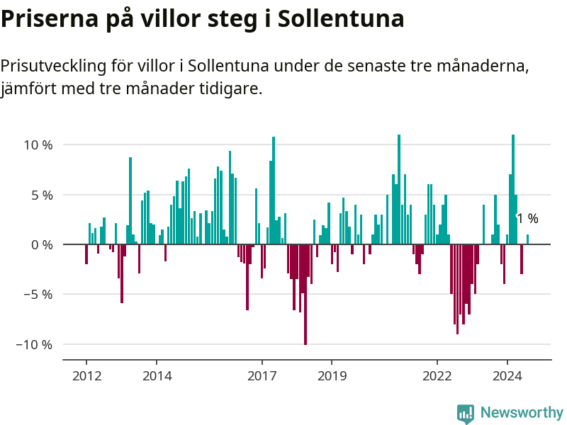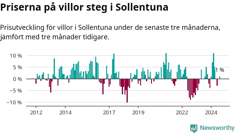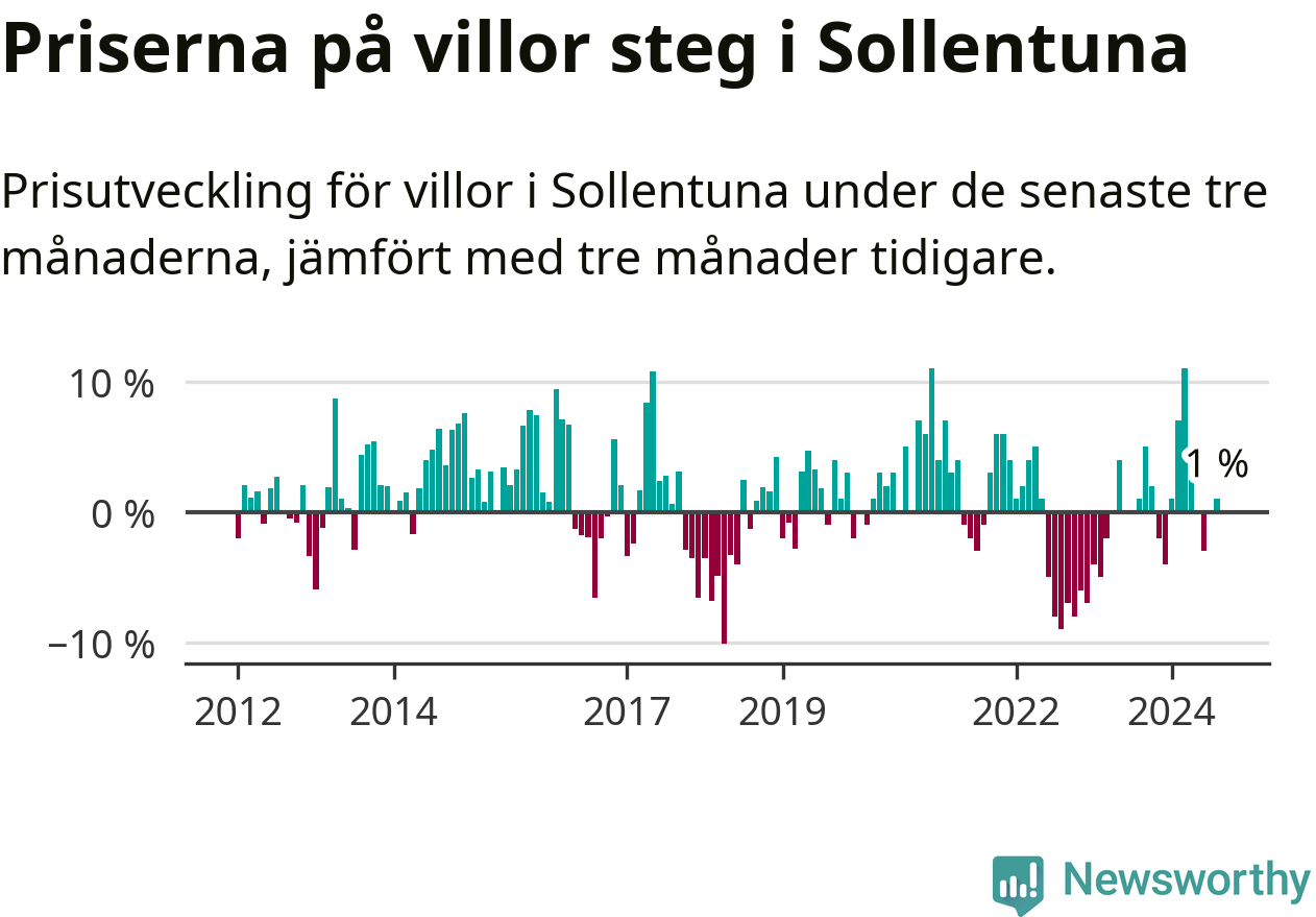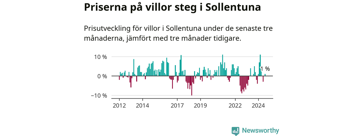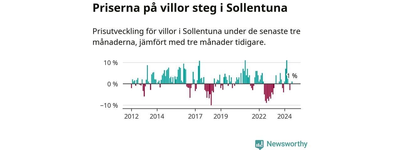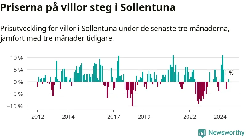 Villapriserna har gått upp i Sollentuna kommun. Medelpriset på försäljningarna under de senaste tre månaderna visar på en uppgång med 1 procent.