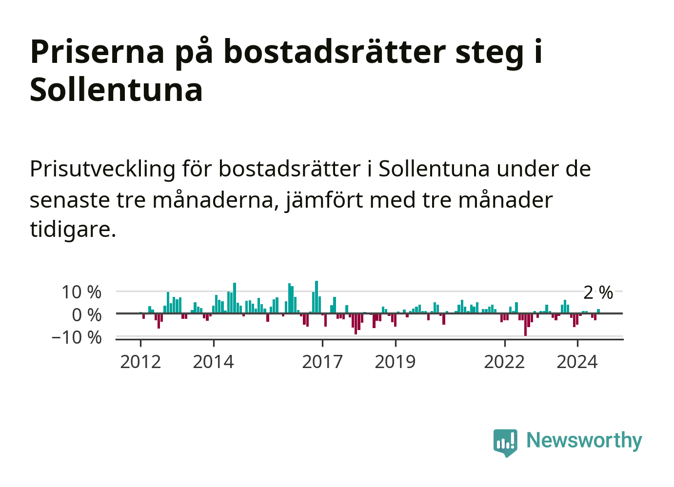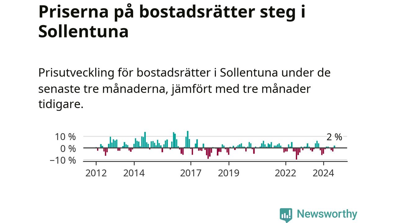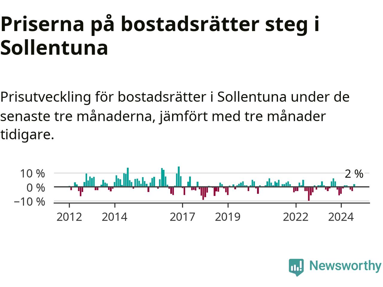Priserna på bostadsrätter har gått upp i Sollentuna kommun. Medelpriset på försäljningarna under de senaste tre månaderna visar på en uppgång med 2 procent.