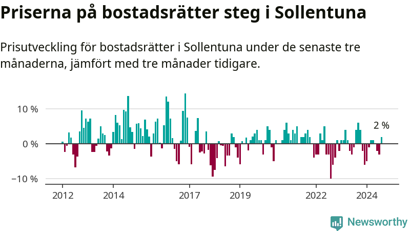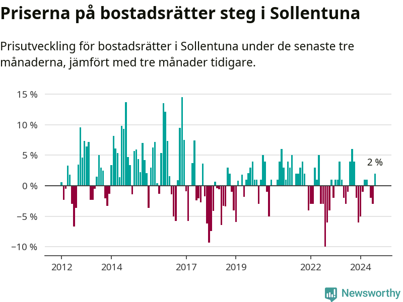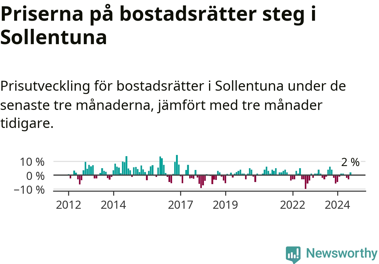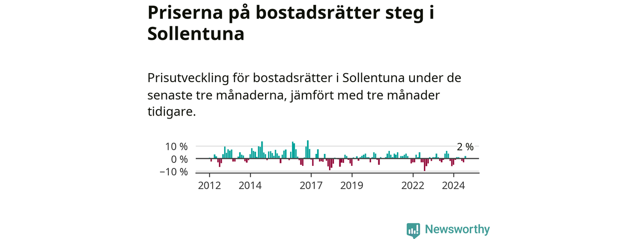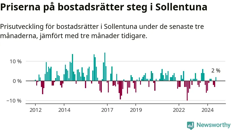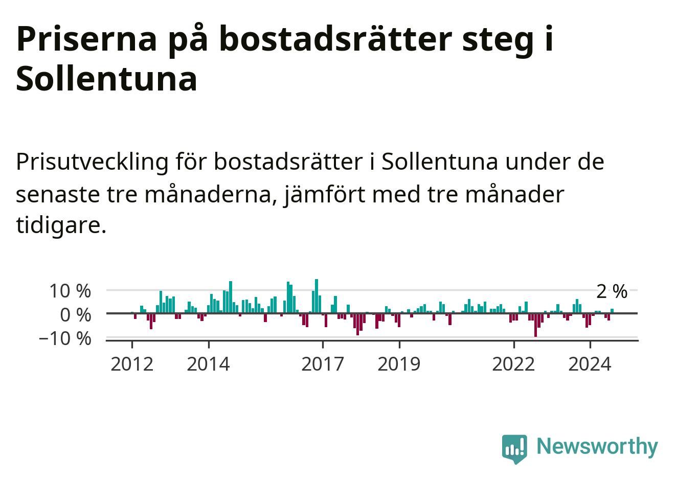 Priserna på bostadsrätter har gått upp i Sollentuna kommun. Medelpriset på försäljningarna under de senaste tre månaderna visar på en uppgång med 2 procent.