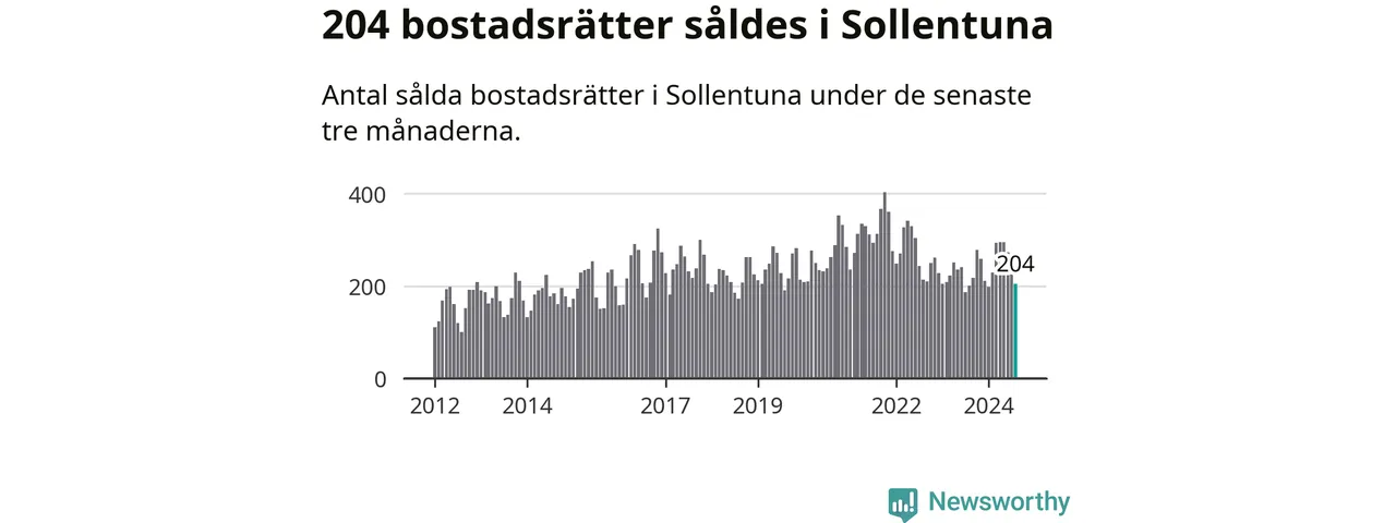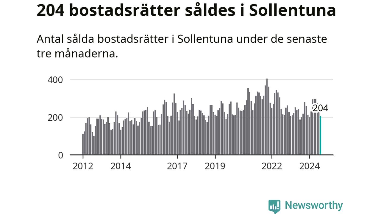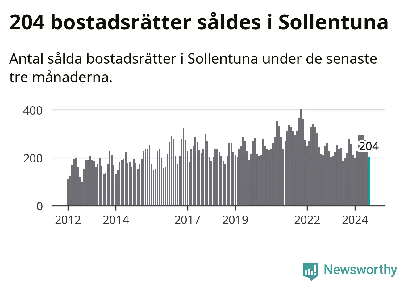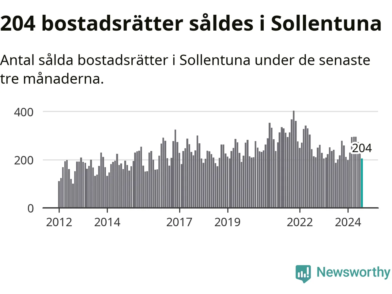 Sammanlagt såldes 204 bostadsrätter i Sollentuna kommun mellan juni och augusti till ett genomsnittligt pris på 3,2 miljoner kronor. I fjol gjordes 201 affärer vid den här tiden på året.