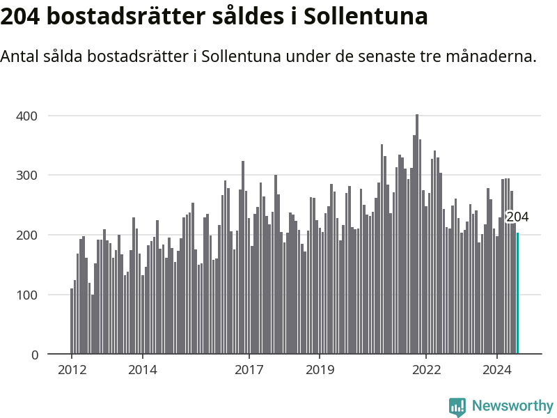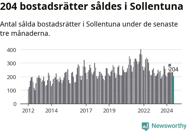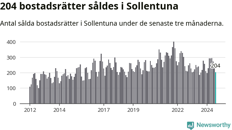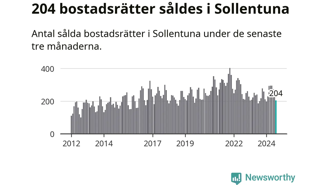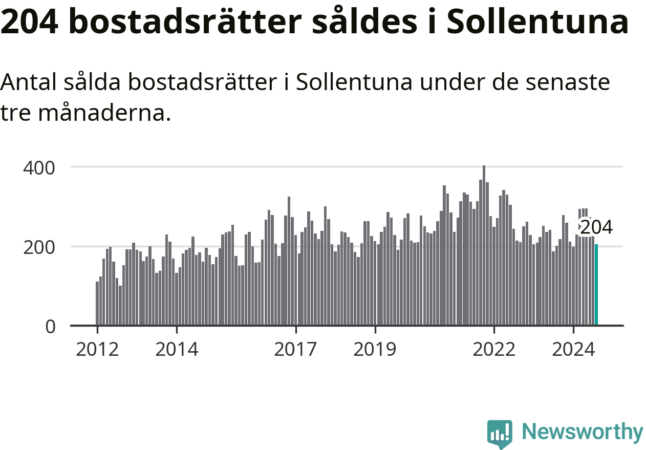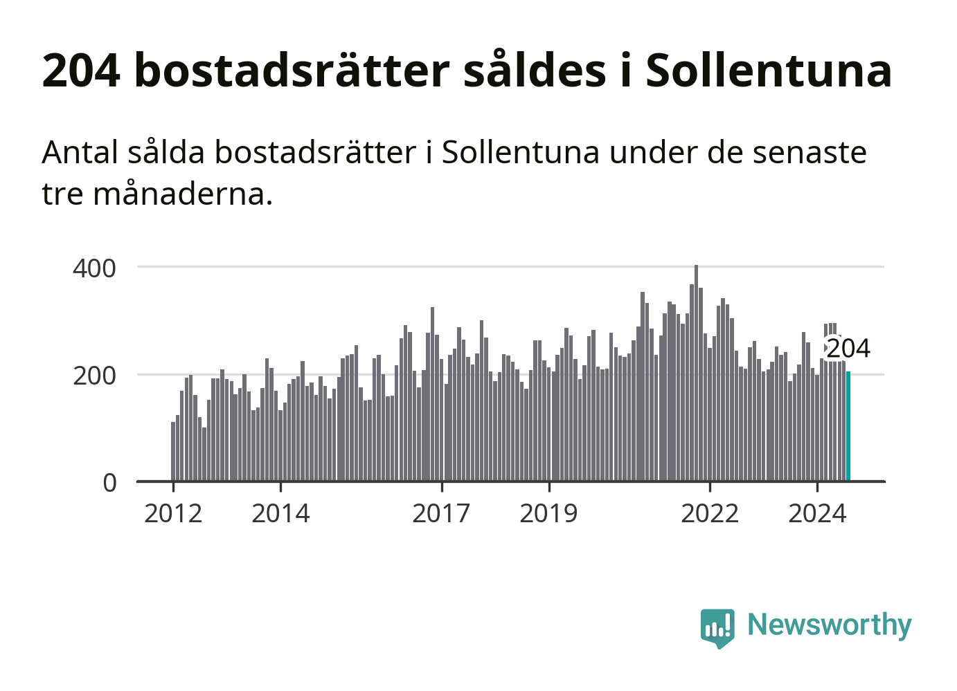 Sammanlagt såldes 204 bostadsrätter i Sollentuna kommun mellan juni och augusti till ett genomsnittligt pris på 3,2 miljoner kronor. I fjol gjordes 201 affärer vid den här tiden på året.