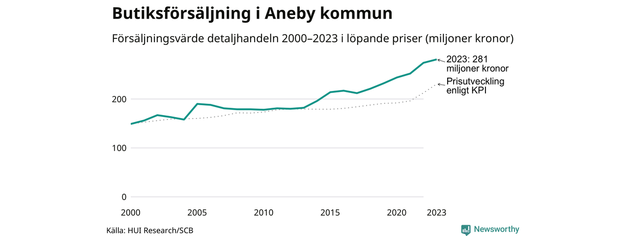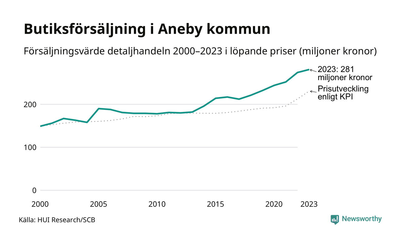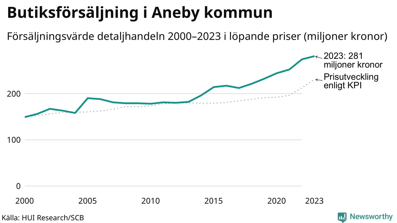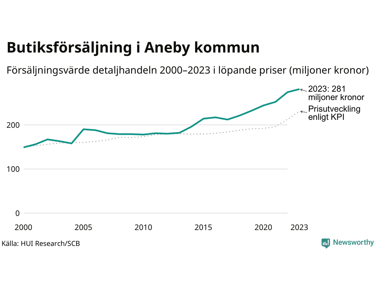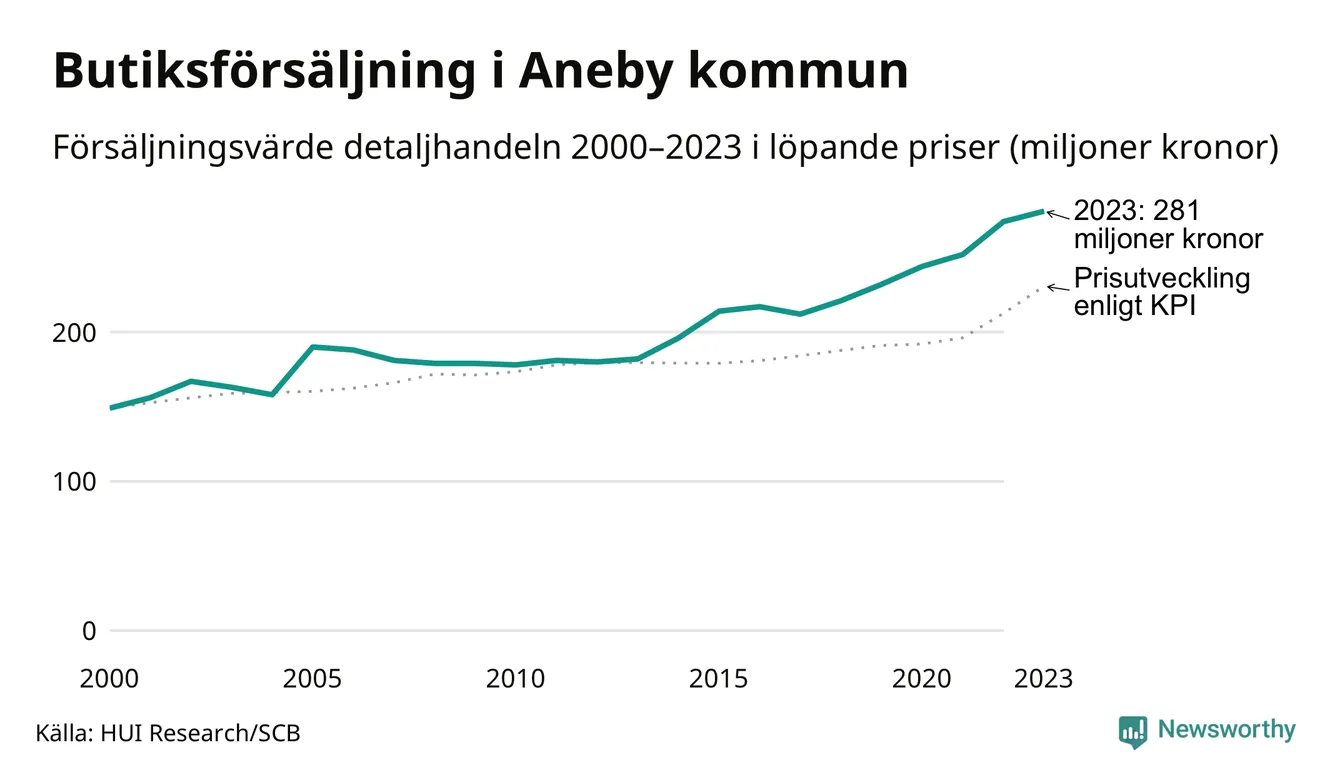 Den totala försäljningen i detaljhandeln i Aneby kommun var 281 miljoner kronor under 2023, visar färska siffror från HUI Research. Det är en ökning med 3 procent jämfört med året innan, vilket är mindre än den allmänna prisökningen och räknar man i fast penningvärde är det snarare en minskning på runt 6 procent.