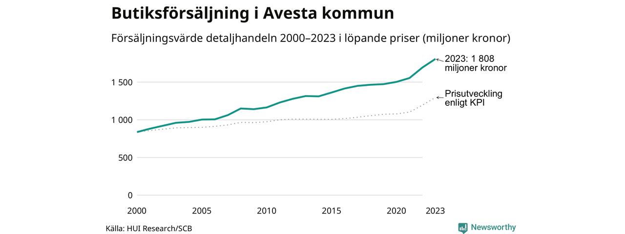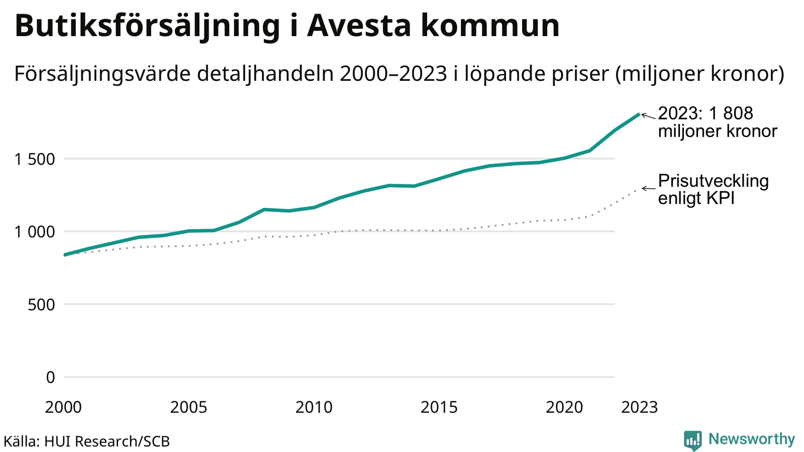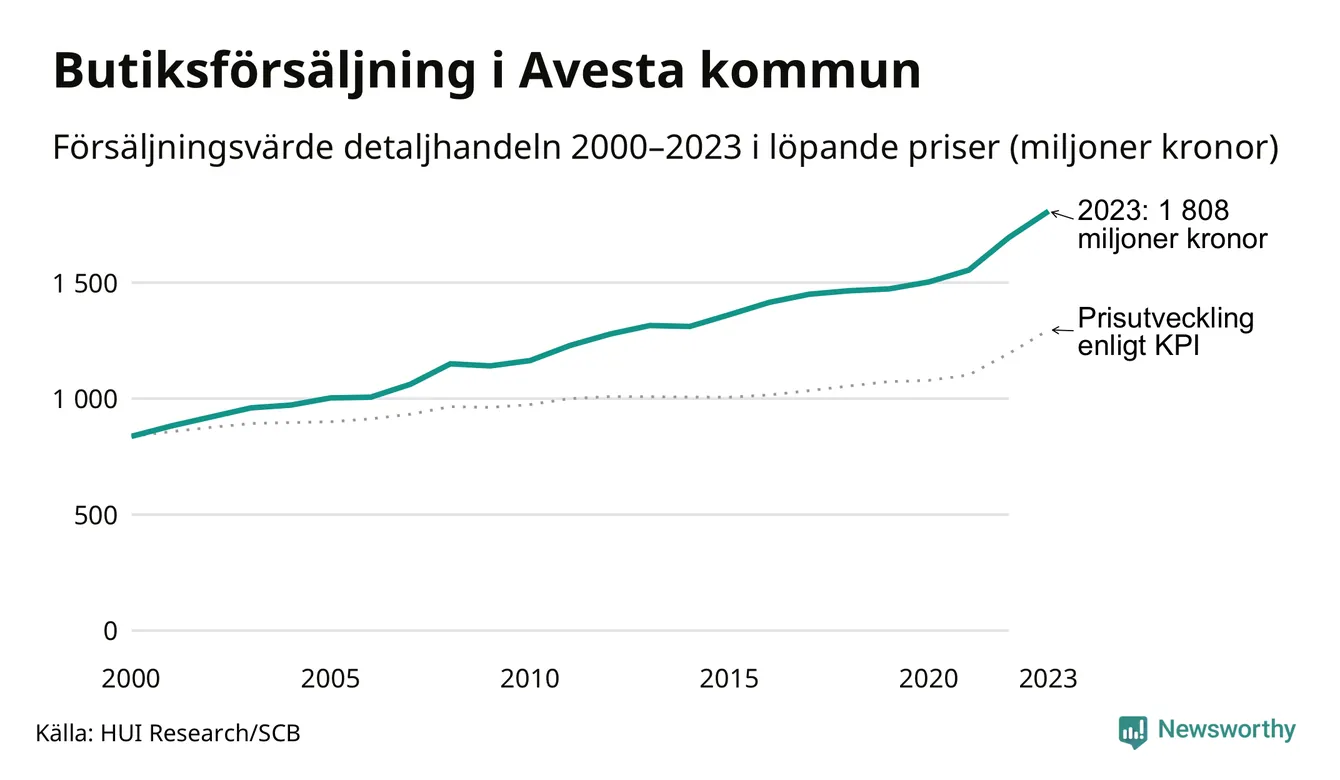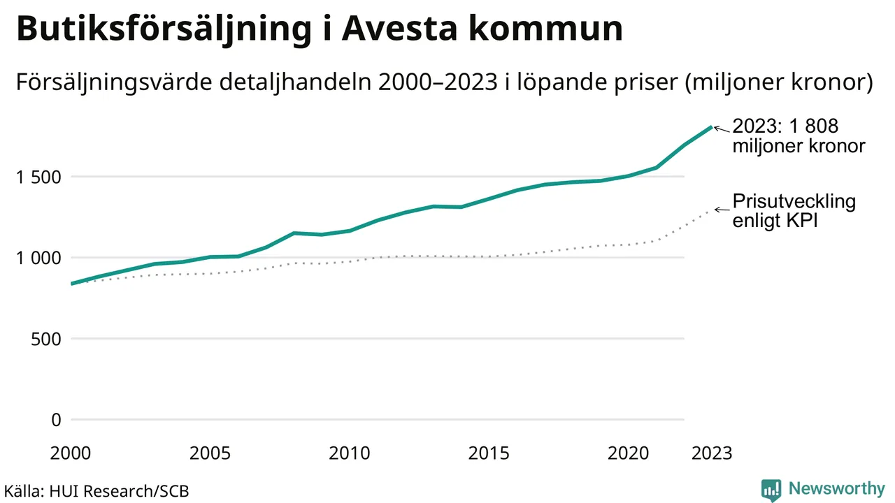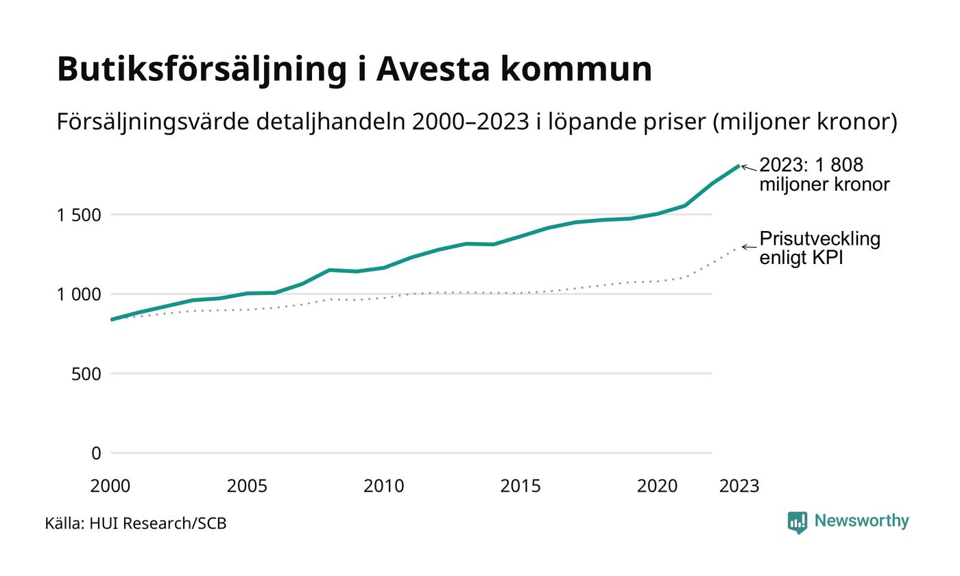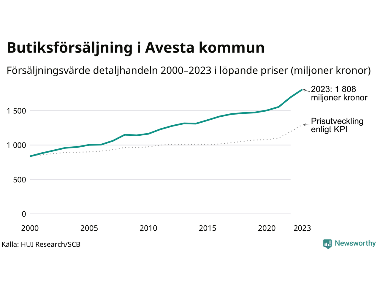 Den totala försäljningen i detaljhandeln i Avesta kommun var 1,8 miljarder kronor under 2023, visar färska siffror från HUI Research. Det är en ökning med 7 procent jämfört med året innan, vilket är mindre än den allmänna prisökningen och räknar man i fast penningvärde är det snarare en minskning på runt 2 procent.