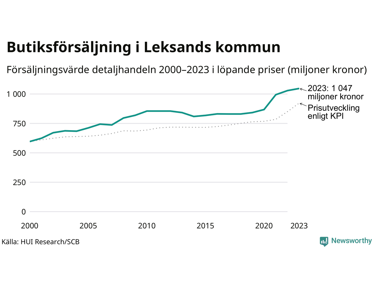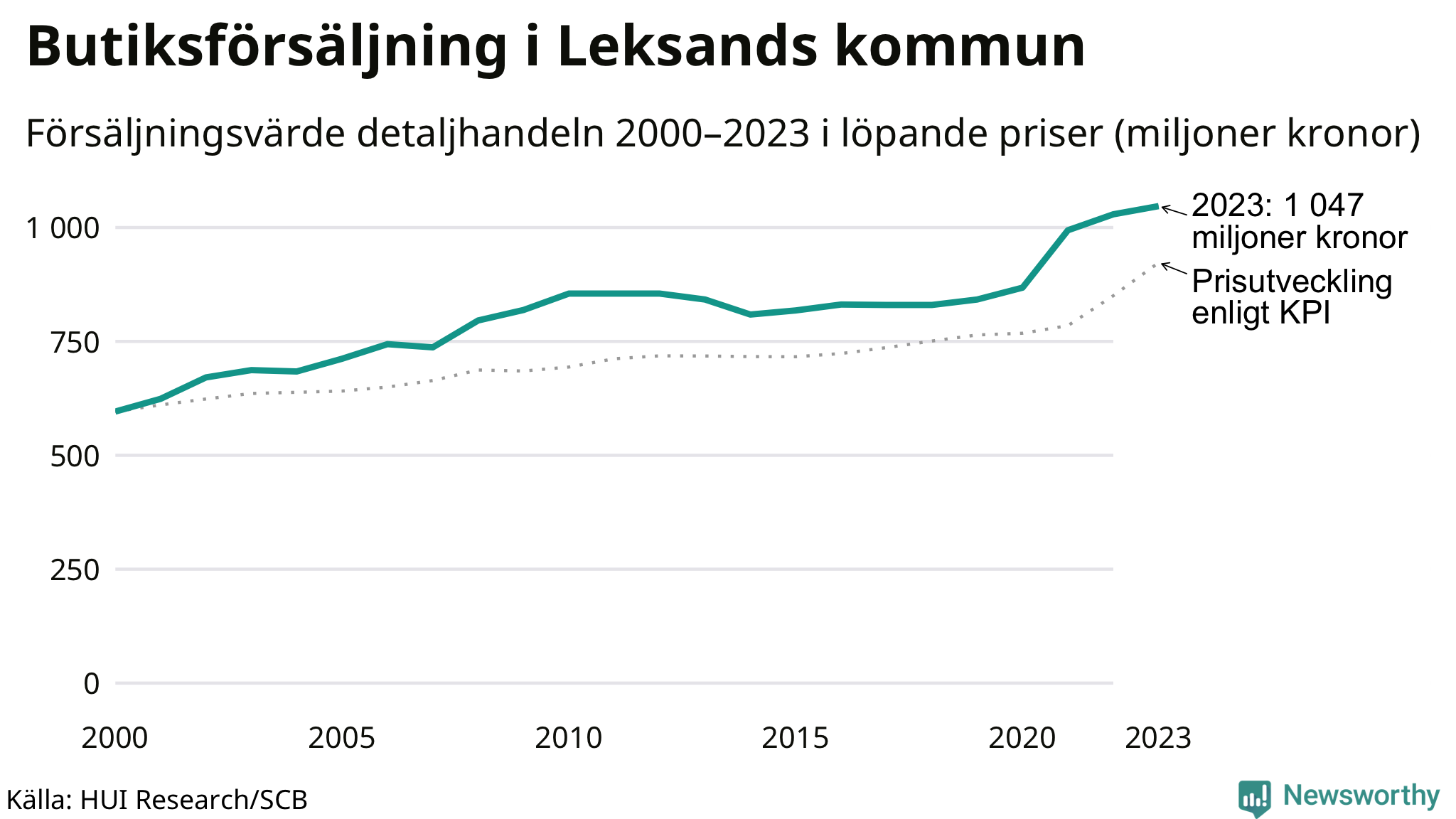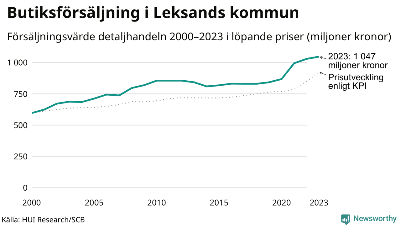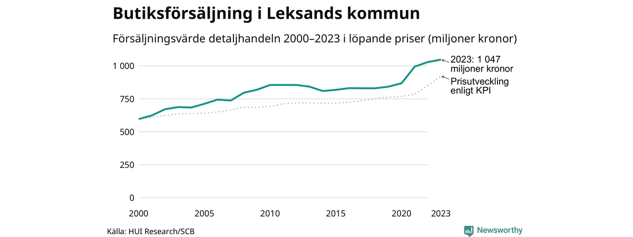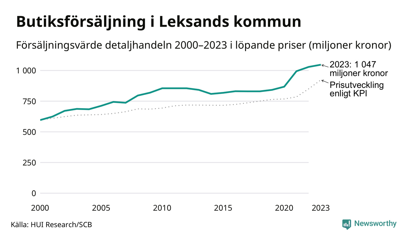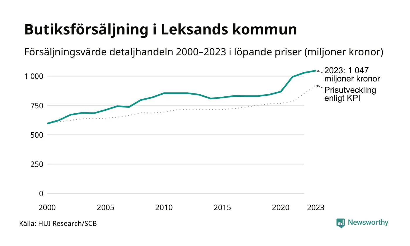 Den totala försäljningen i detaljhandeln i Leksands kommun var 1 miljard kronor under 2023, visar färska siffror från HUI Research. Det är en ökning med 2 procent jämfört med året innan, vilket är mindre än den allmänna prisökningen och räknar man i fast penningvärde är det snarare en minskning på runt 6 procent.