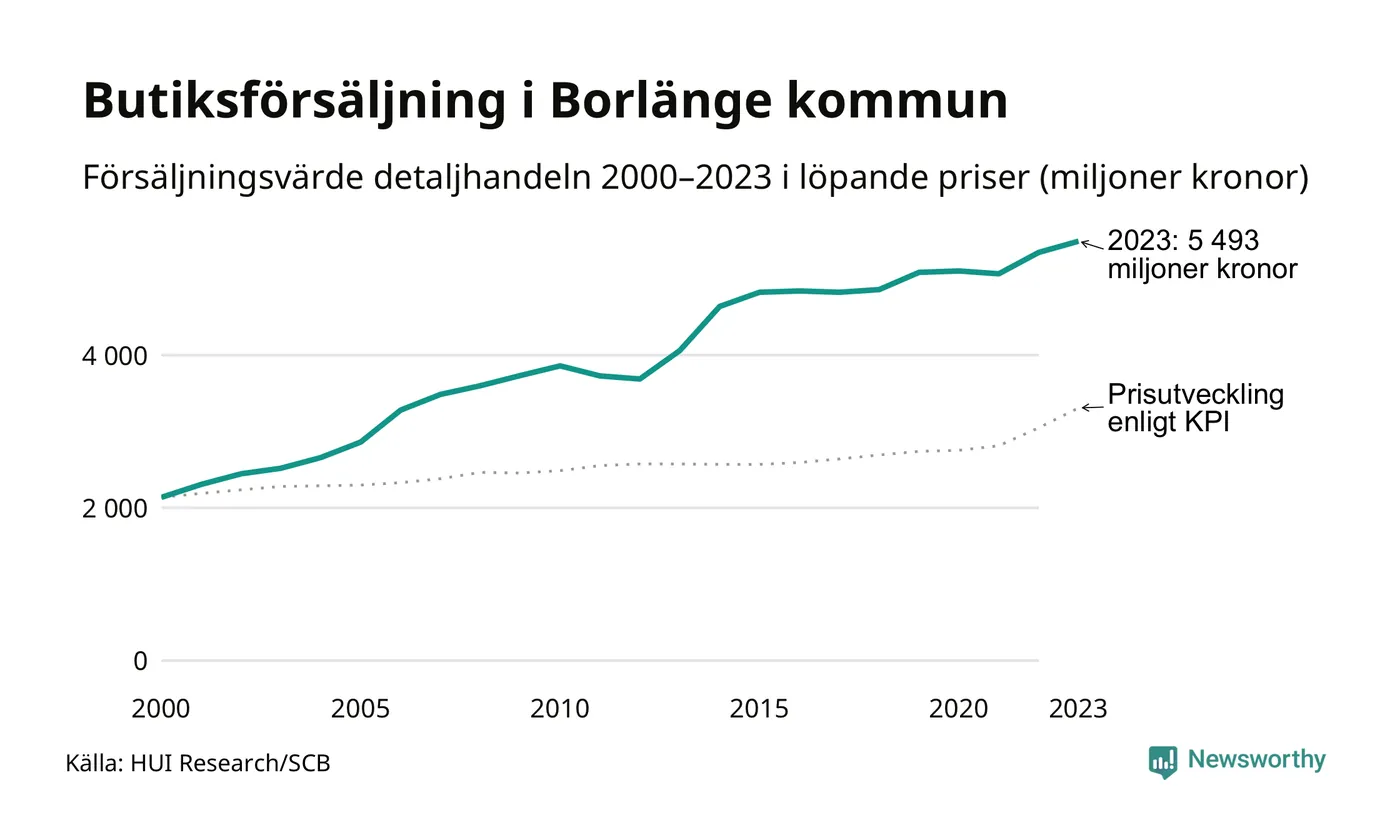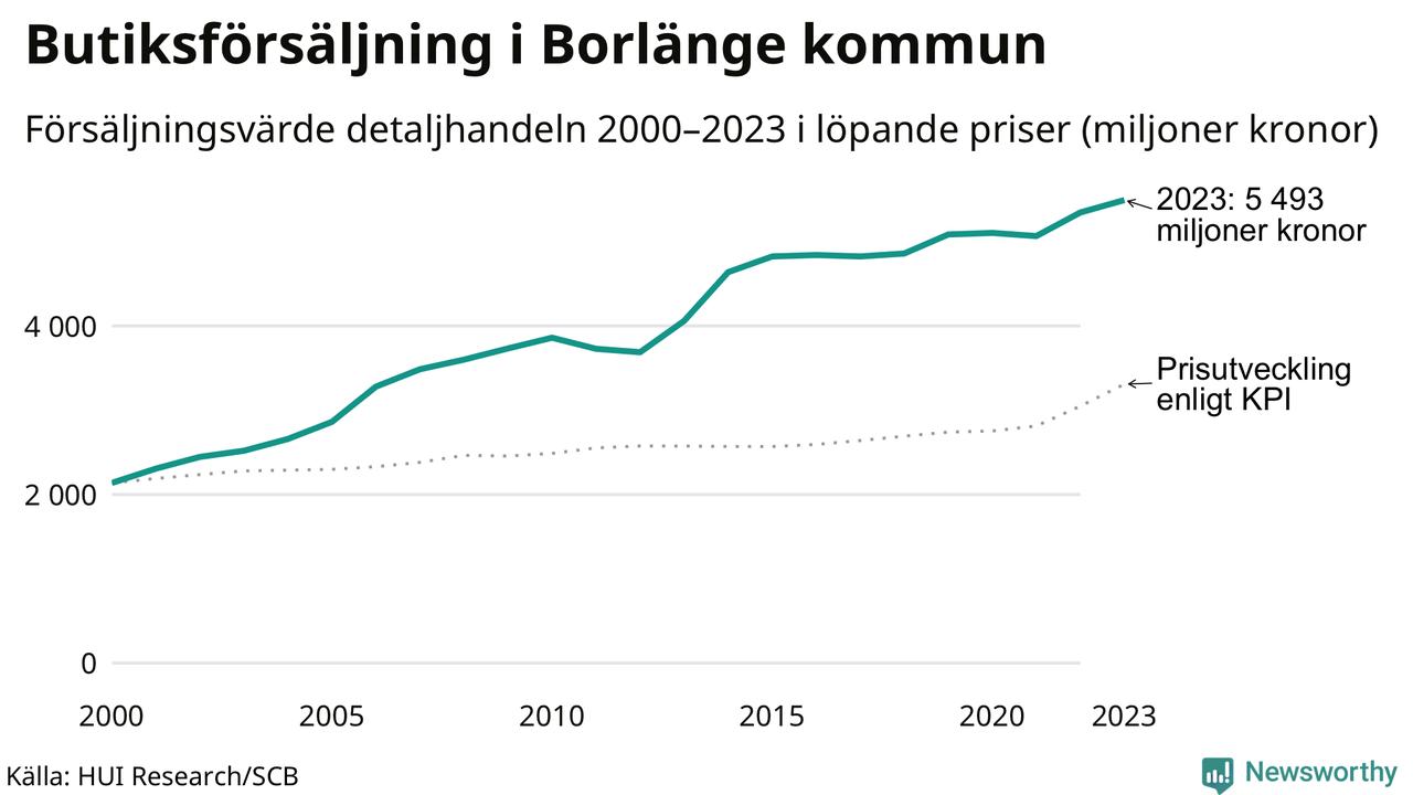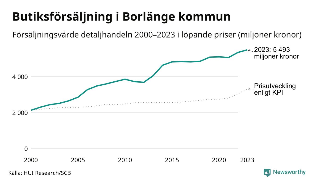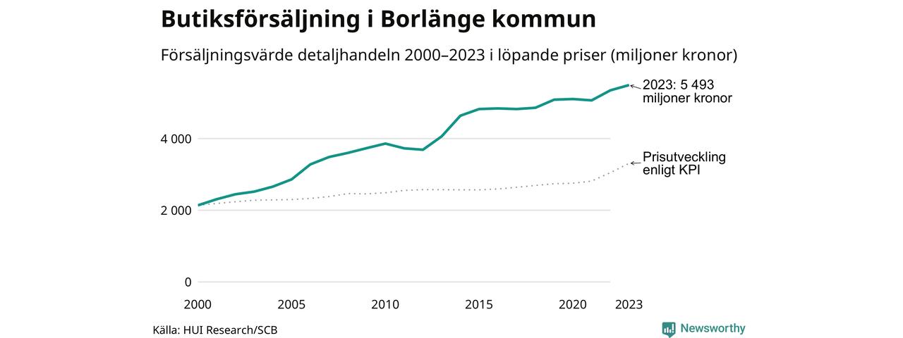 Sedan millennieskiftet har butiksförsäljningen i Borlänge blivit större. Med hänsyn tagen till inflationen har försäljningsvärdet ökat med 66 procent jämfört med år 2000 och jämfört med för tio år sedan har det ökat med 5 procent.