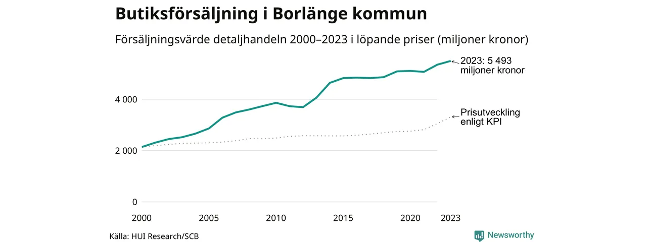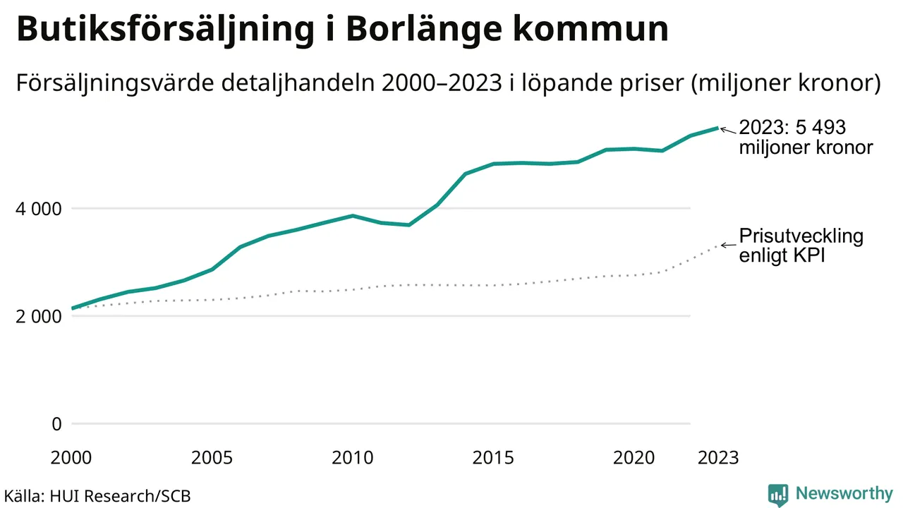 Den totala försäljningen i detaljhandeln i Borlänge kommun var 5,5 miljarder kronor under 2023, visar färska siffror från HUI Research. Det är en ökning med 3 procent jämfört med året innan, vilket är mindre än den allmänna prisökningen och räknar man i fast penningvärde är det snarare en minskning på runt 5 procent.