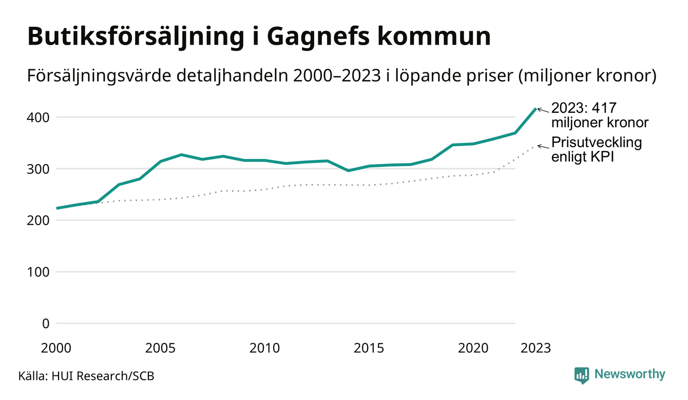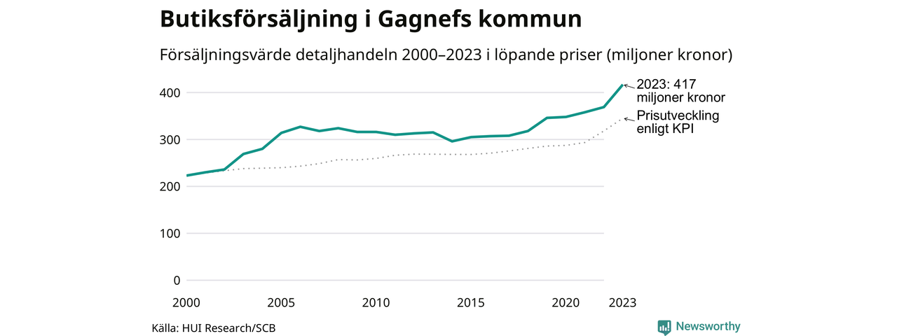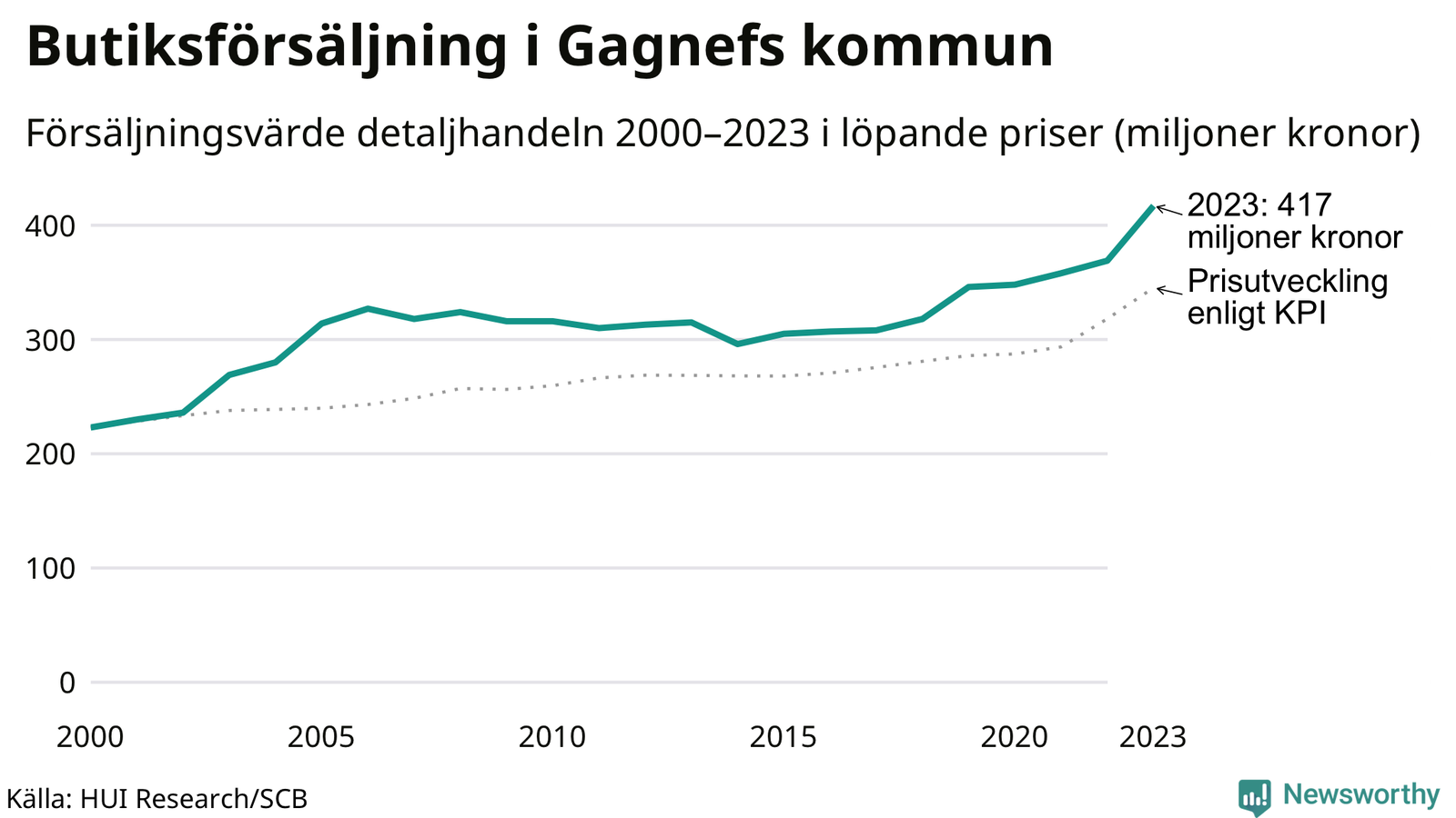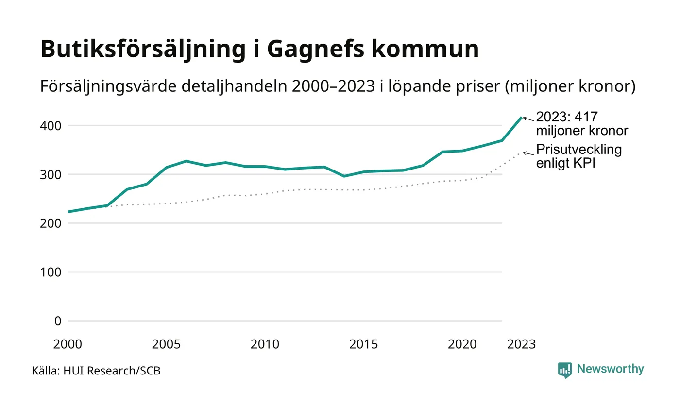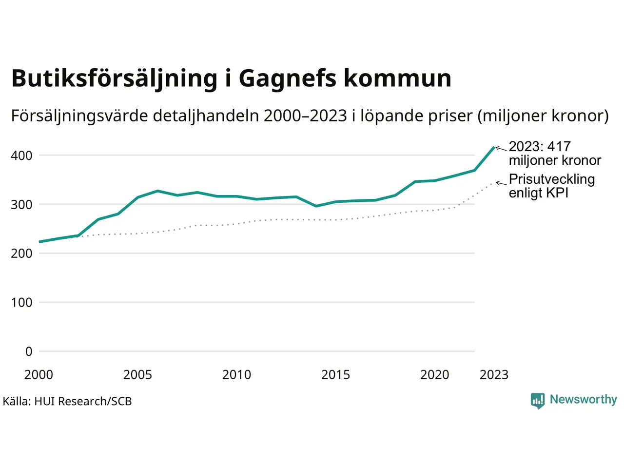 Den totala försäljningen i detaljhandeln i Gagnefs kommun var 417 miljoner kronor under 2023, visar färska siffror från HUI Research. Det är en ökning med 13 procent jämfört med året innan, vilket är en ökning även om man tar hänsyn till den allmänna prisökningen under året.