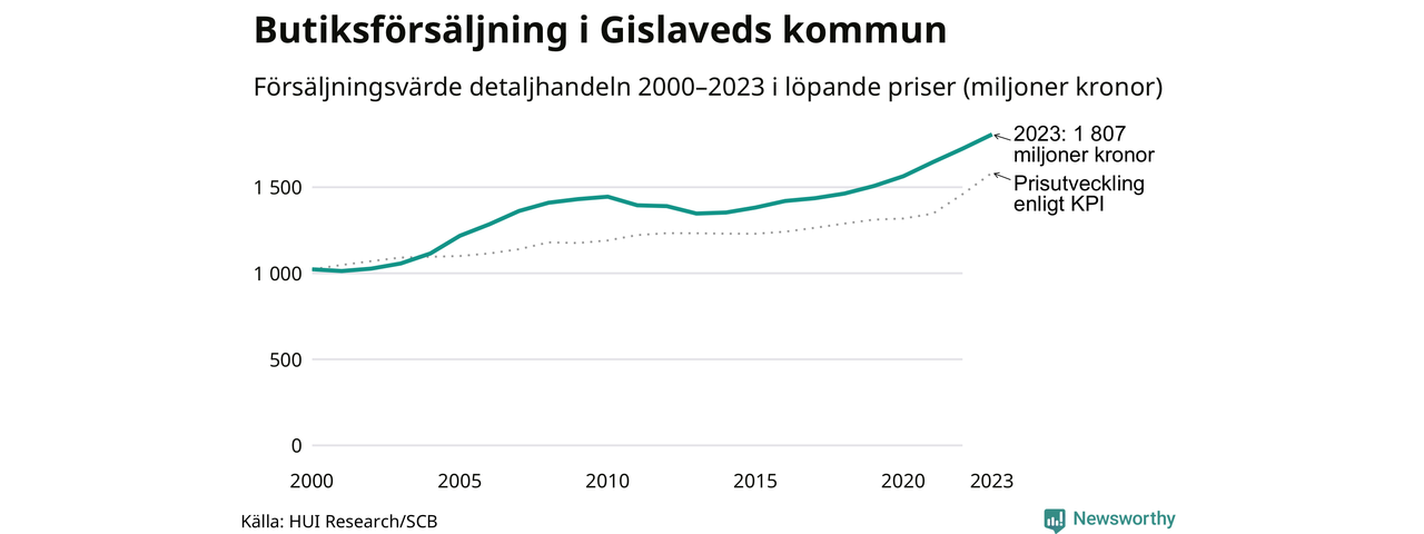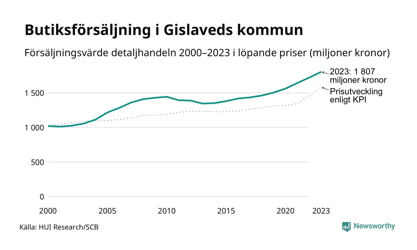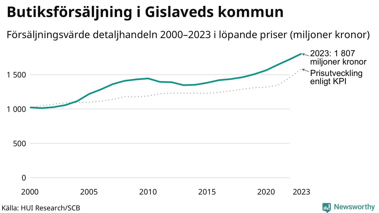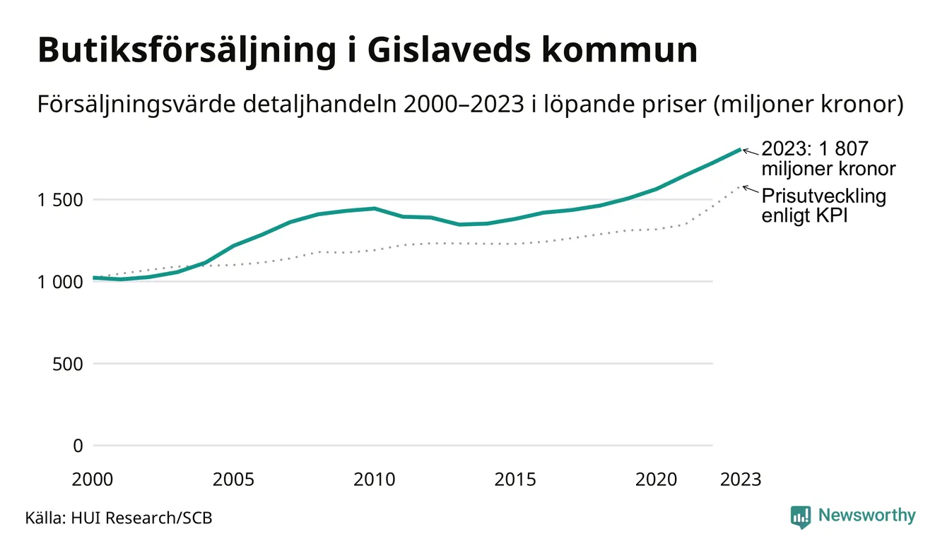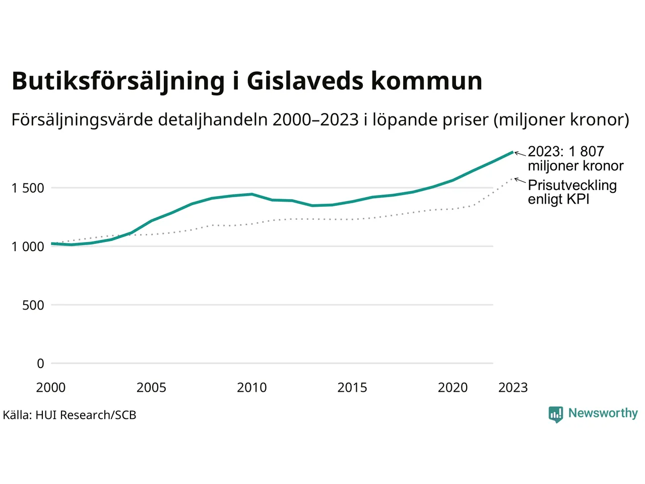 Den totala försäljningen i detaljhandeln i Gislaveds kommun var 1,8 miljarder kronor under 2023, visar färska siffror från HUI Research. Det är en ökning med 5 procent jämfört med året innan, vilket är mindre än den allmänna prisökningen och räknar man i fast penningvärde är det snarare en minskning på runt 3 procent.