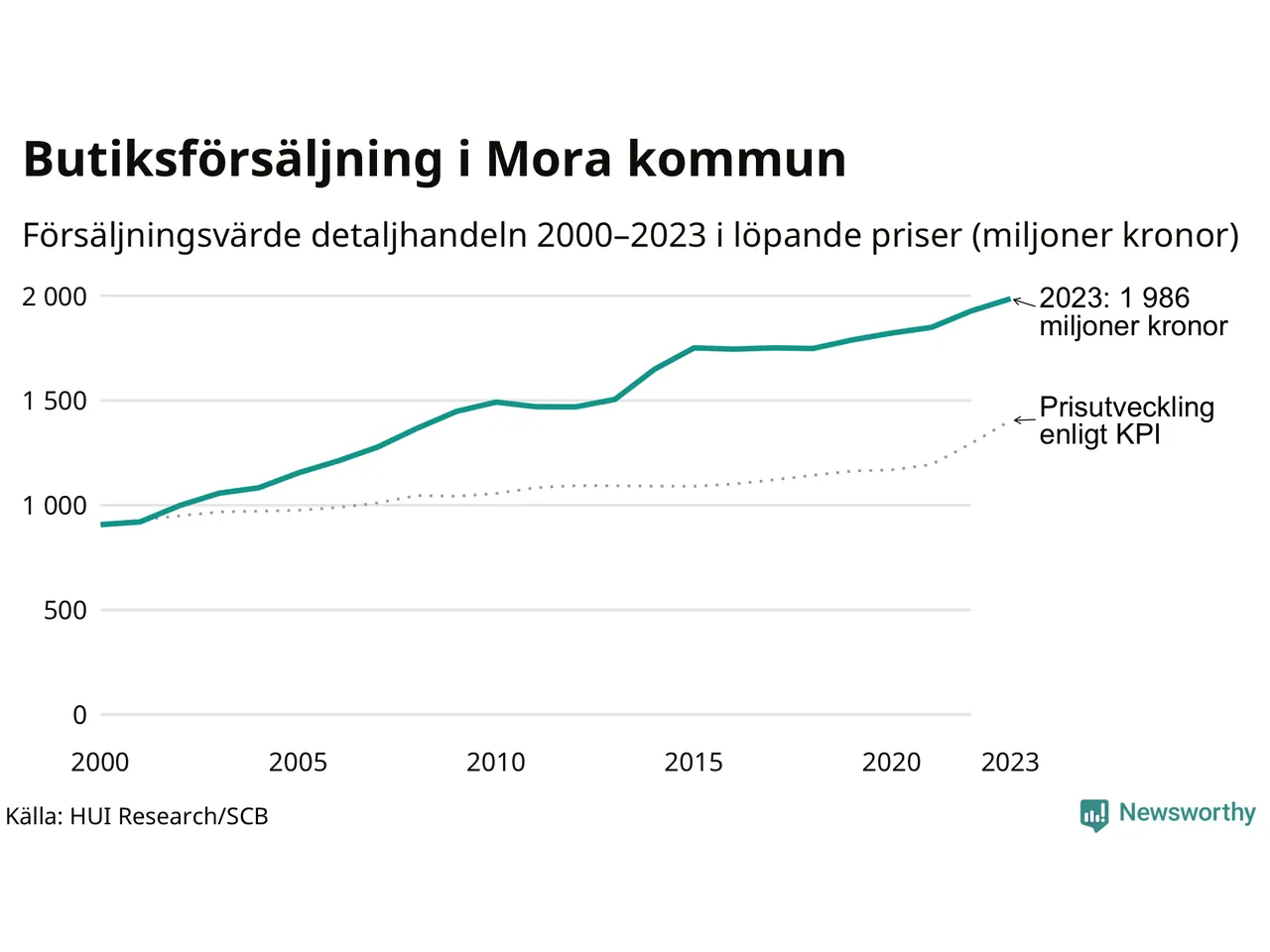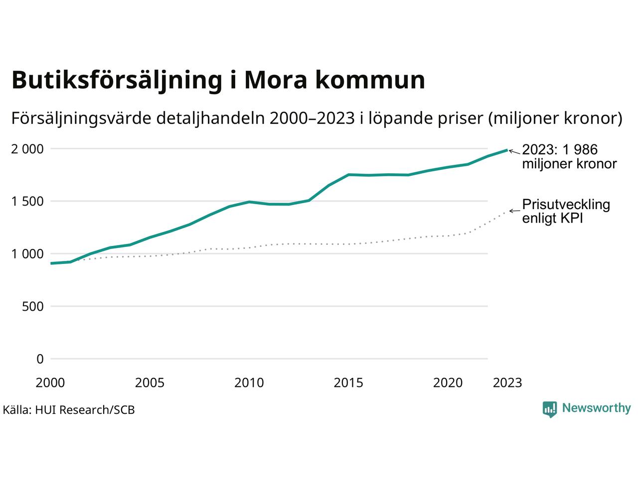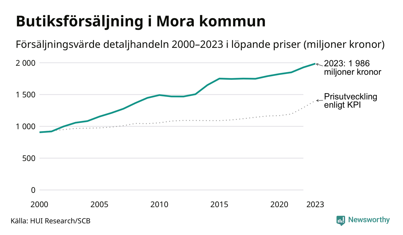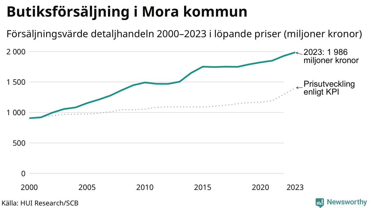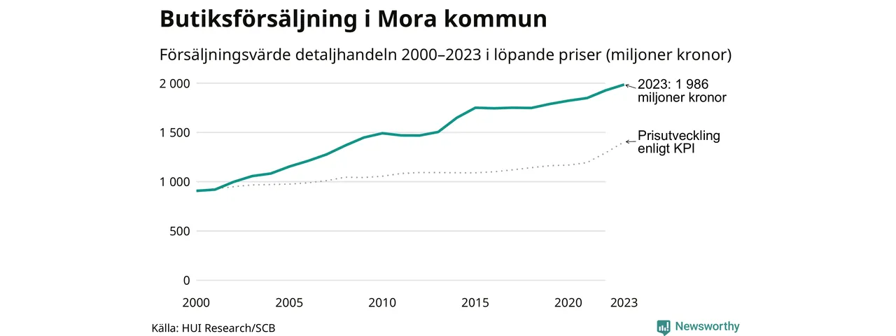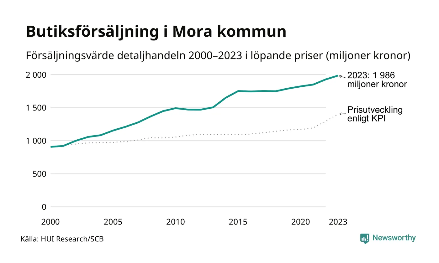 Den totala försäljningen i detaljhandeln i Mora kommun var 2 miljarder kronor under 2023, visar färska siffror från HUI Research. Det är en ökning med 3 procent jämfört med året innan, vilket är mindre än den allmänna prisökningen och räknar man i fast penningvärde är det snarare en minskning på runt 5 procent.