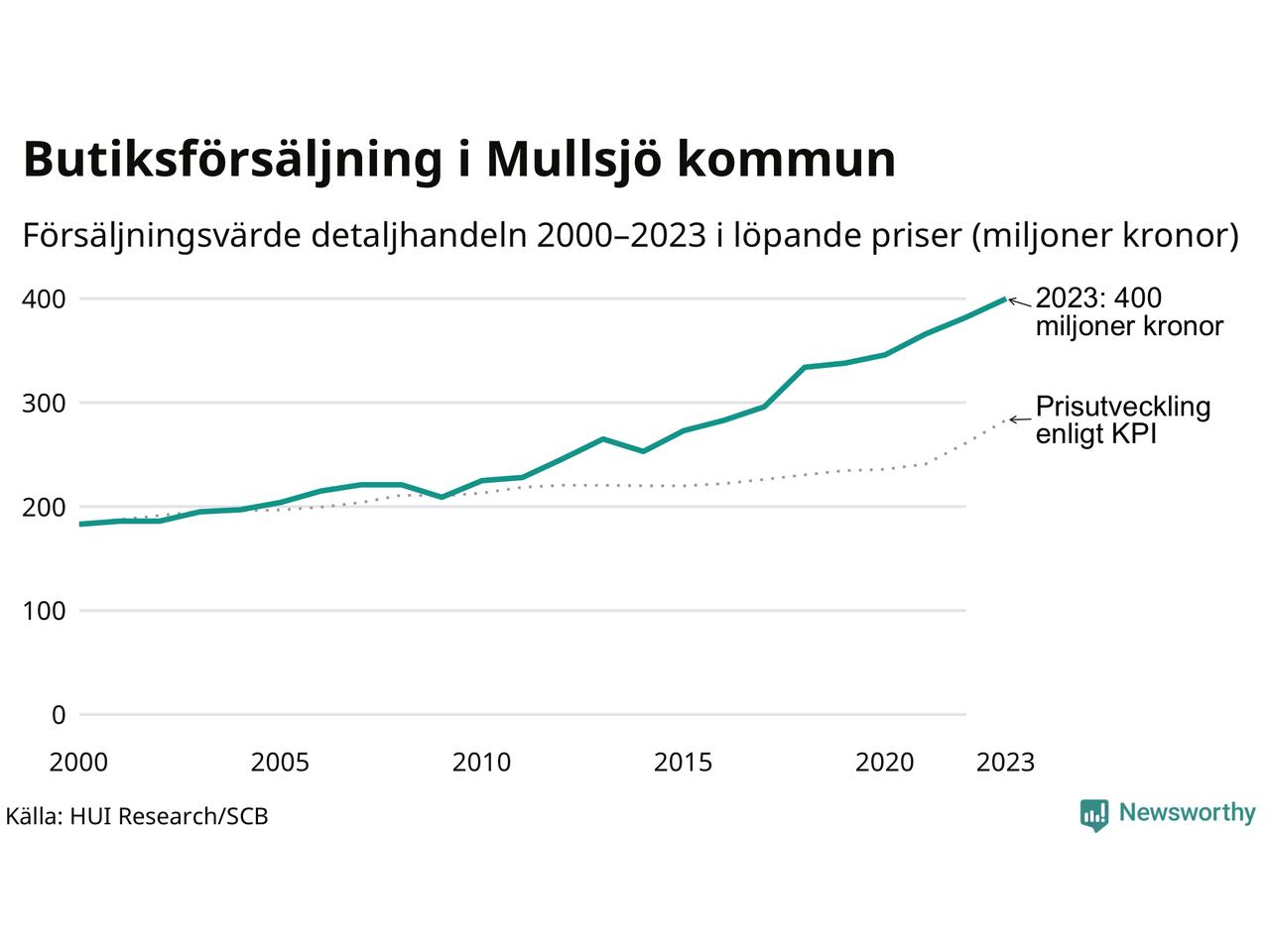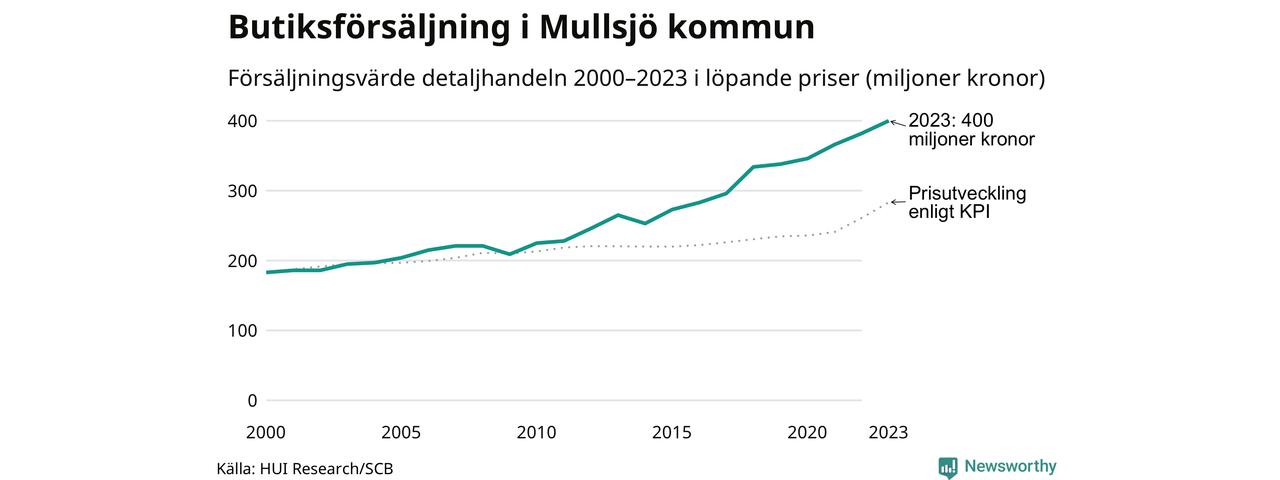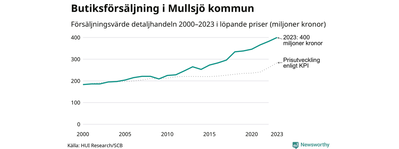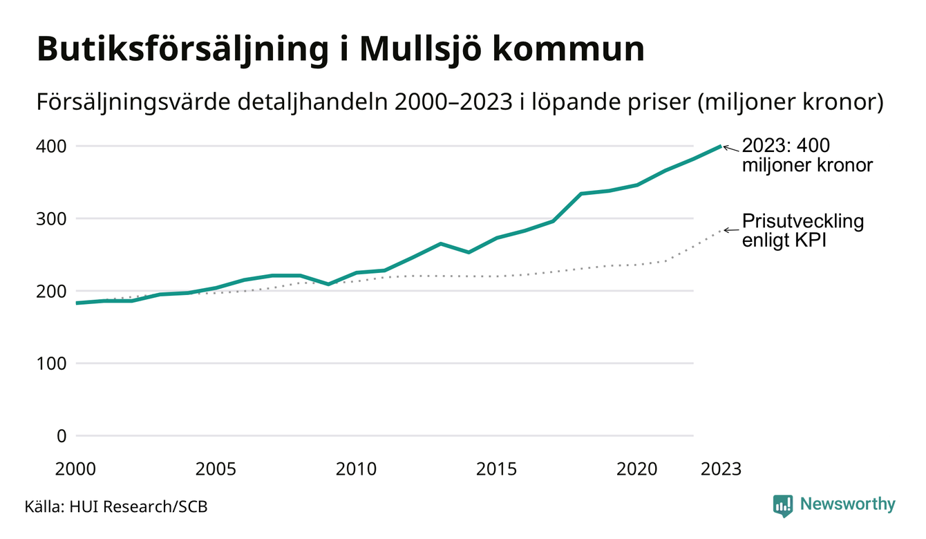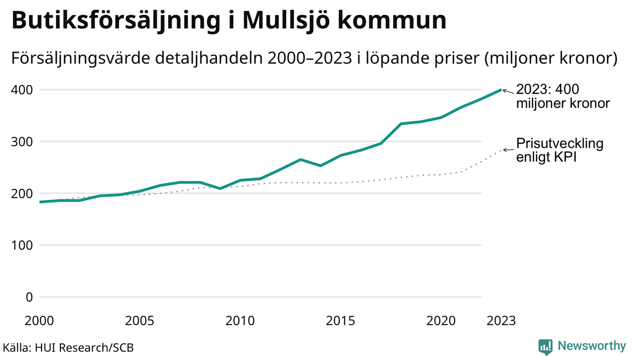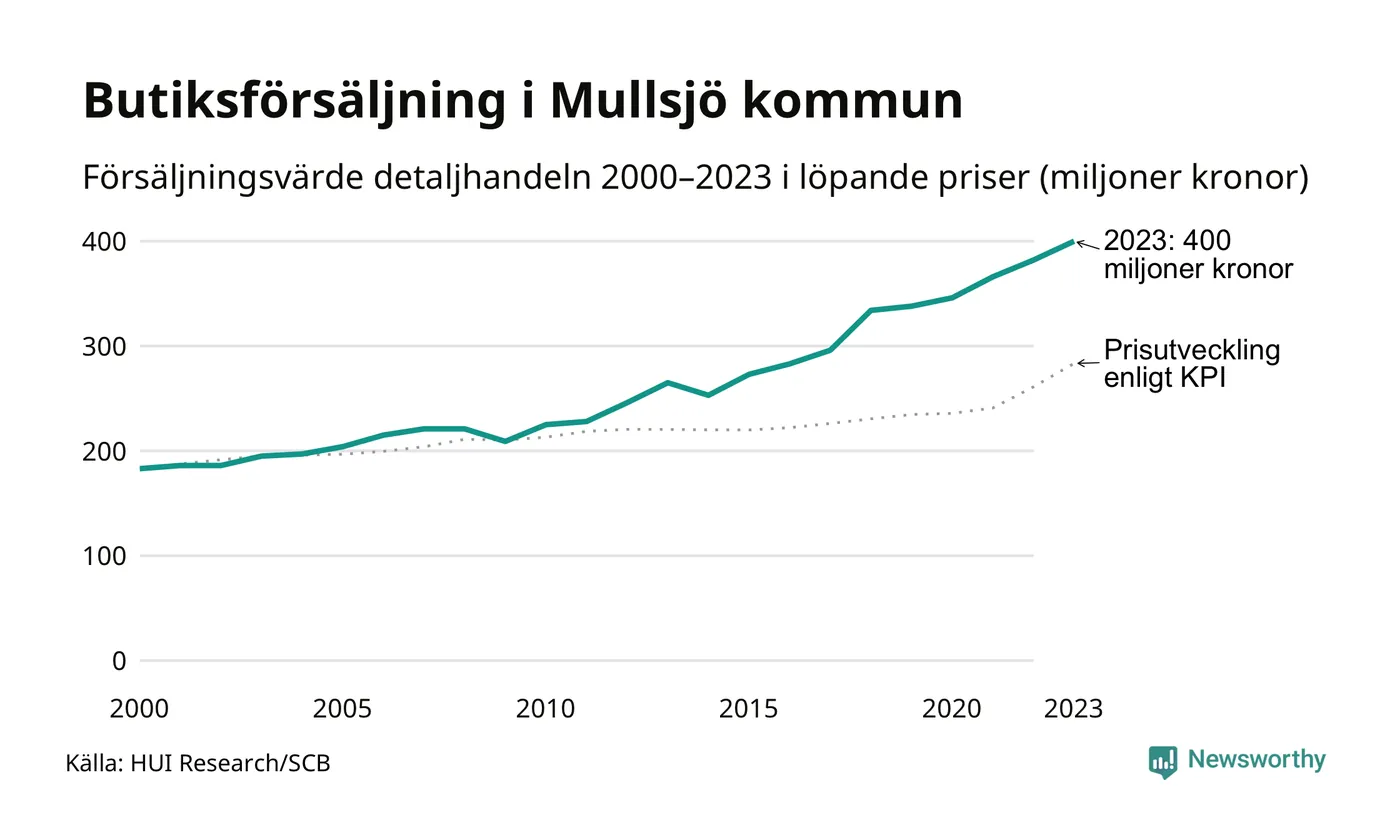 Den totala försäljningen i detaljhandeln i Mullsjö kommun var 400 miljoner kronor under 2023, visar färska siffror från HUI Research. Det är en ökning med 5 procent jämfört med året innan, vilket är mindre än den allmänna prisökningen och räknar man i fast penningvärde är det snarare en minskning på runt 4 procent.