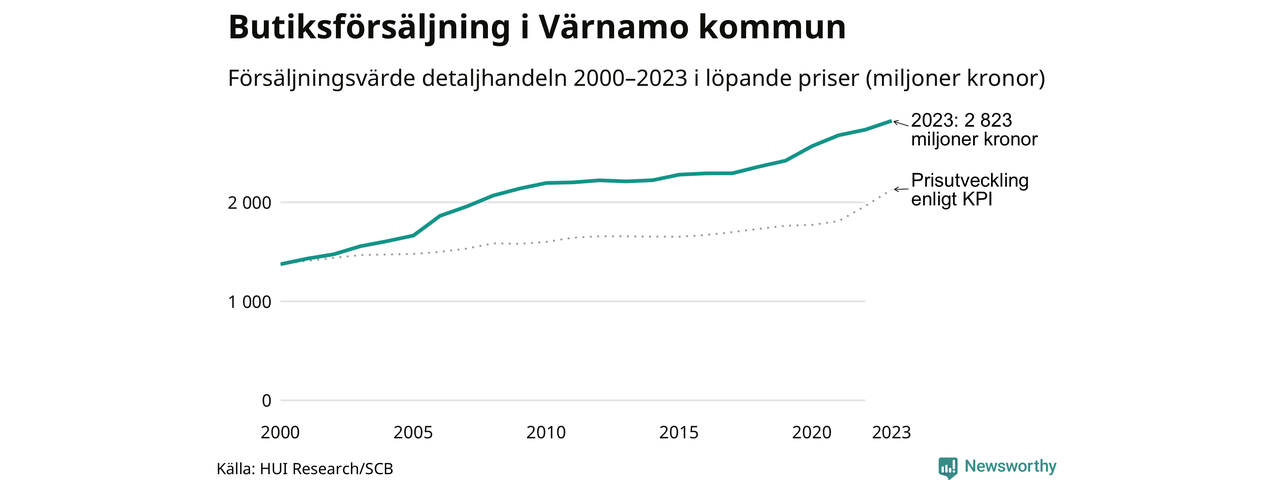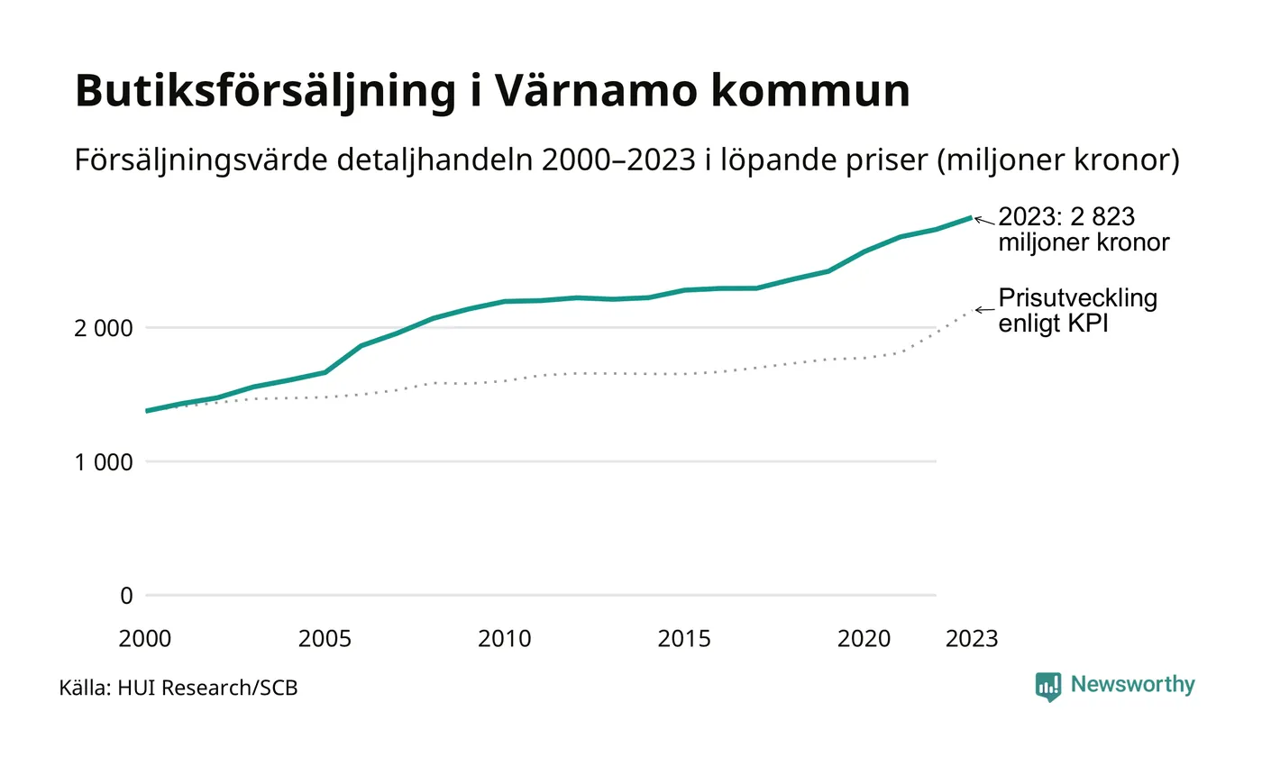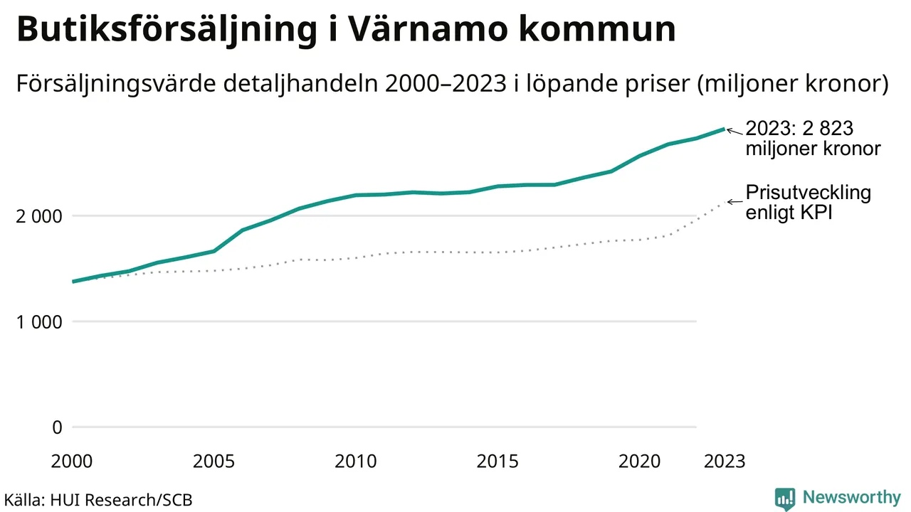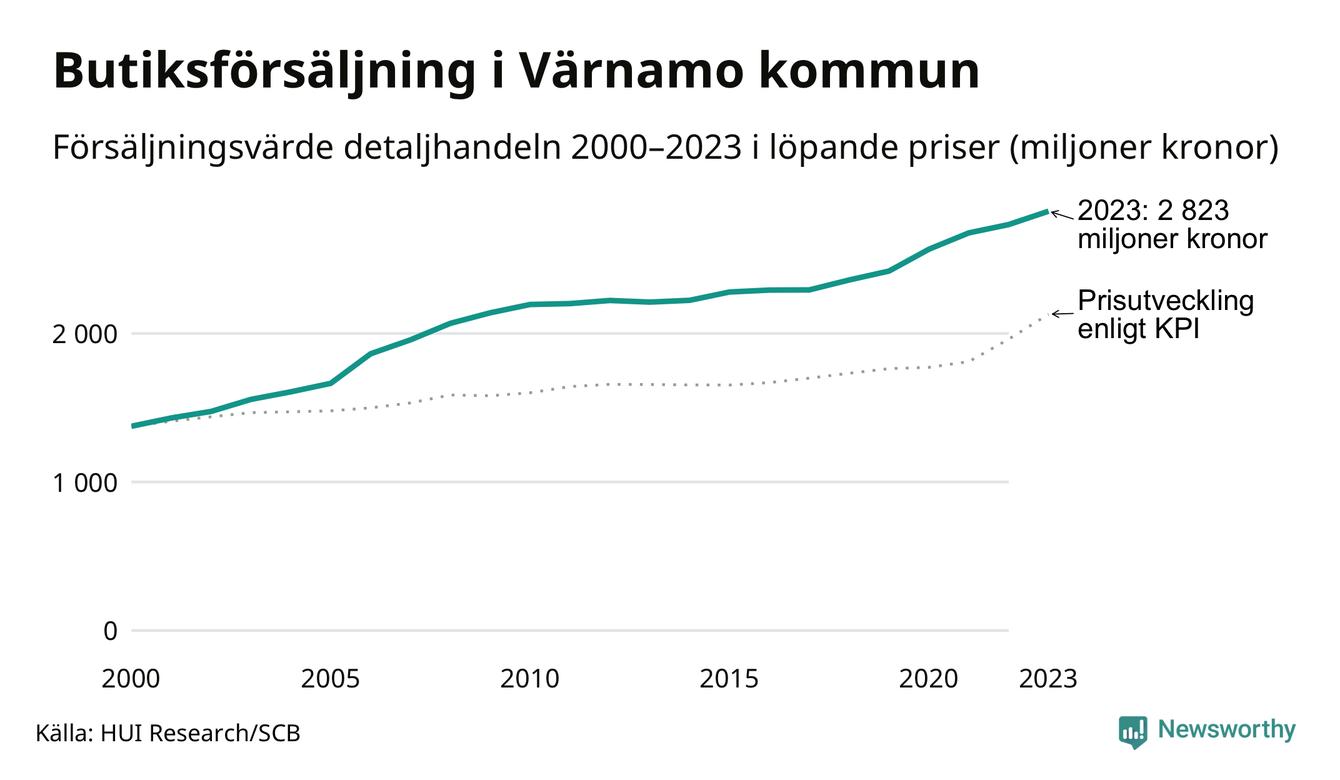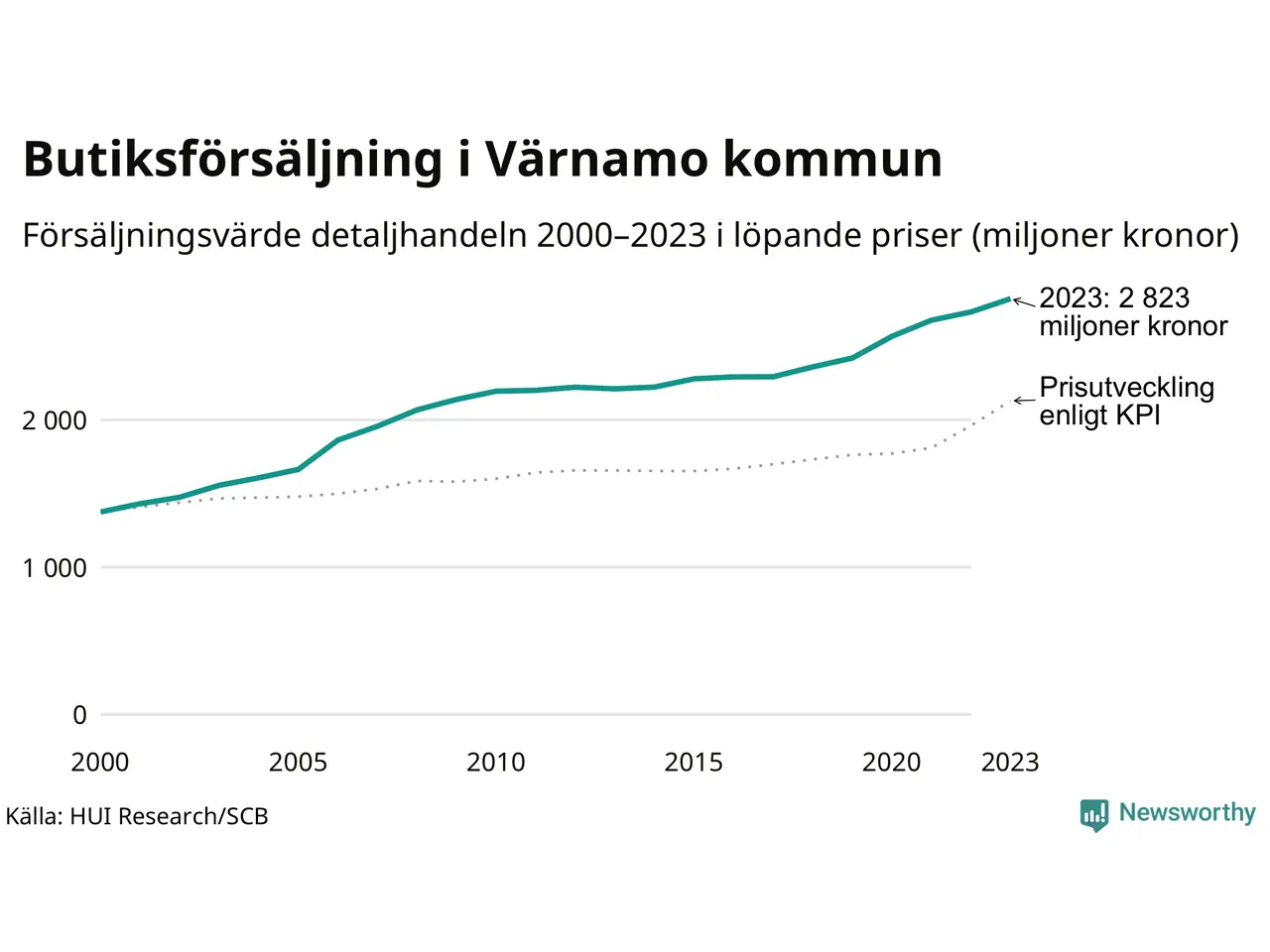 Den totala försäljningen i detaljhandeln i Värnamo kommun var 2,8 miljarder kronor under 2023, visar färska siffror från HUI Research. Det är en ökning med 3 procent jämfört med året innan, vilket är mindre än den allmänna prisökningen och räknar man i fast penningvärde är det snarare en minskning på runt 5 procent.