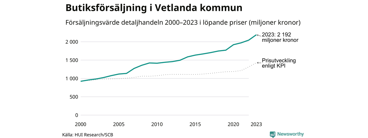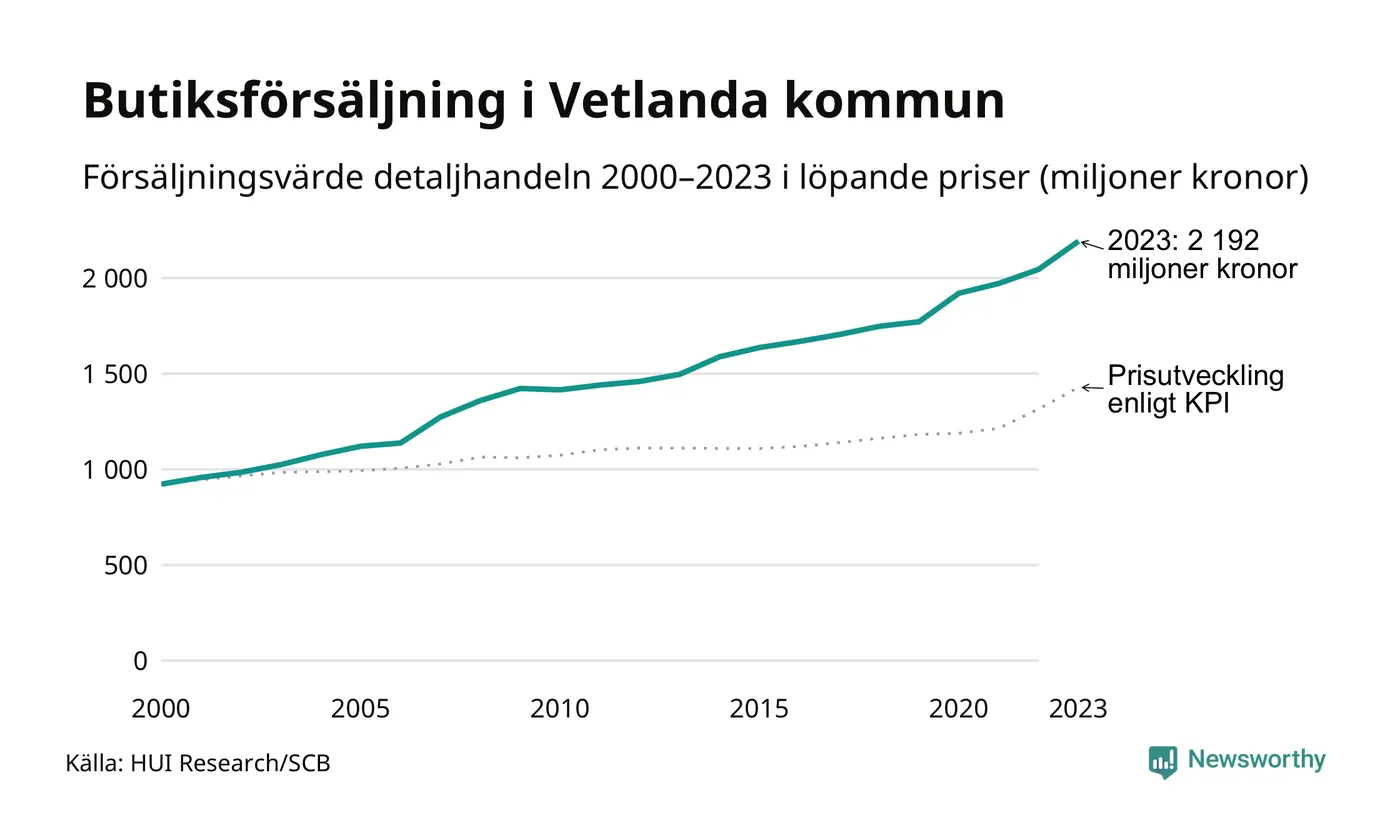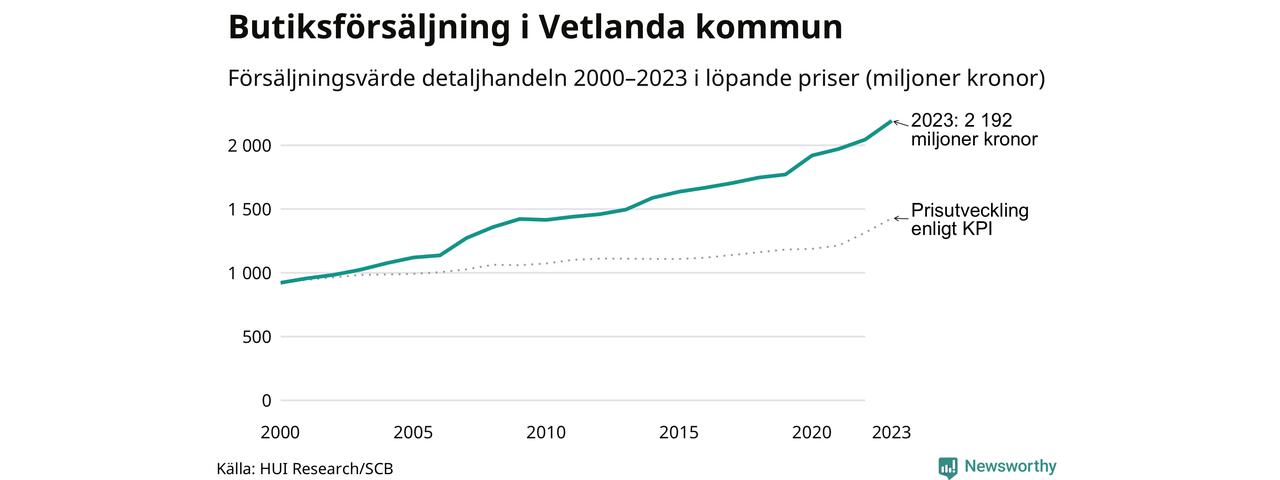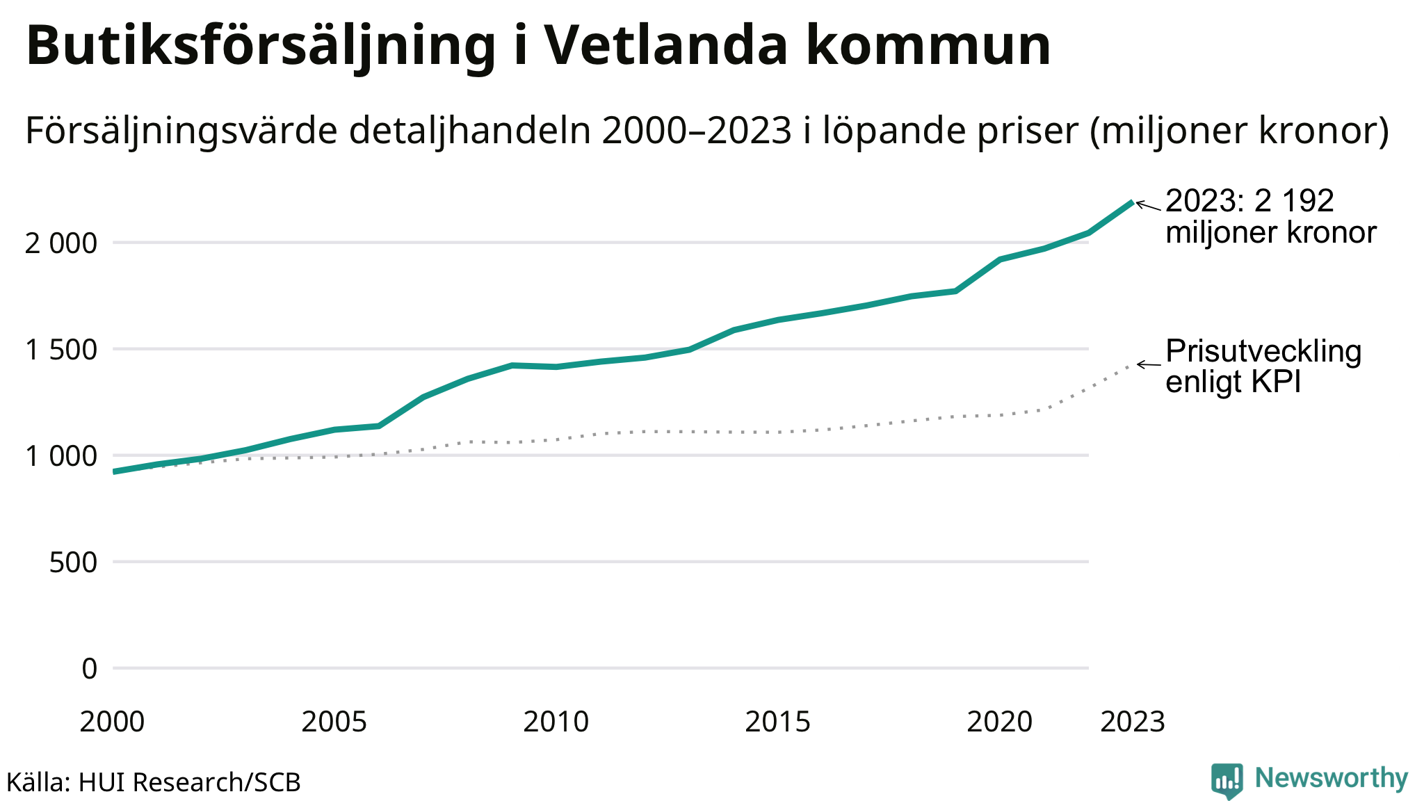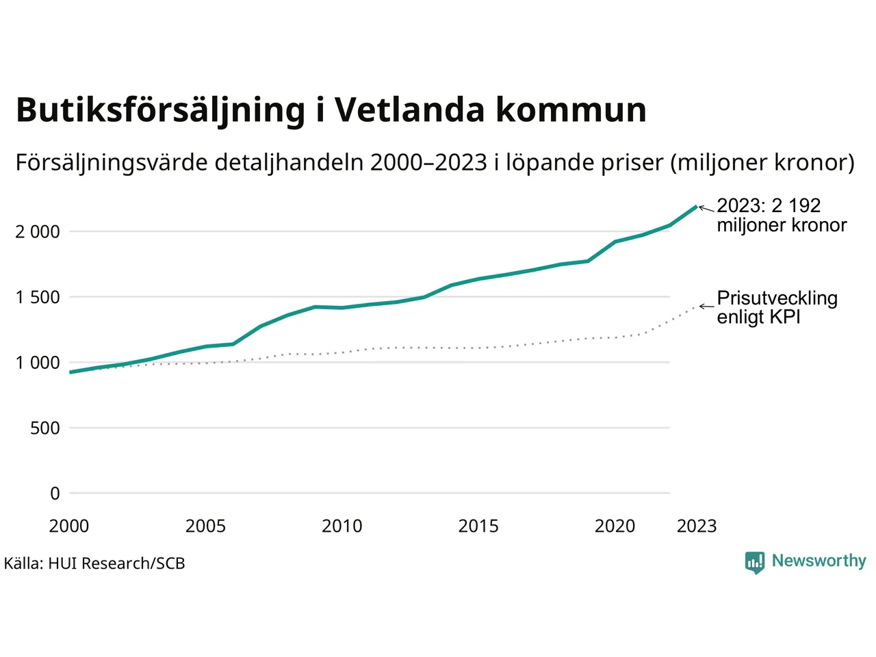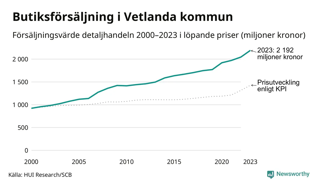 Den totala försäljningen i detaljhandeln i Vetlanda kommun var 2,2 miljarder kronor under 2023, visar färska siffror från HUI Research. Det är en ökning med 7 procent jämfört med året innan, vilket är mindre än den allmänna prisökningen och räknar man i fast penningvärde är det snarare en minskning på runt 1 procent.