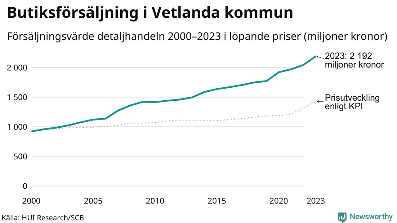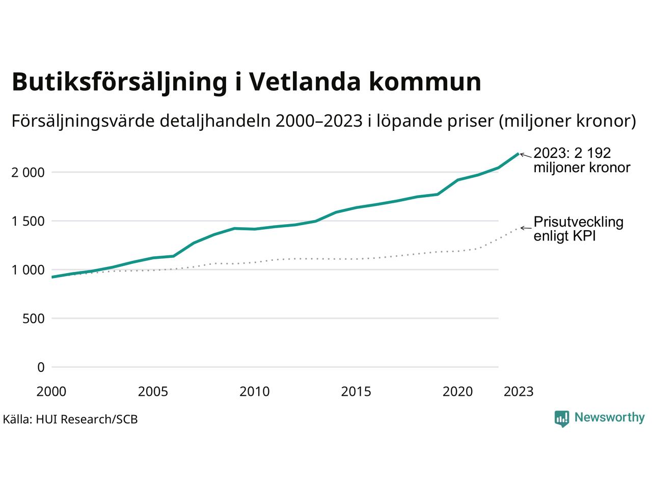 Sedan millennieskiftet har butiksförsäljningen i Vetlanda blivit större. Med hänsyn tagen till inflationen har försäljningsvärdet ökat med 54 procent jämfört med år 2000 och jämfört med för tio år sedan har det ökat med 14 procent.