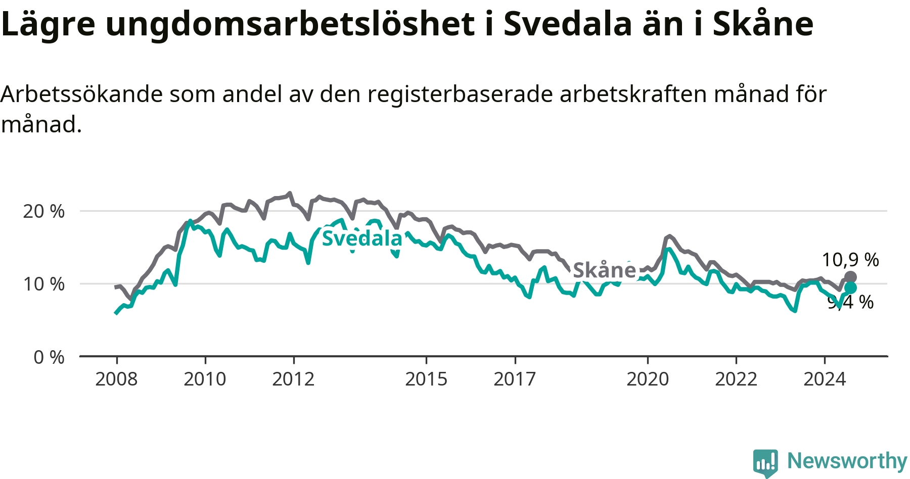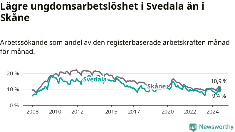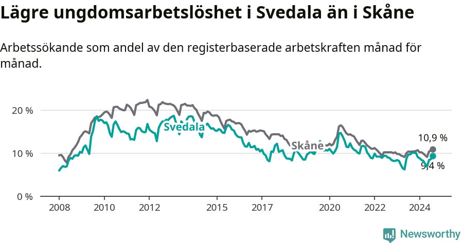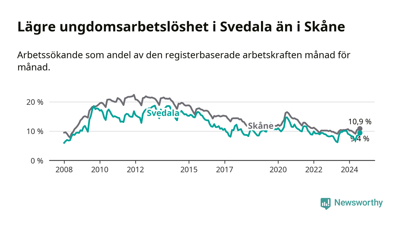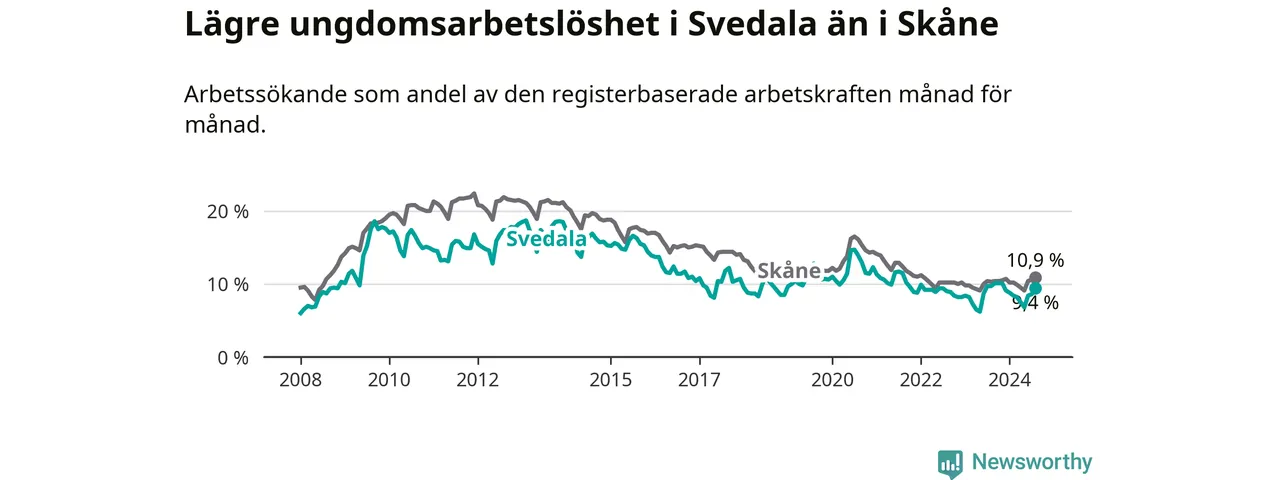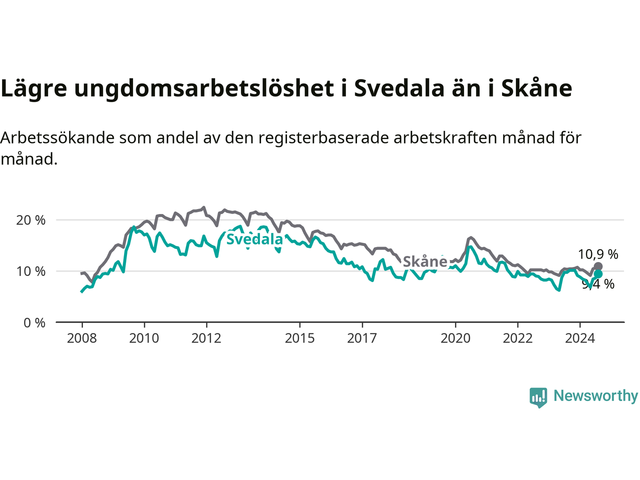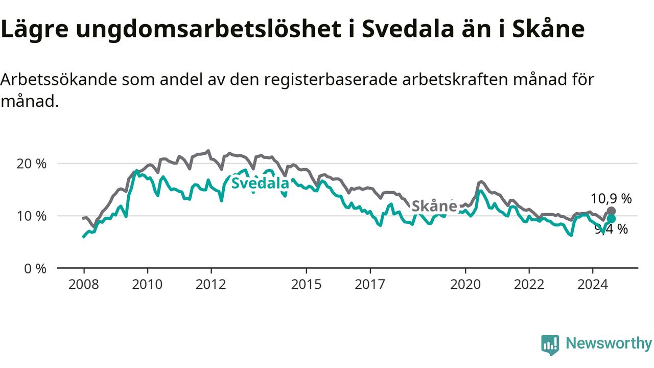 Precis som den totala arbetslösheten ligger ungdomsarbetslösheten i Svedala lägre än i Skåne som helhet. Skillnaden mellan kommunen och länet är 1,5 procentenheter.