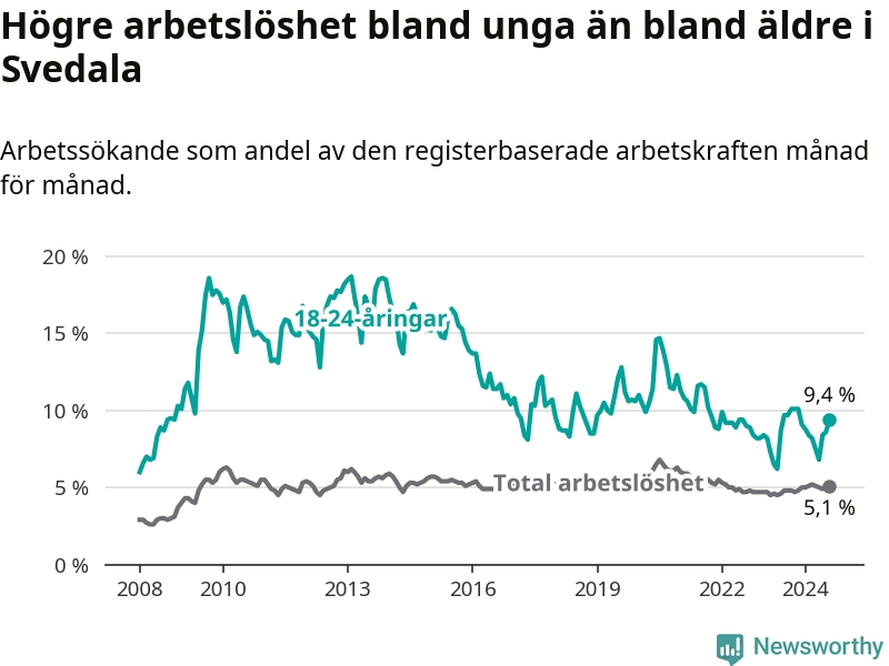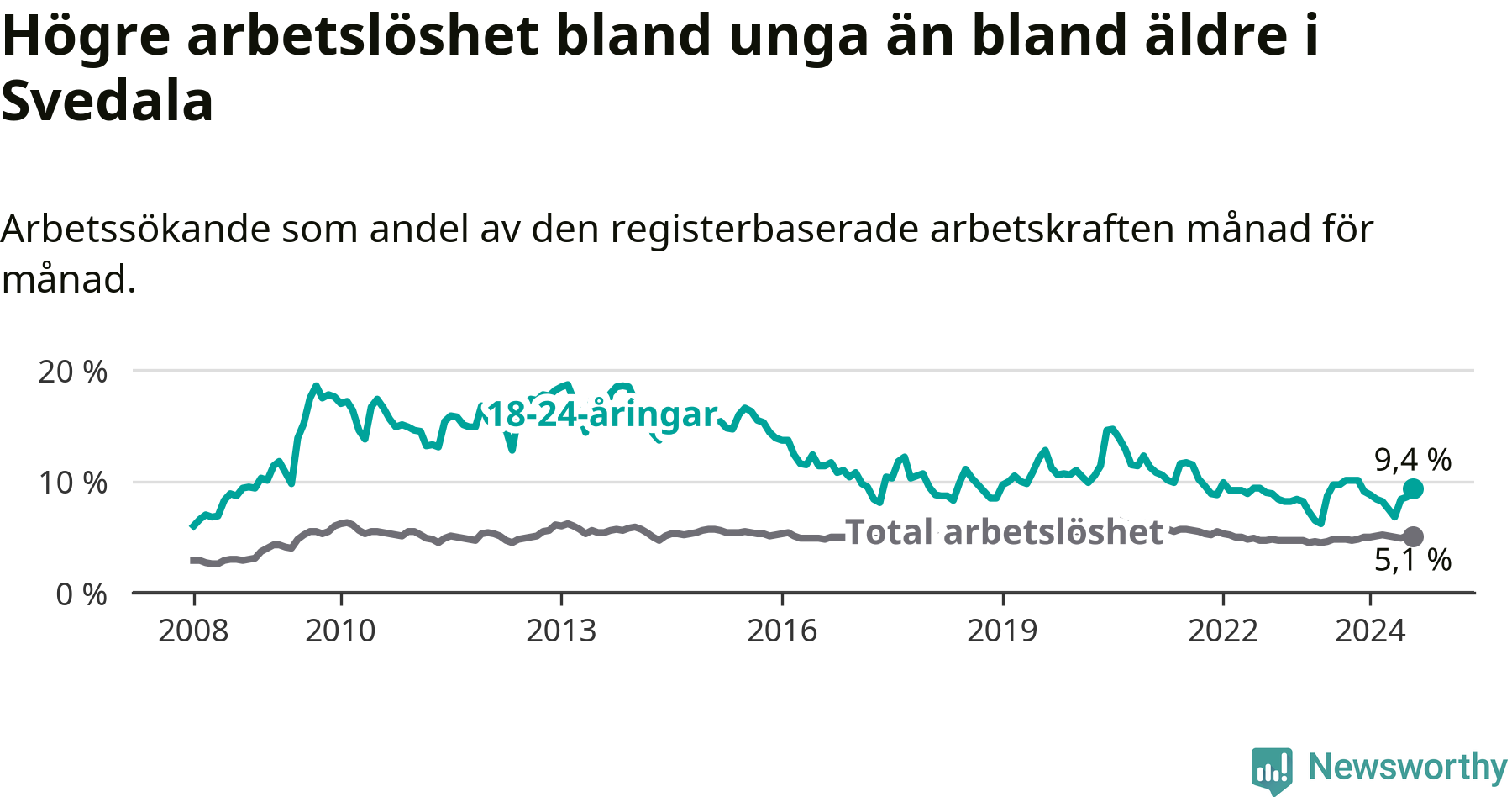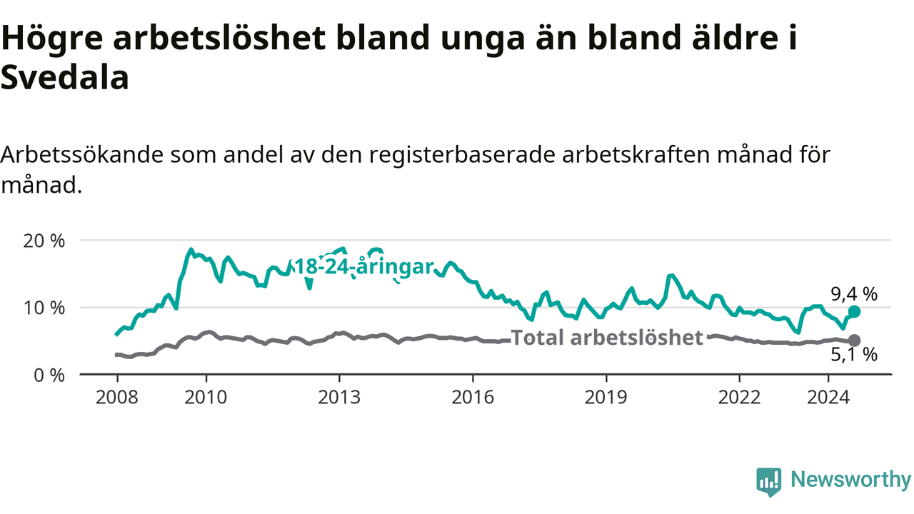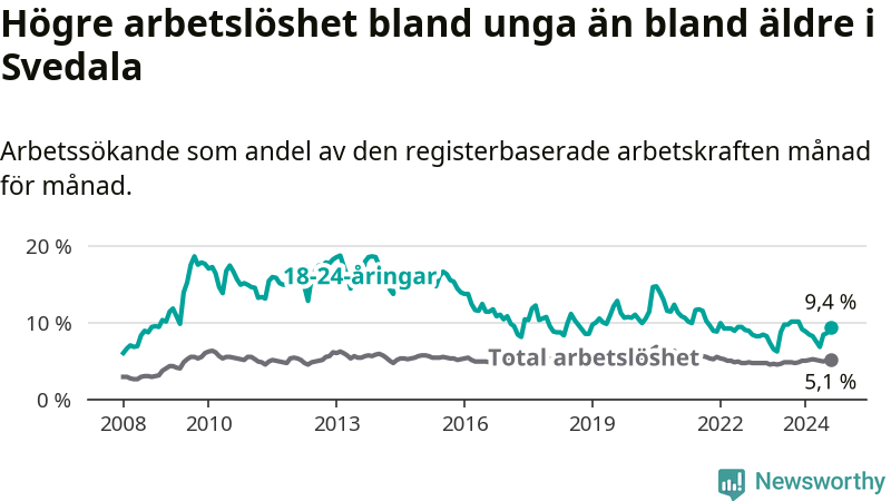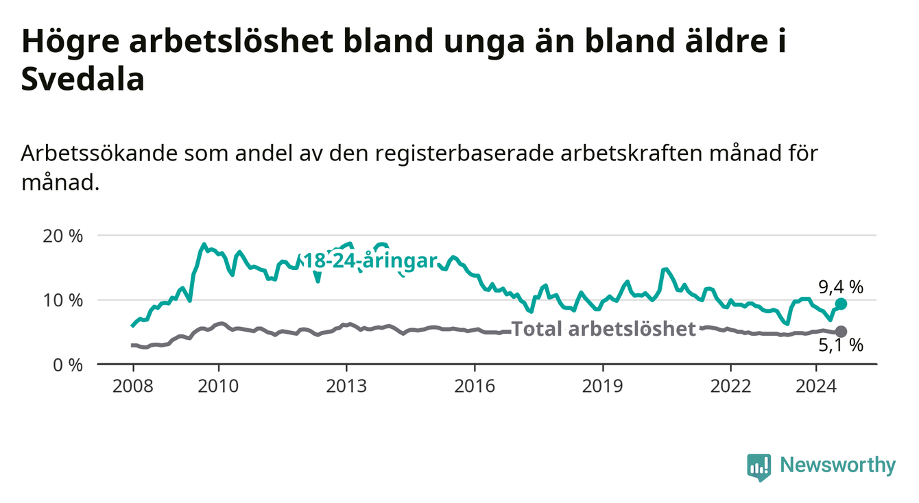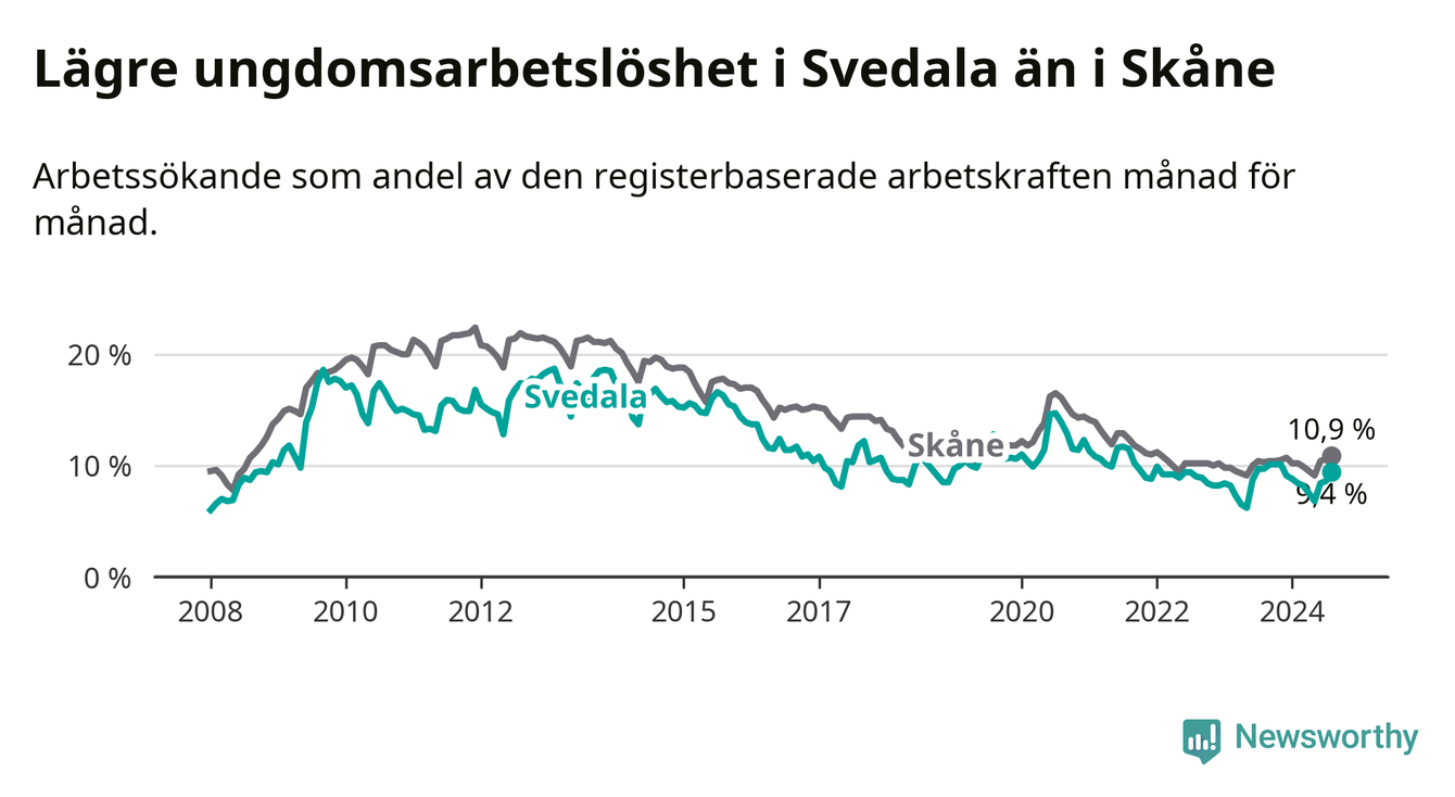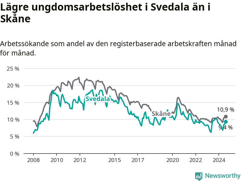 Precis som den totala arbetslösheten ligger ungdomsarbetslösheten i Svedala lägre än i Skåne som helhet. Skillnaden mellan kommunen och länet är 1,5 procentenheter.