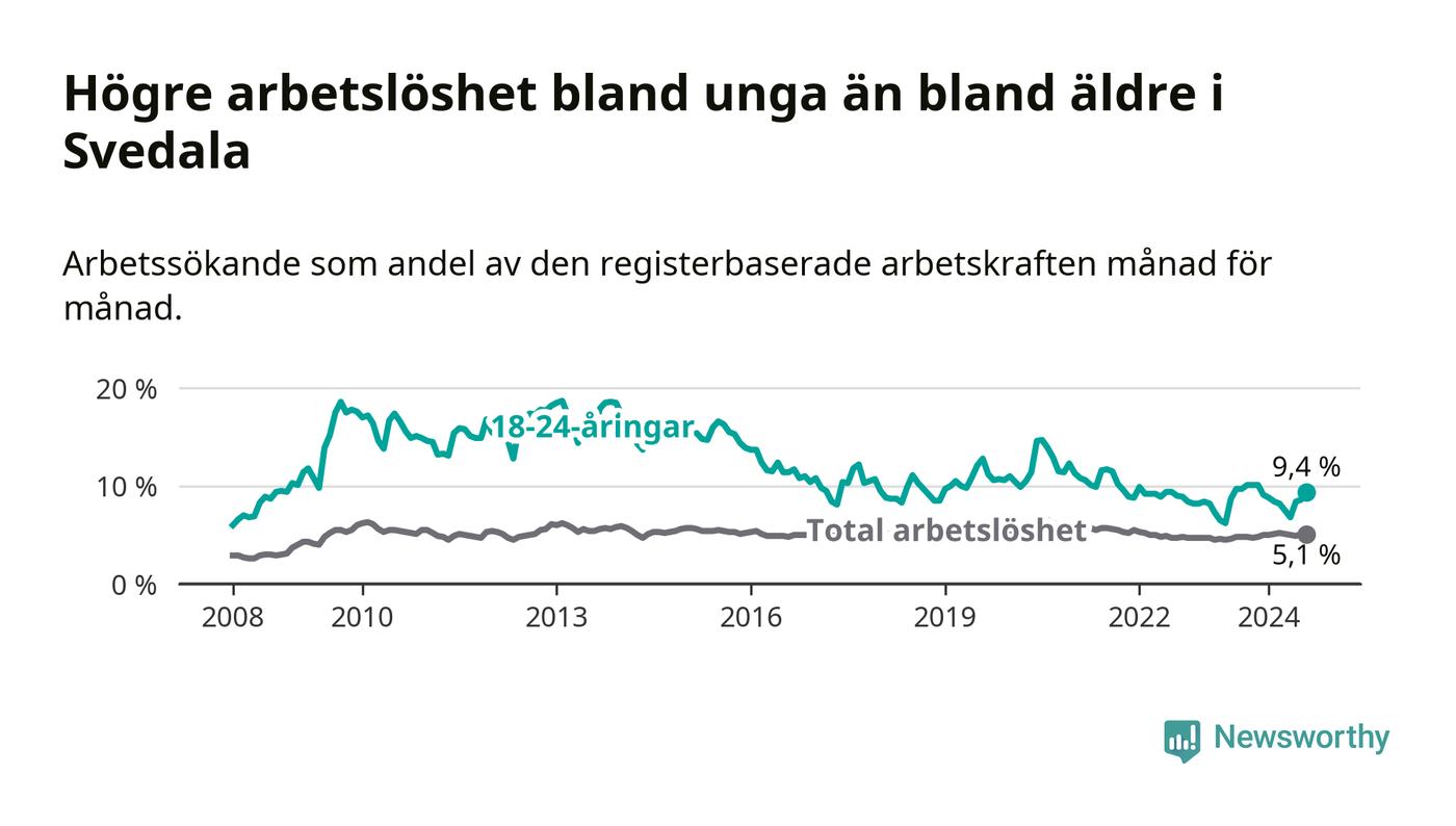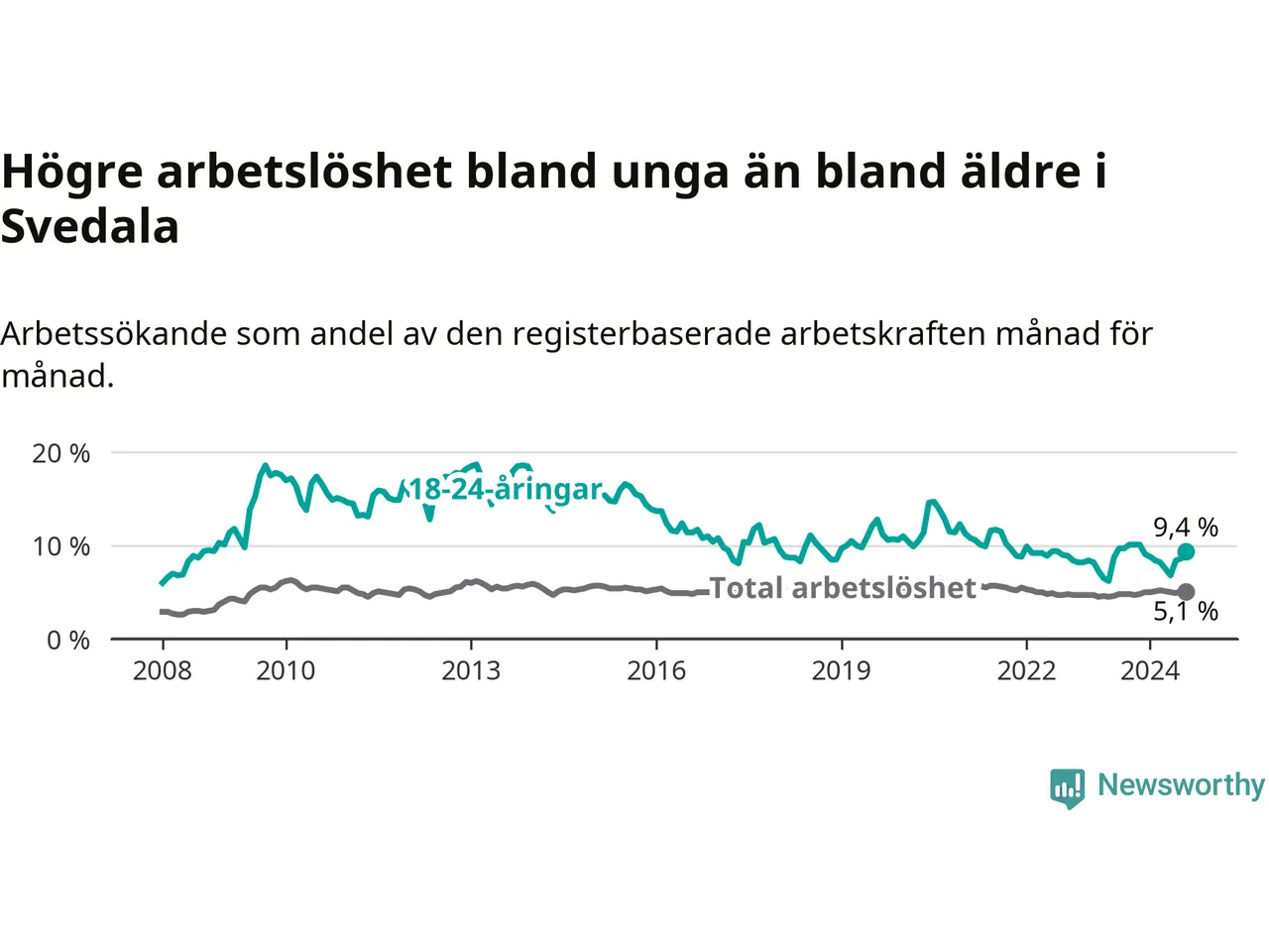 Under augusti månad rapporterade Svedala kommun en total arbetslöshet på 5,1 procent. Det är en ökning jämfört med samma tidpunkt i fjol (+0,3 procentenheter). Även i Skåne län stiger arbetslösheten .