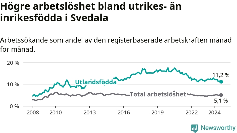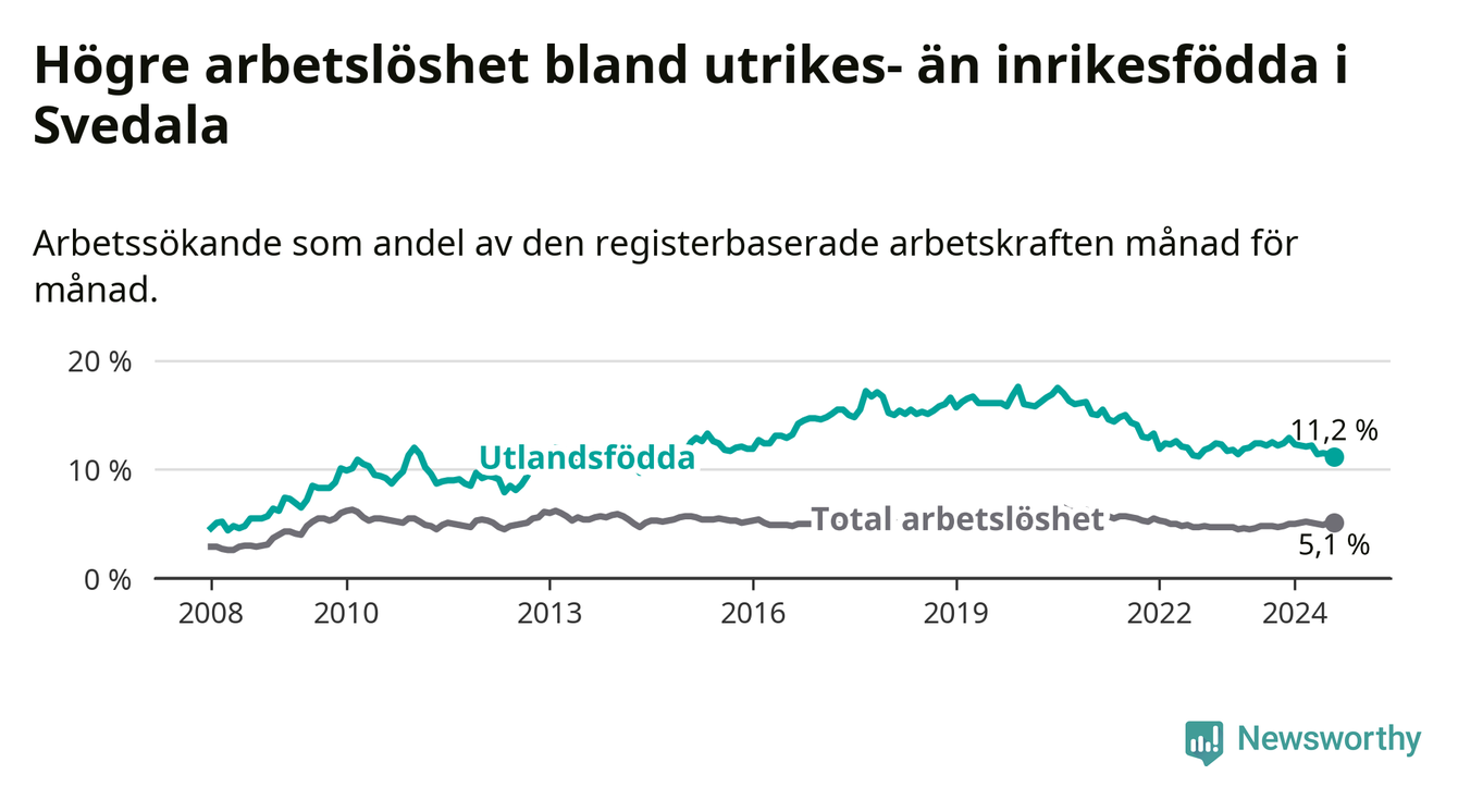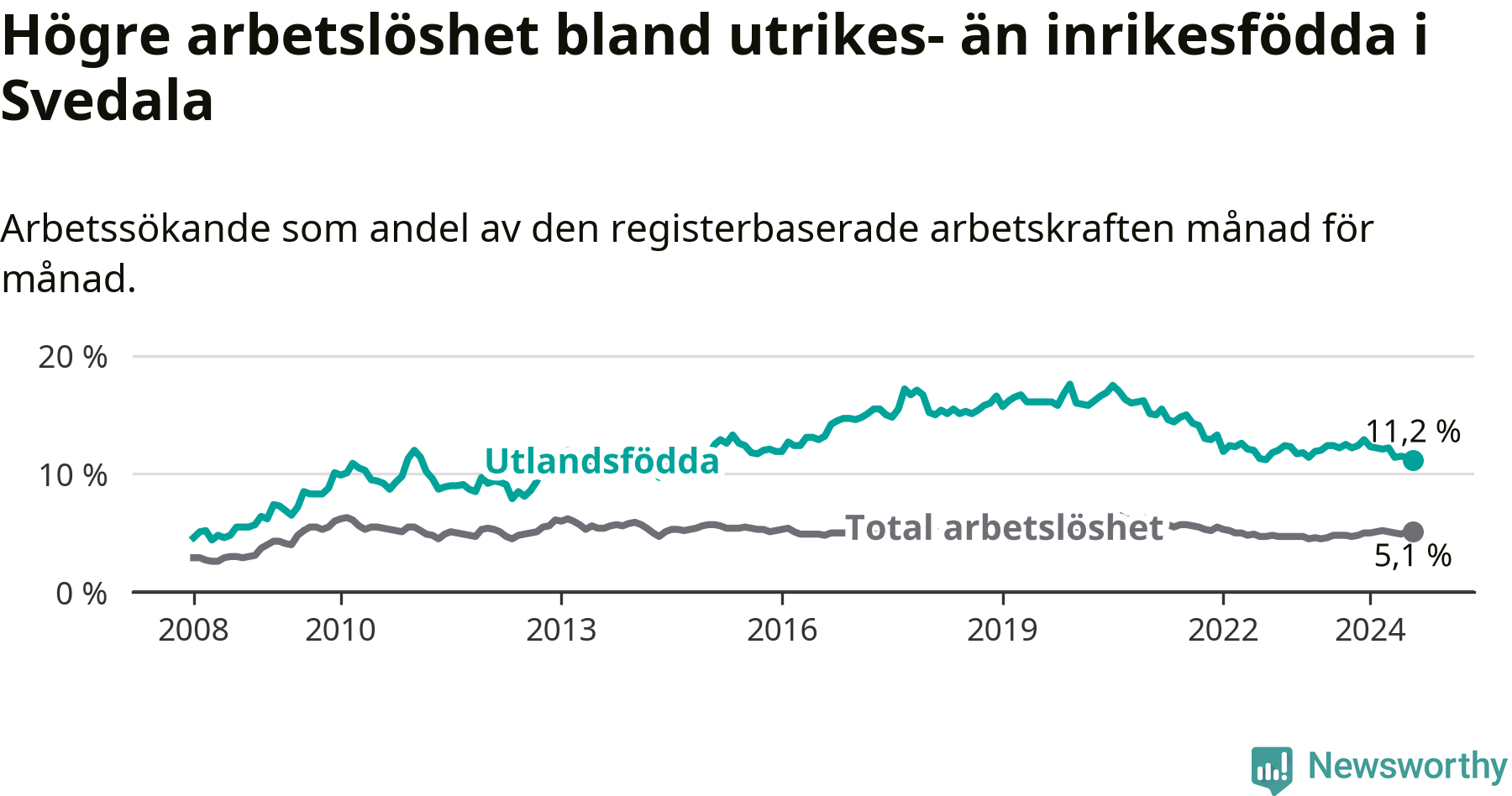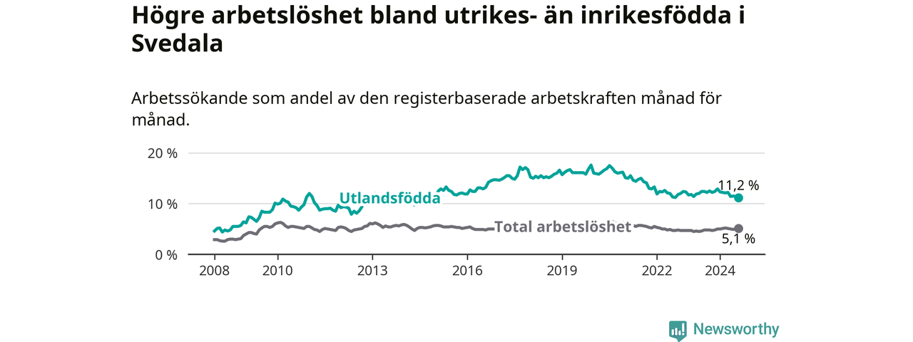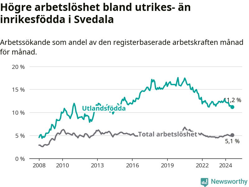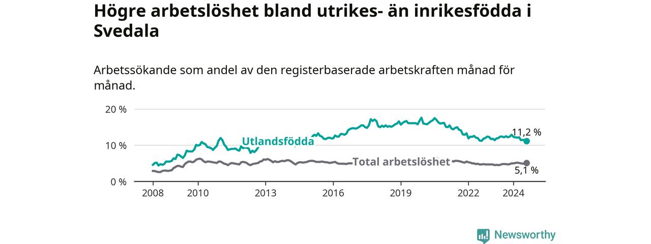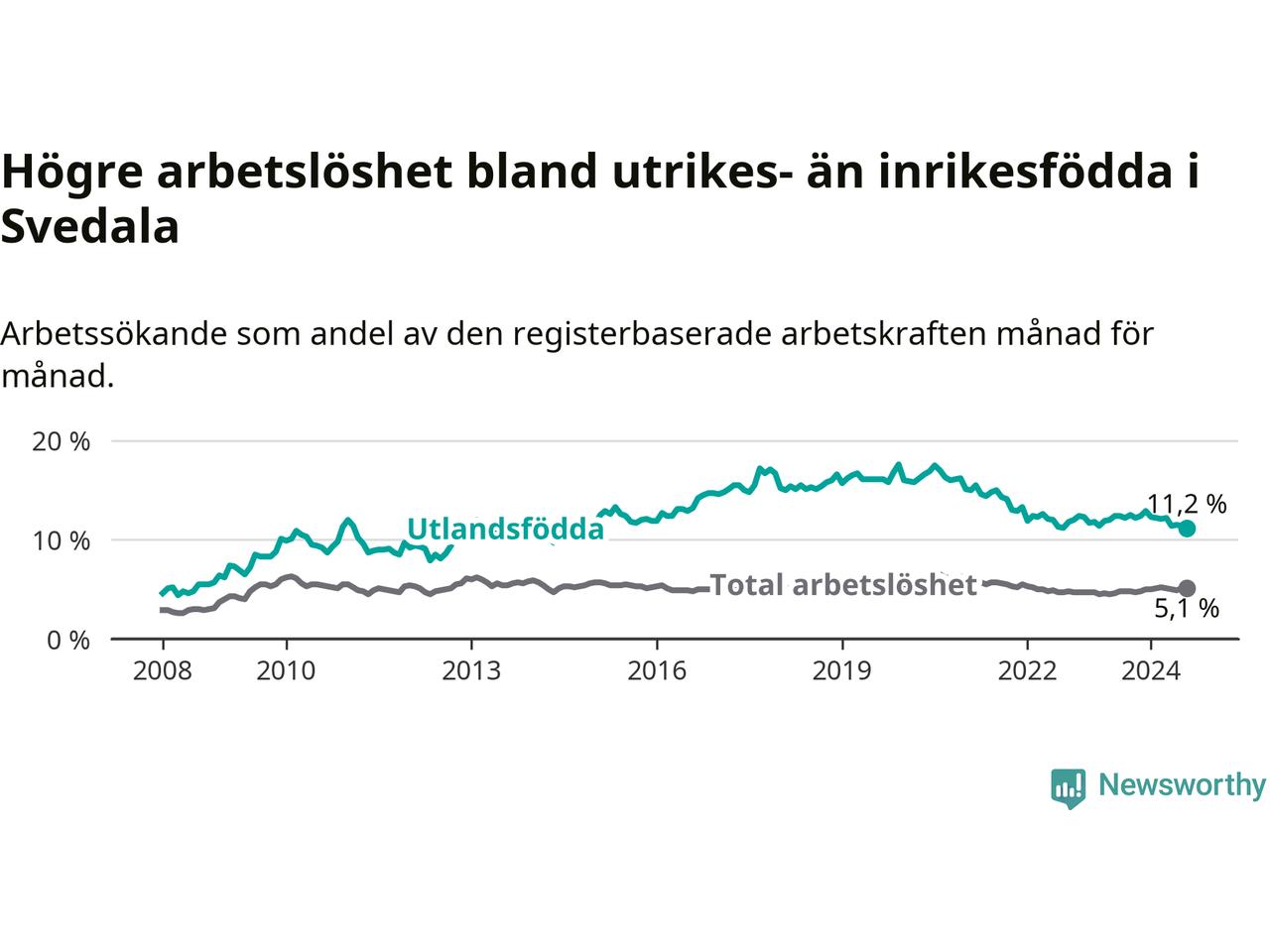 Arbetslösheten bland utlandsfödda var 11,2 procent i Svedala under augusti månad, motsvarande 210 av 1 875 personer. Det är 1,0 procentenheter färre än vid samma tidpunkt i fjol (−2 om man räknar personer).