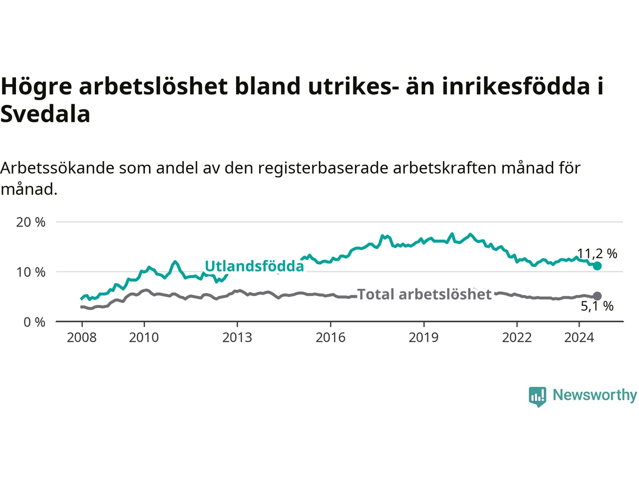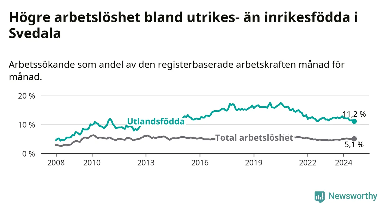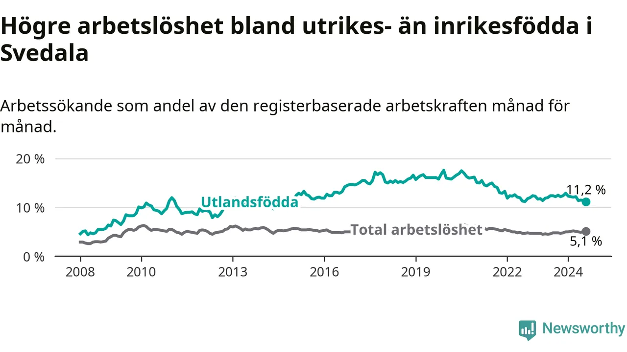Skillnaden i arbetslöshet mellan utrikesfödda och hela befolkningen är 6,1 procentenheter i Svedala. Det är en mindre skillnad än för ett år sedan (−1,3 procentenheter).
