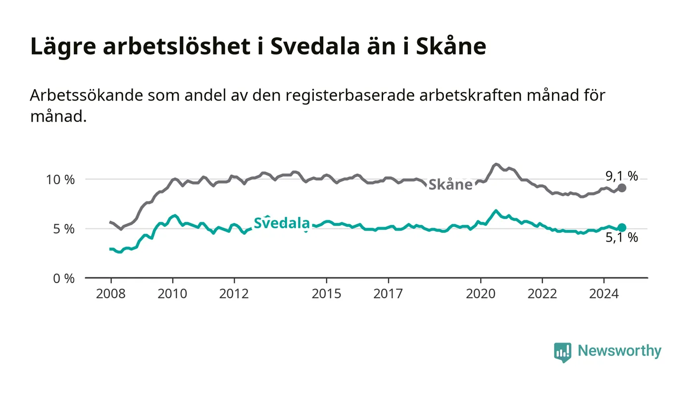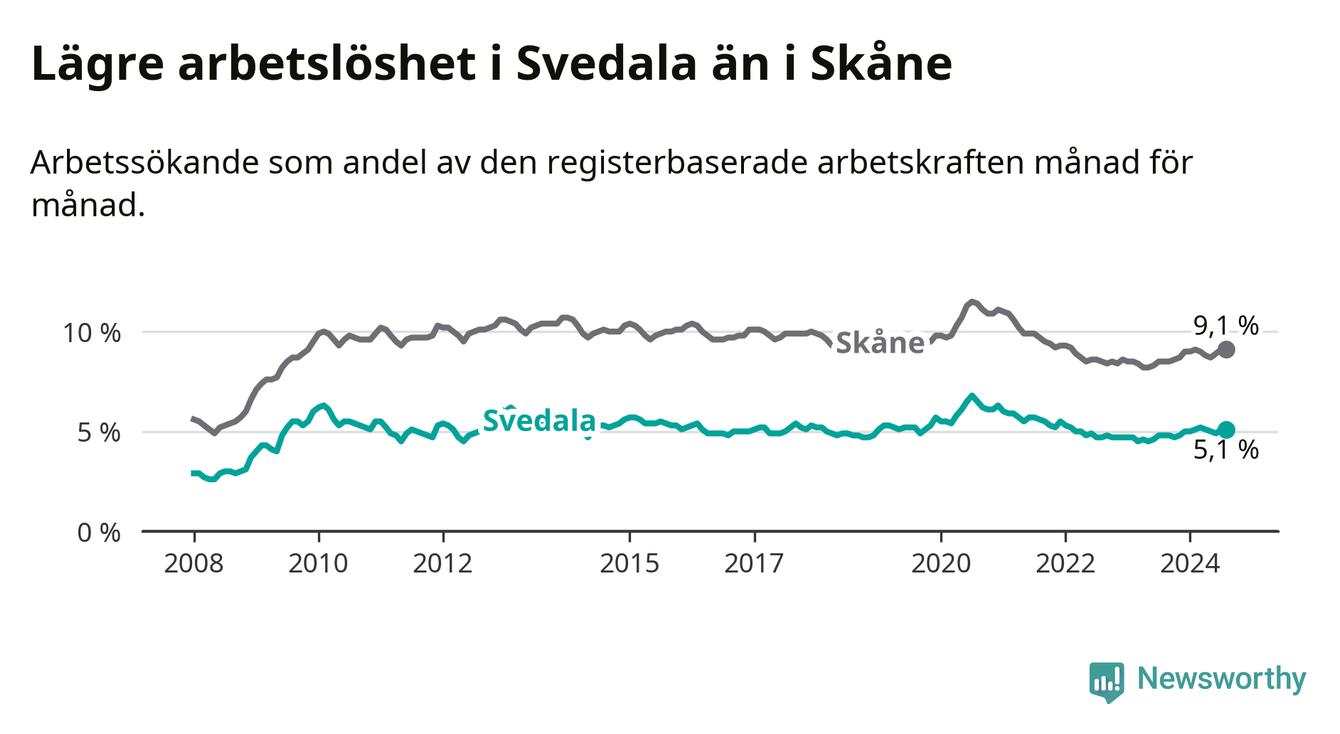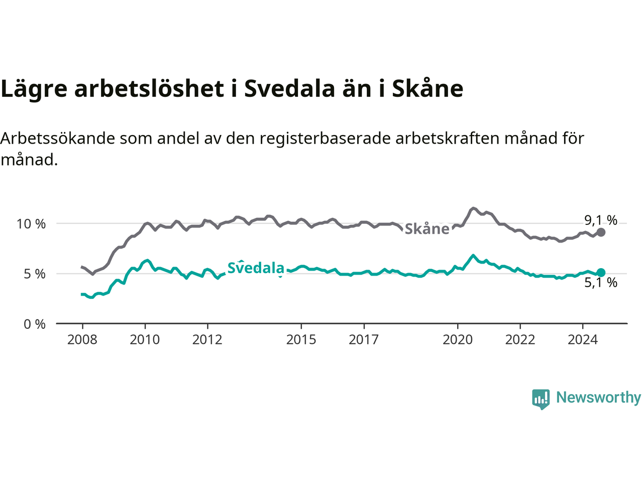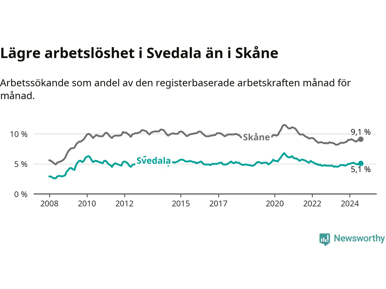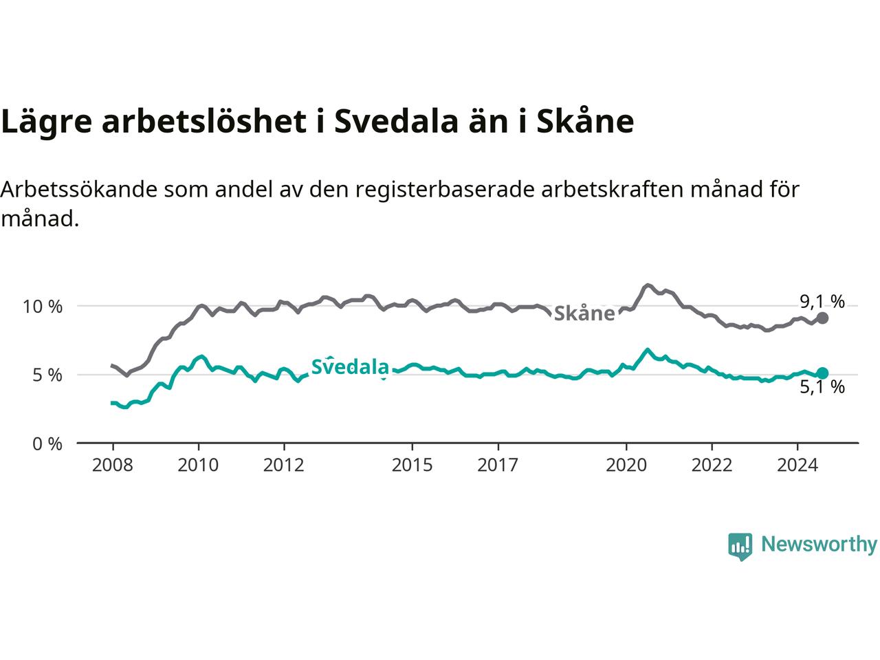 Även om arbetslösheten i Svedala alltså ökar, så ligger den fortfarande under snittet i hela Skåne län (5,1 procent i kommunen, jämfört med 9,1 procent i hela länet). Lomma har den lägsta arbetslösheten i länet (3,8 procent), medan Perstorp har den högsta (13,9 procent). För att Svedala skulle komma ner i samma arbetslöshetsnivå som Lomma skulle 153 personer behöva sysselsättas.