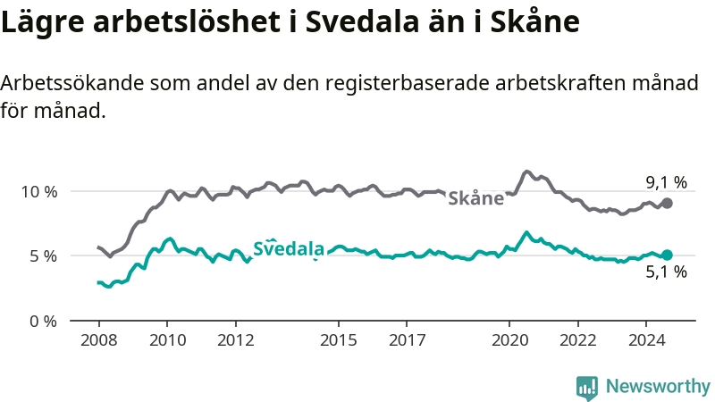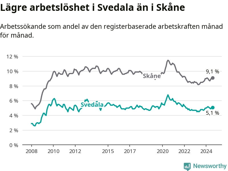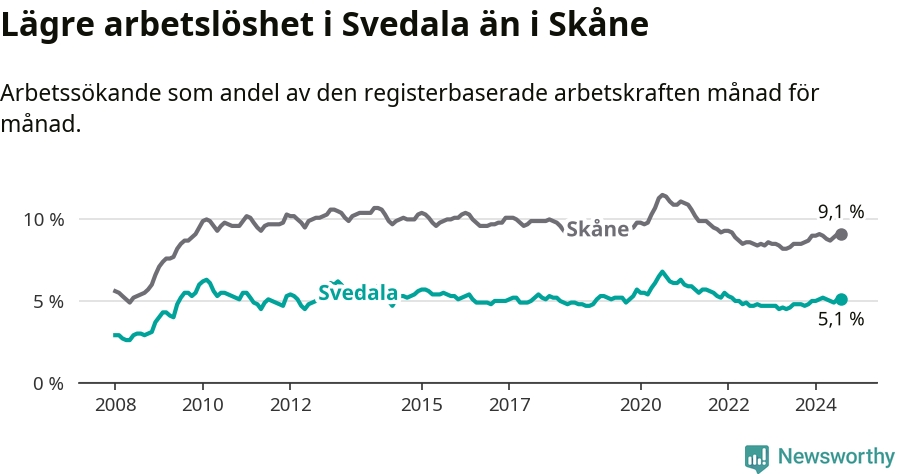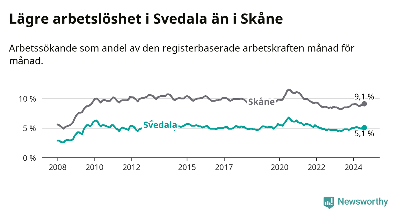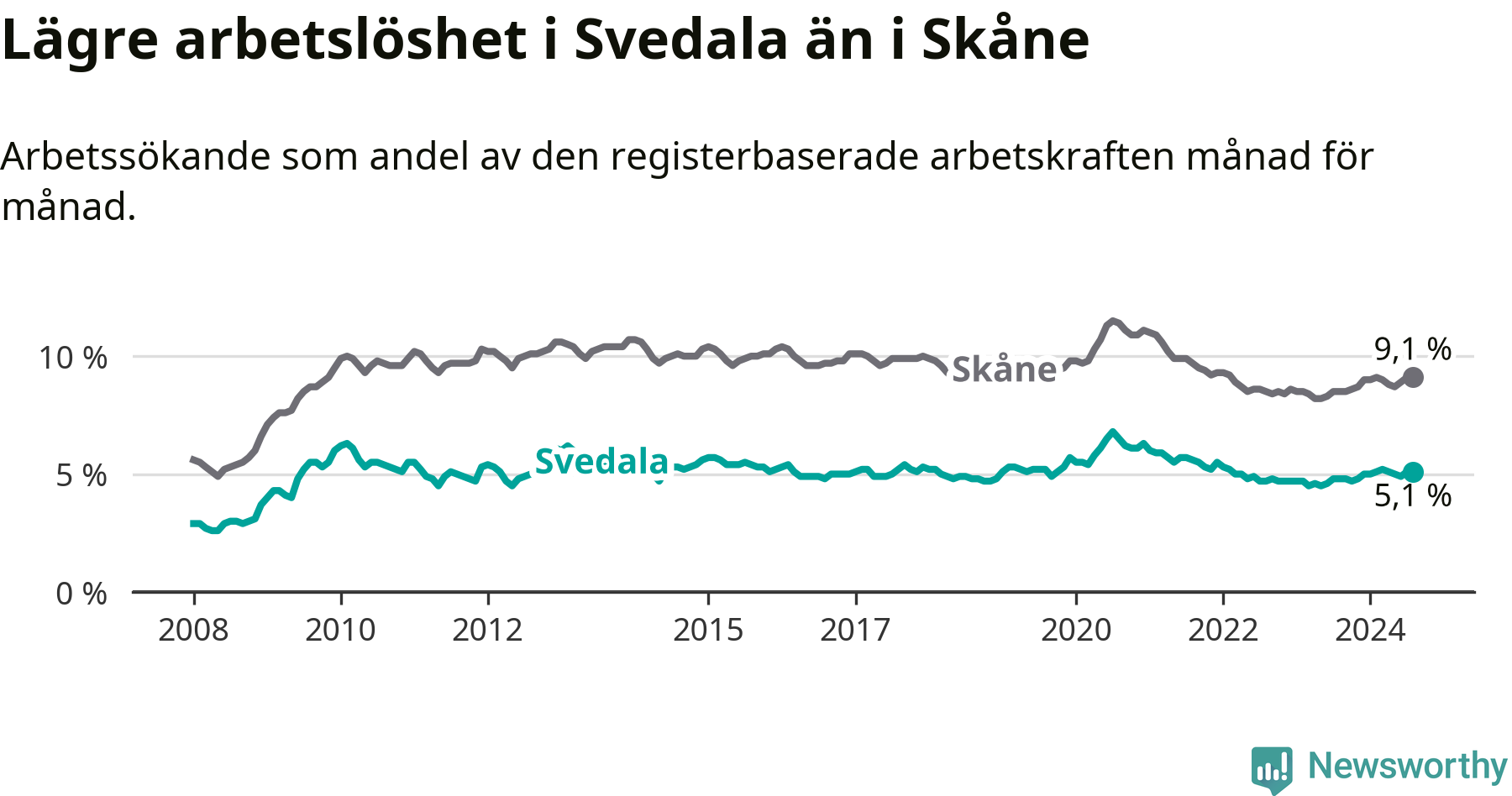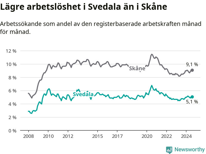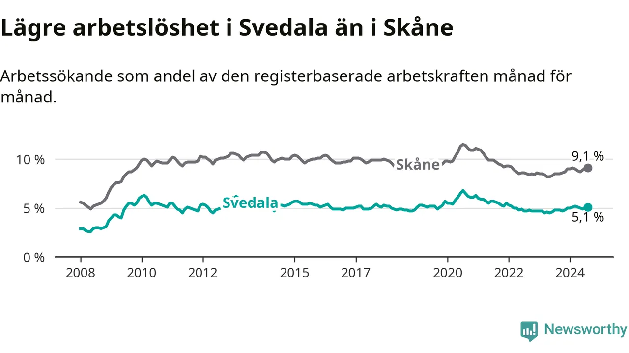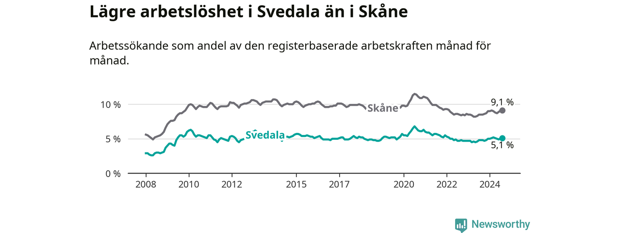 Även om arbetslösheten i Svedala alltså ökar, så ligger den fortfarande under snittet i hela Skåne län (5,1 procent i kommunen, jämfört med 9,1 procent i hela länet). Lomma har den lägsta arbetslösheten i länet (3,8 procent), medan Perstorp har den högsta (13,9 procent). För att Svedala skulle komma ner i samma arbetslöshetsnivå som Lomma skulle 153 personer behöva sysselsättas.