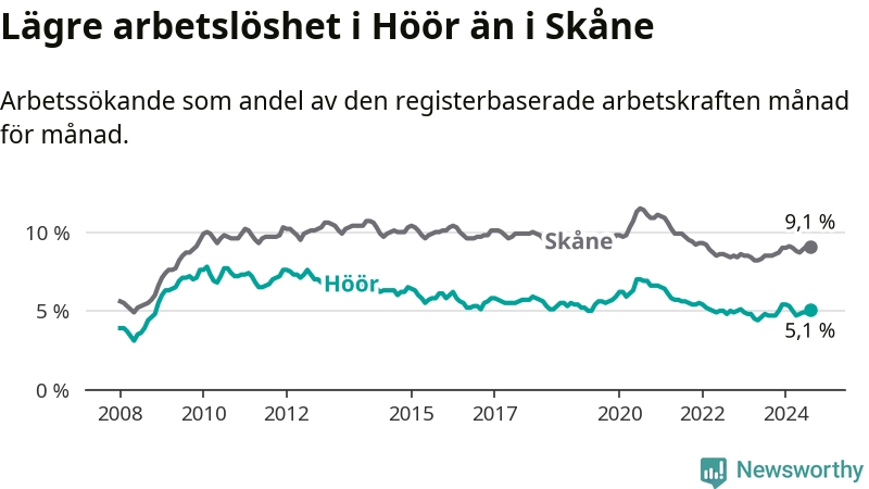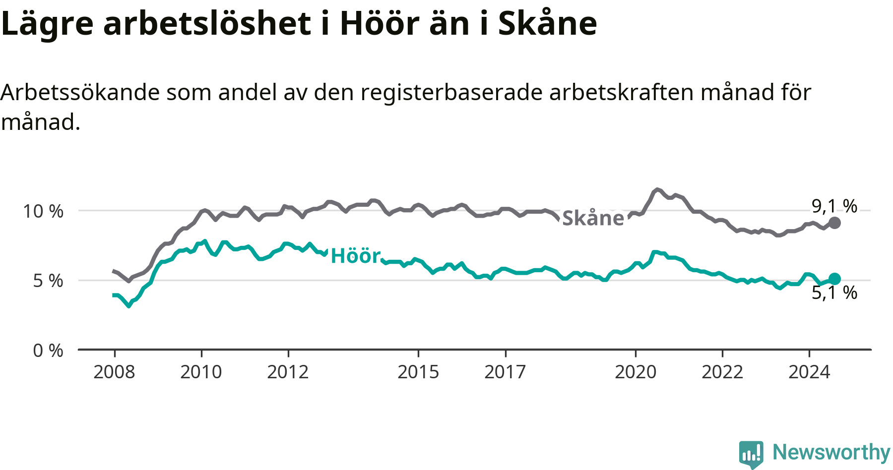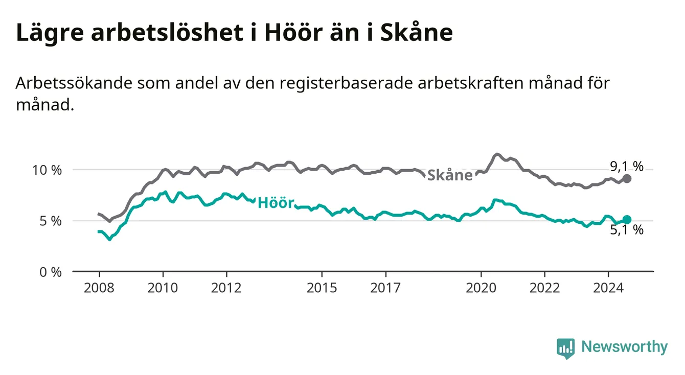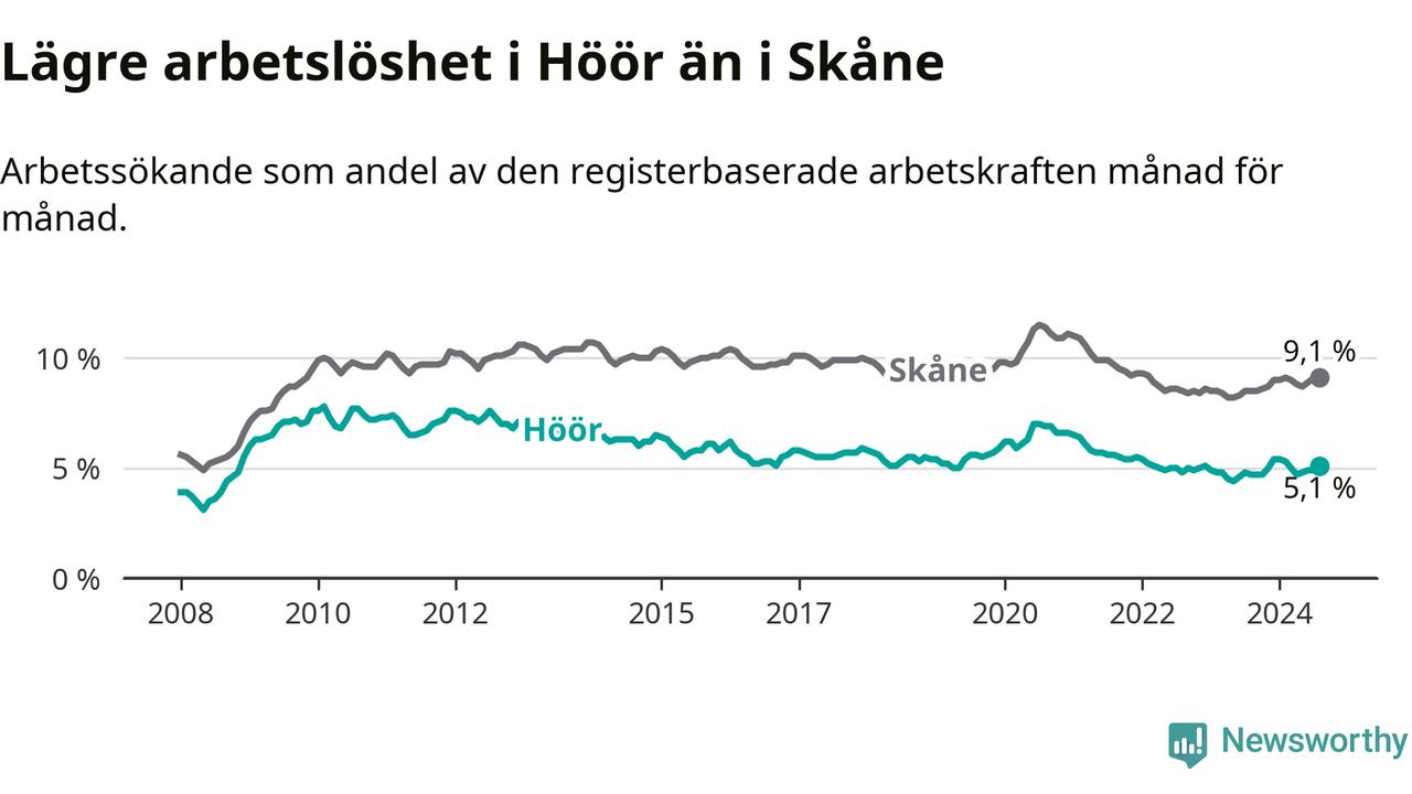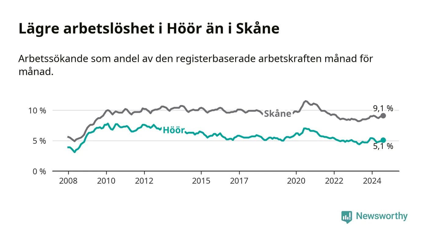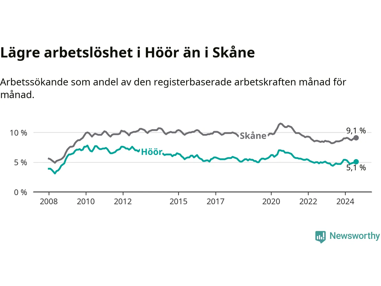Även om arbetslösheten i Höör alltså ökar, så ligger den fortfarande under snittet i hela Skåne län (5,1 procent i kommunen, jämfört med 9,1 procent i hela länet). Lomma har den lägsta arbetslösheten i länet (3,8 procent), medan Perstorp har den högsta (13,9 procent). För att Höör skulle komma ner i samma arbetslöshetsnivå som Lomma skulle 109 personer behöva sysselsättas.