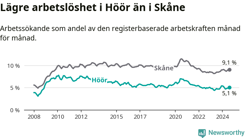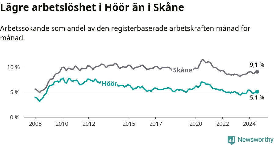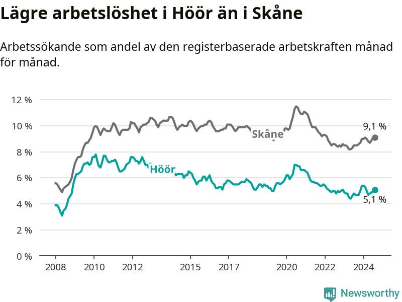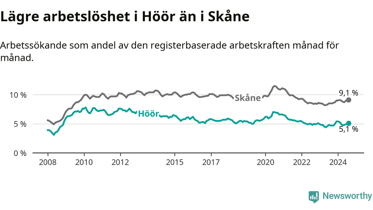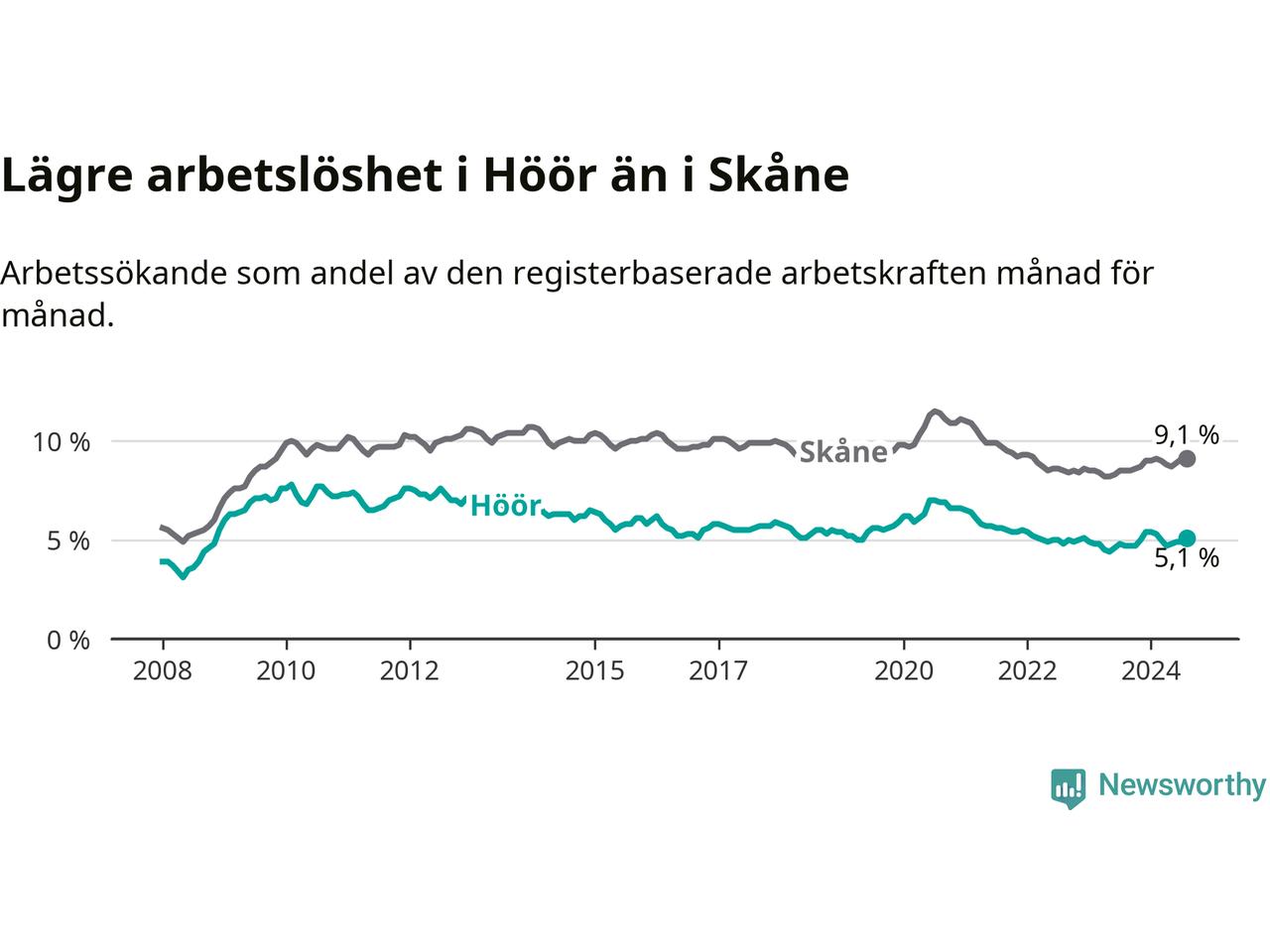 Under augusti månad rapporterade Höörs kommun en total arbetslöshet på 5,1 procent. Det är en ökning jämfört med samma tidpunkt i fjol (+0,4 procentenheter). Även i Skåne län stiger arbetslösheten .
